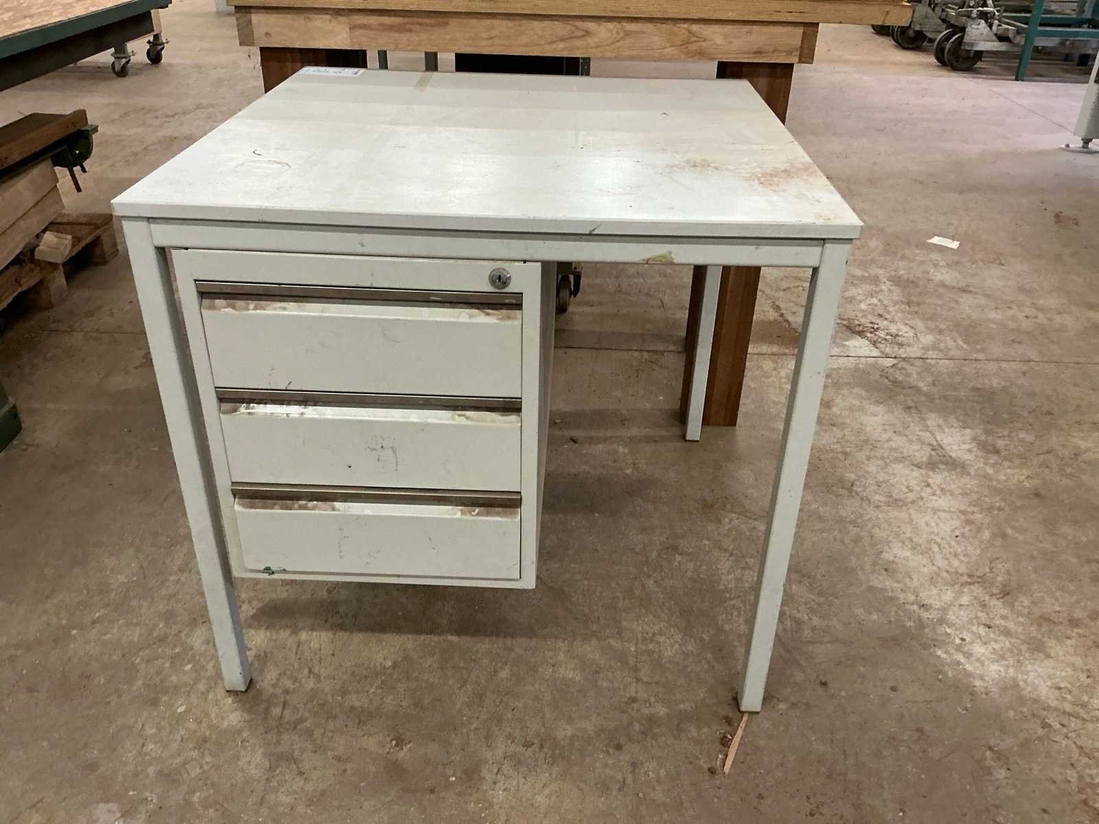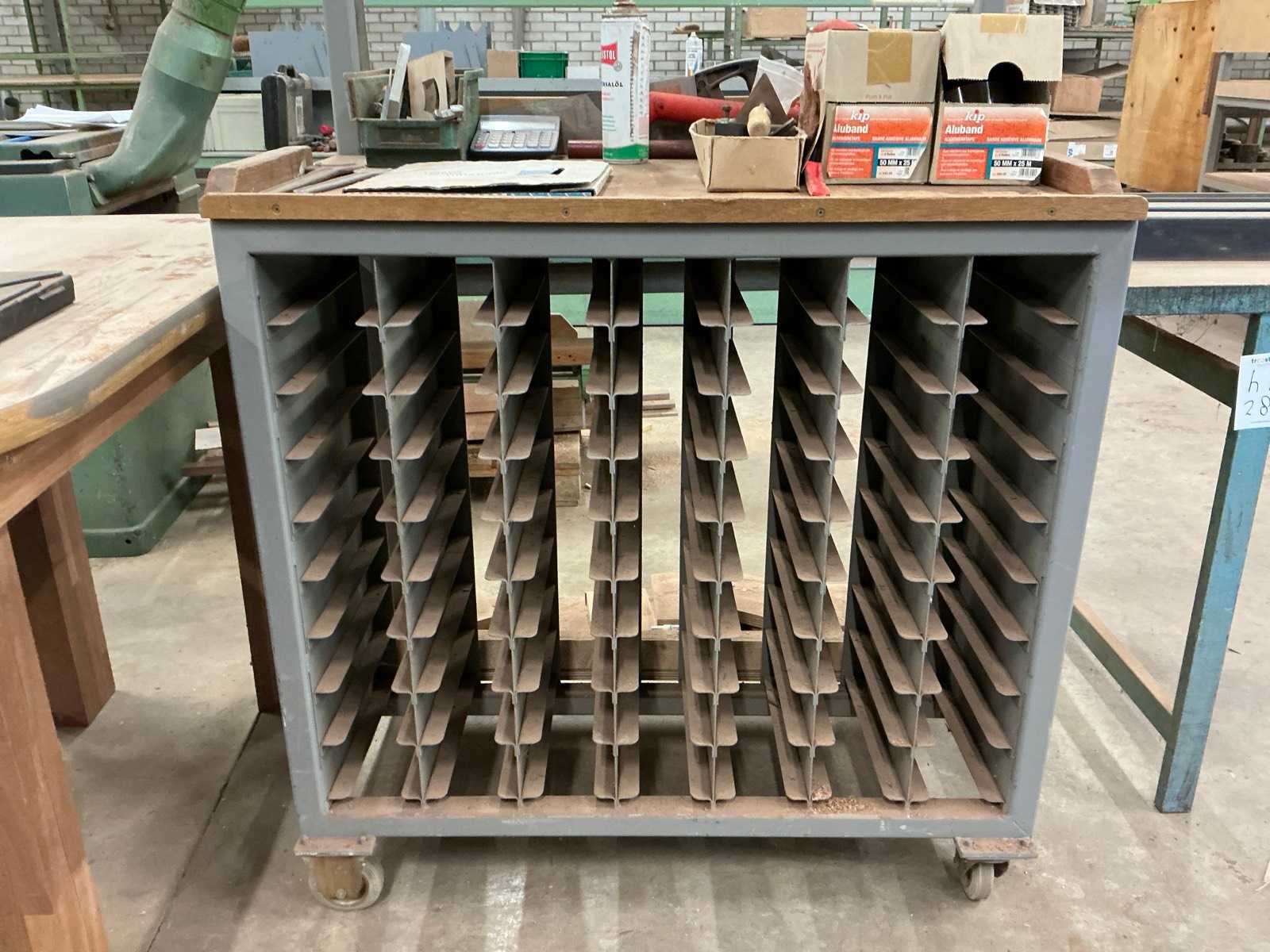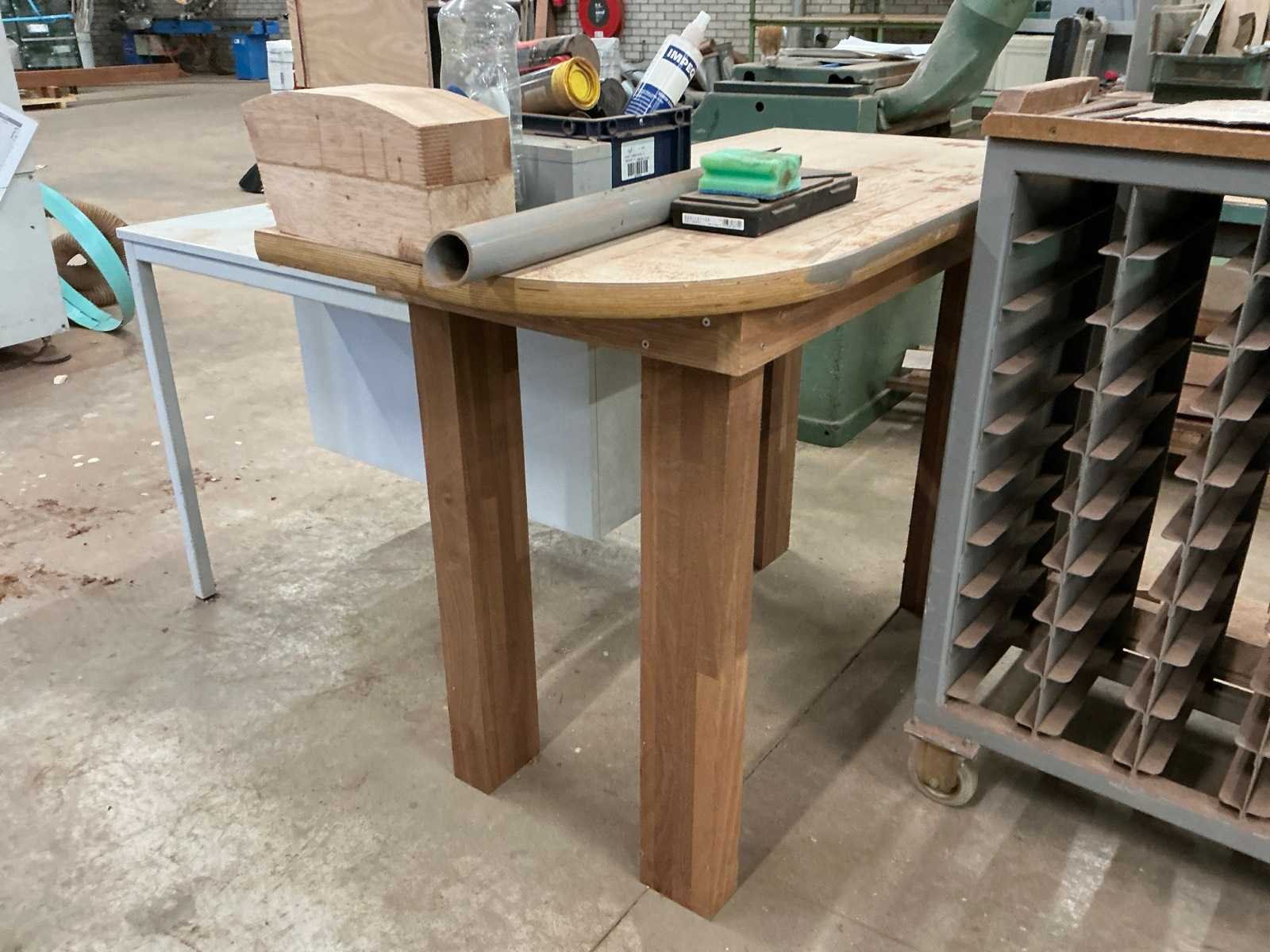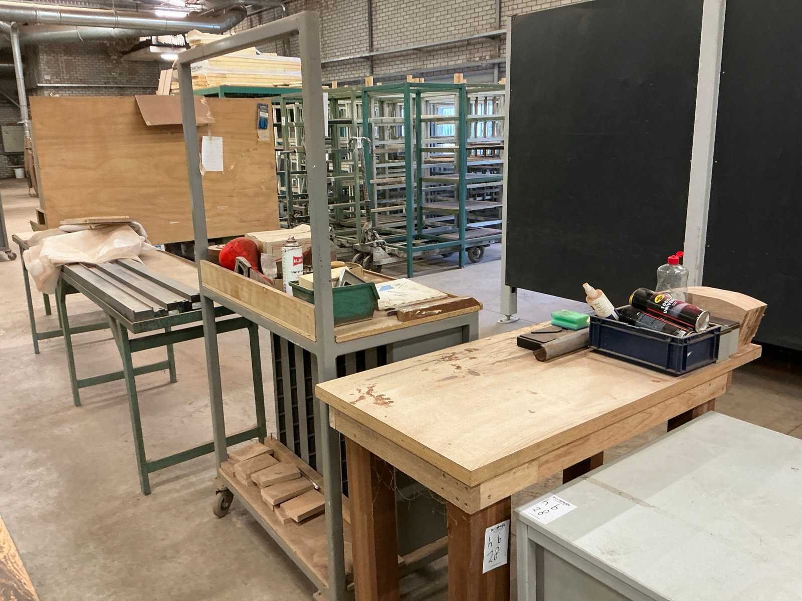 Werkbank (304x61x85cm), sorteerkast ( 100x59x181cm), tafel (120x60x88cm), bureau (80x80x75cm), inclusief inhoud