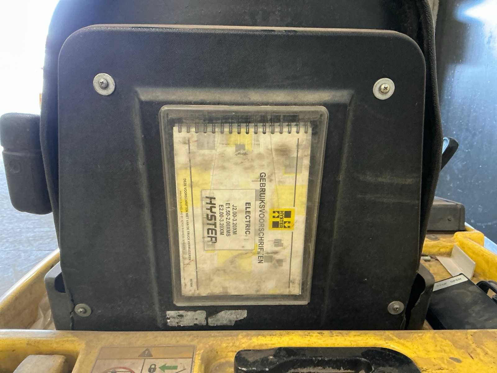 Met lader; defect Merk: HYSTER Type: E1.75XM Bouwjaar: 2002 Serienummer: D114A04534Z Mast: Triple Soort band: Volrubber banden Aantal wielen: 4 Accu lader: true Hydraulisch verstelbare lepels: true Triple mast: true Eigen gewicht: 3740kg Hefvermogen: 1400kg Lepellengte: 1100mm Minimale doorrijhoogte: 2200mm Totale afmeting L: 3100mm Totale afmeting Breedte: 970mm Totale afmeting Hoogte: 2200mm