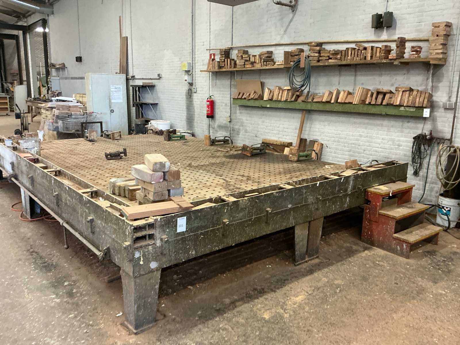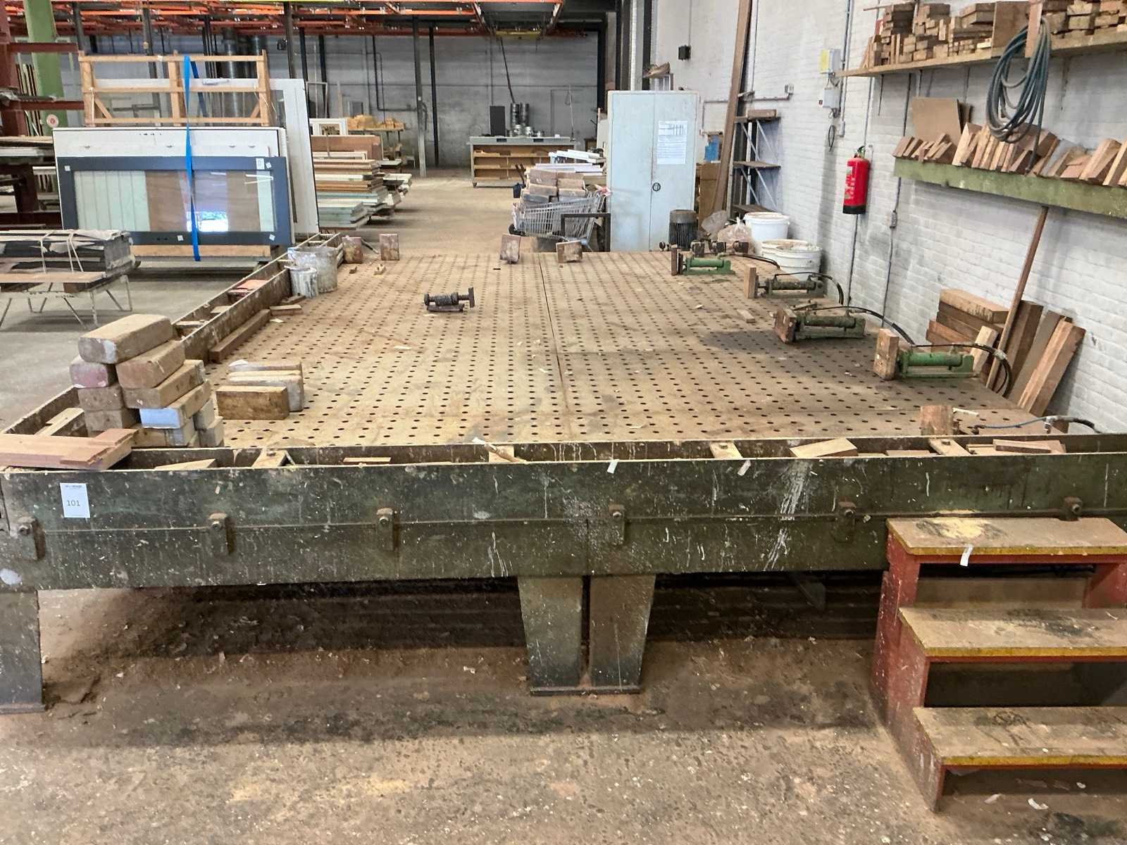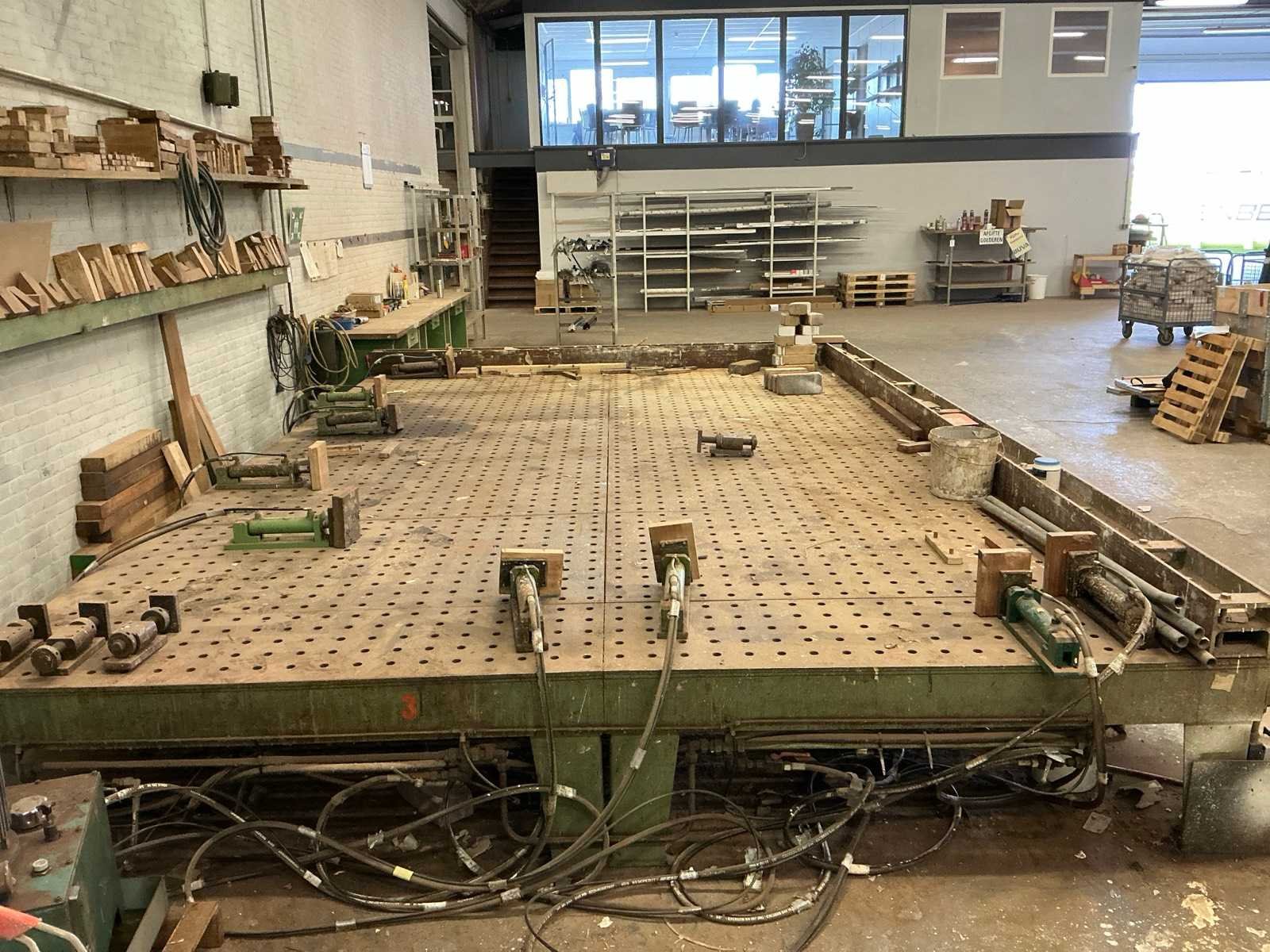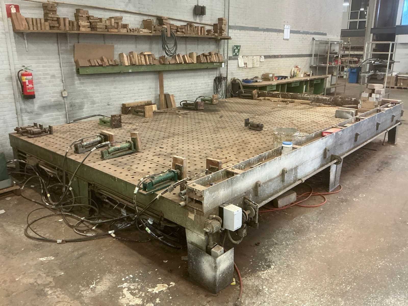 Werktafel afmeting maximaal (307x496x18cm), Hydraulisch pomp, Pneumatische pers, Opspan toebehoren, Diverse deuvels, Werkbank (425x72x85), legbordstelling met inhoud, kast met inhoud, partij houten blokken en hulpstukken Merk: Horizontale Horizontaal: true Afmeting l: 3680mm Afmeting b: 5550mm Afmeting h: 800mm Aantal hydraulische perscilinders: 9 Met hydroliek pomp: true Aansluiting: 380V