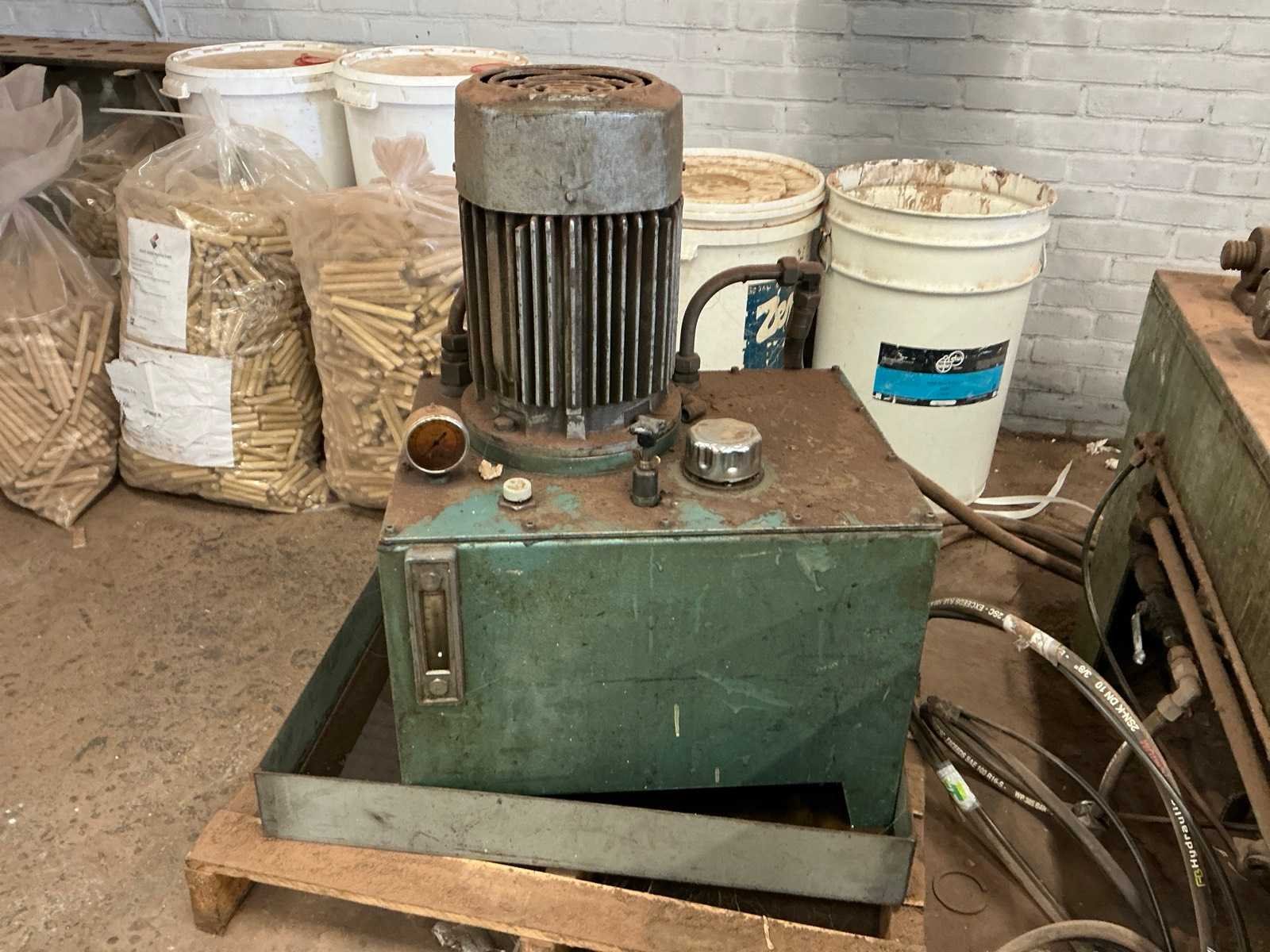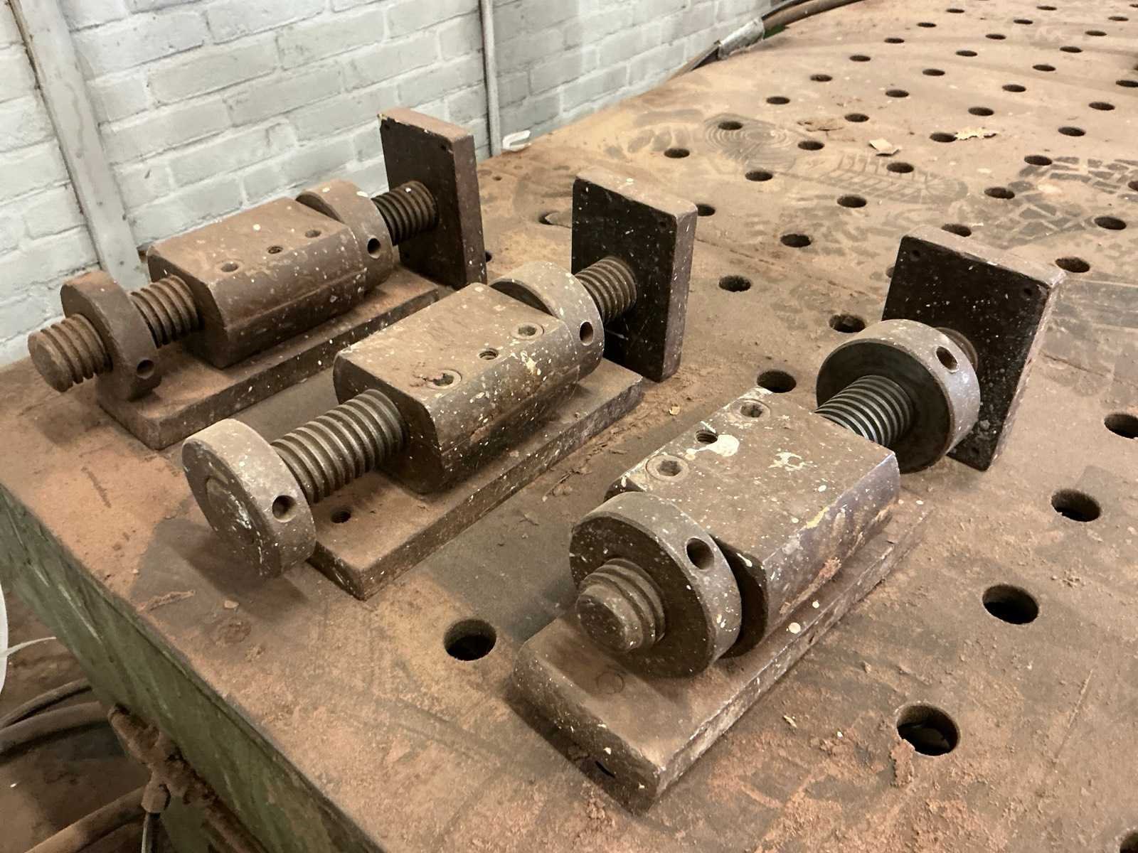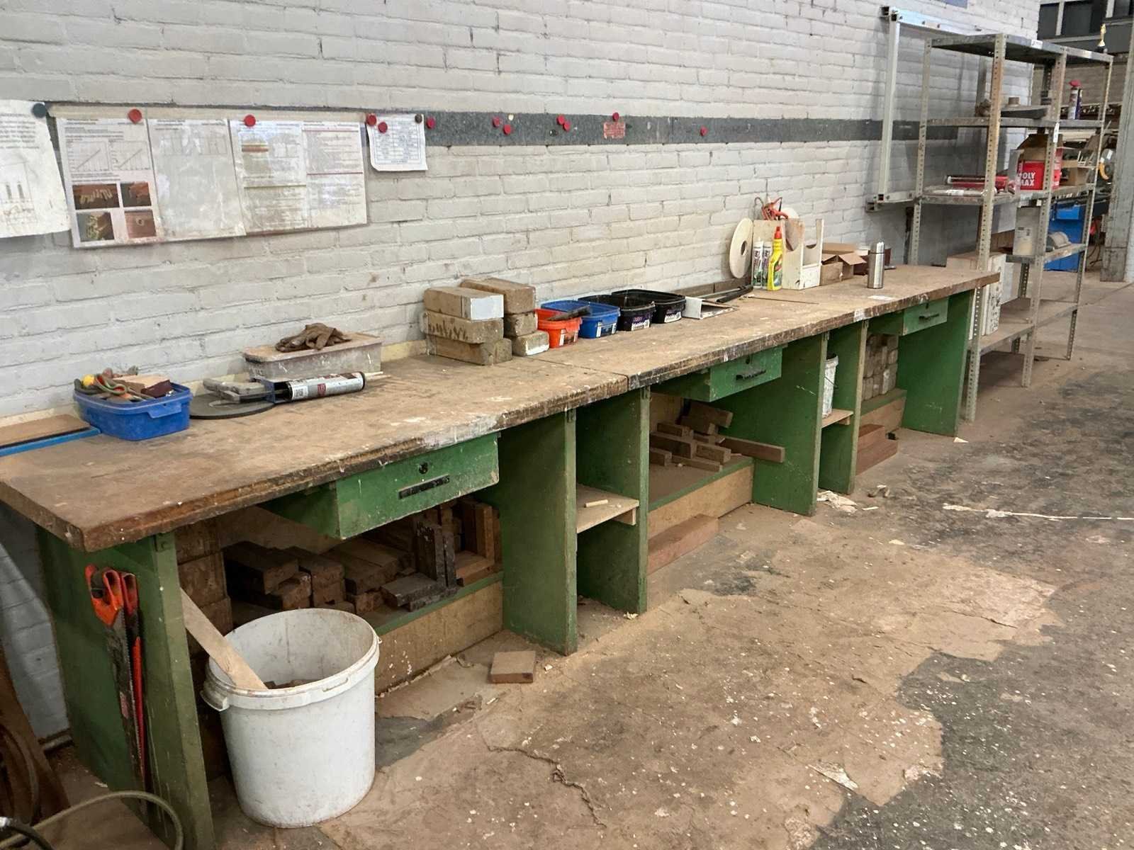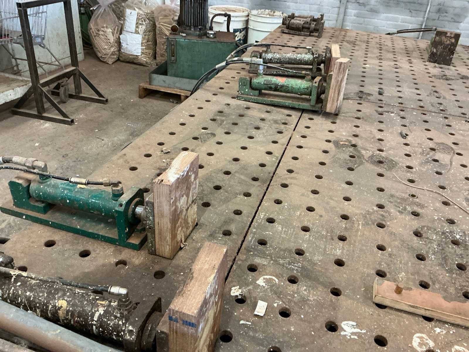 Werktafel afmeting maximaal (307x496x18cm), Hydraulisch pomp, Pneumatische pers, Opspan toebehoren, Diverse deuvels, Werkbank (425x72x85), legbordstelling met inhoud, kast met inhoud, partij houten blokken en hulpstukken Merk: Horizontale Horizontaal: true Afmeting l: 3680mm Afmeting b: 5550mm Afmeting h: 800mm Aantal hydraulische perscilinders: 9 Met hydroliek pomp: true Aansluiting: 380V
