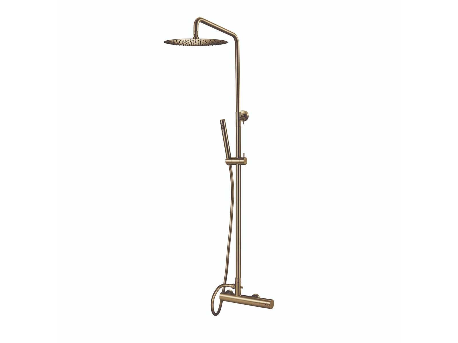 Ongebruikt in doos; Afwerking Light gold pvd; Montage Muur opbouw; 38 graden blok Ja; Aansluiting S-koppeling; Aantal sproeistanden 1; Bediening Thermostatisch; Hoogte product 1195; Omstelling in knop Ja; Type binnenwerk Thermostaat; Uitstroom volume 15.8; In hoogte verstelbaar; Met anti-twist doucheslang 1500 mm Merk: Qisani Model: Flow Product type: 25609.06 Kleur: Light Gold