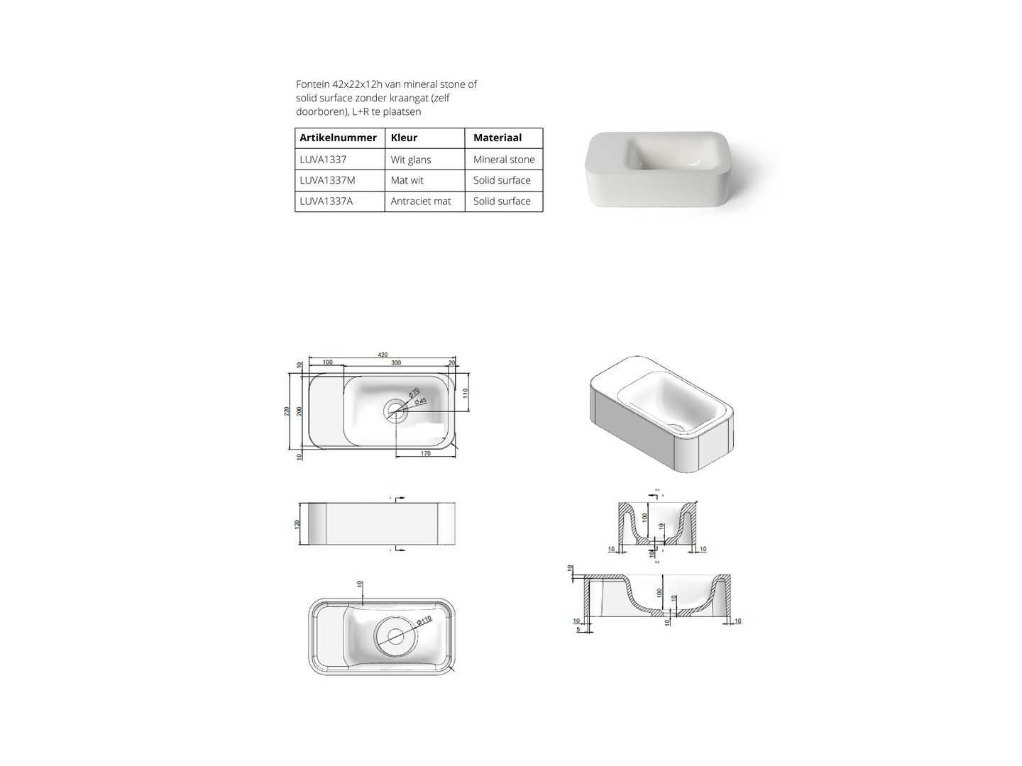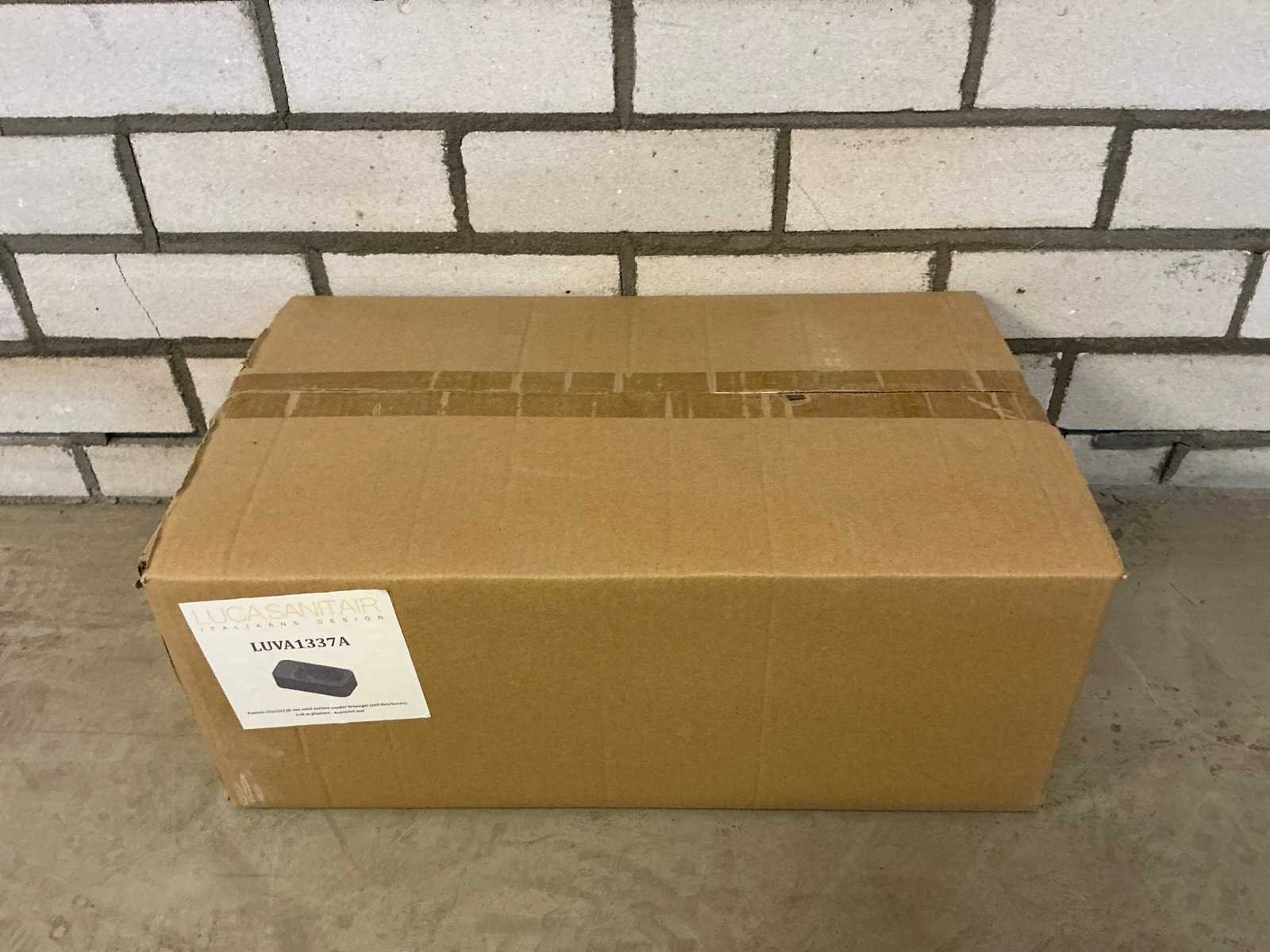 Ongebruikt in doos; Zonder kraangat zelf doorboren Merk: Luca sanitair Product type: LUVA1337A Kleur: Antraciet mat Lengte: 42cm Breedte: 22cm Hoogte: 12cm Materiaal: Solid surface