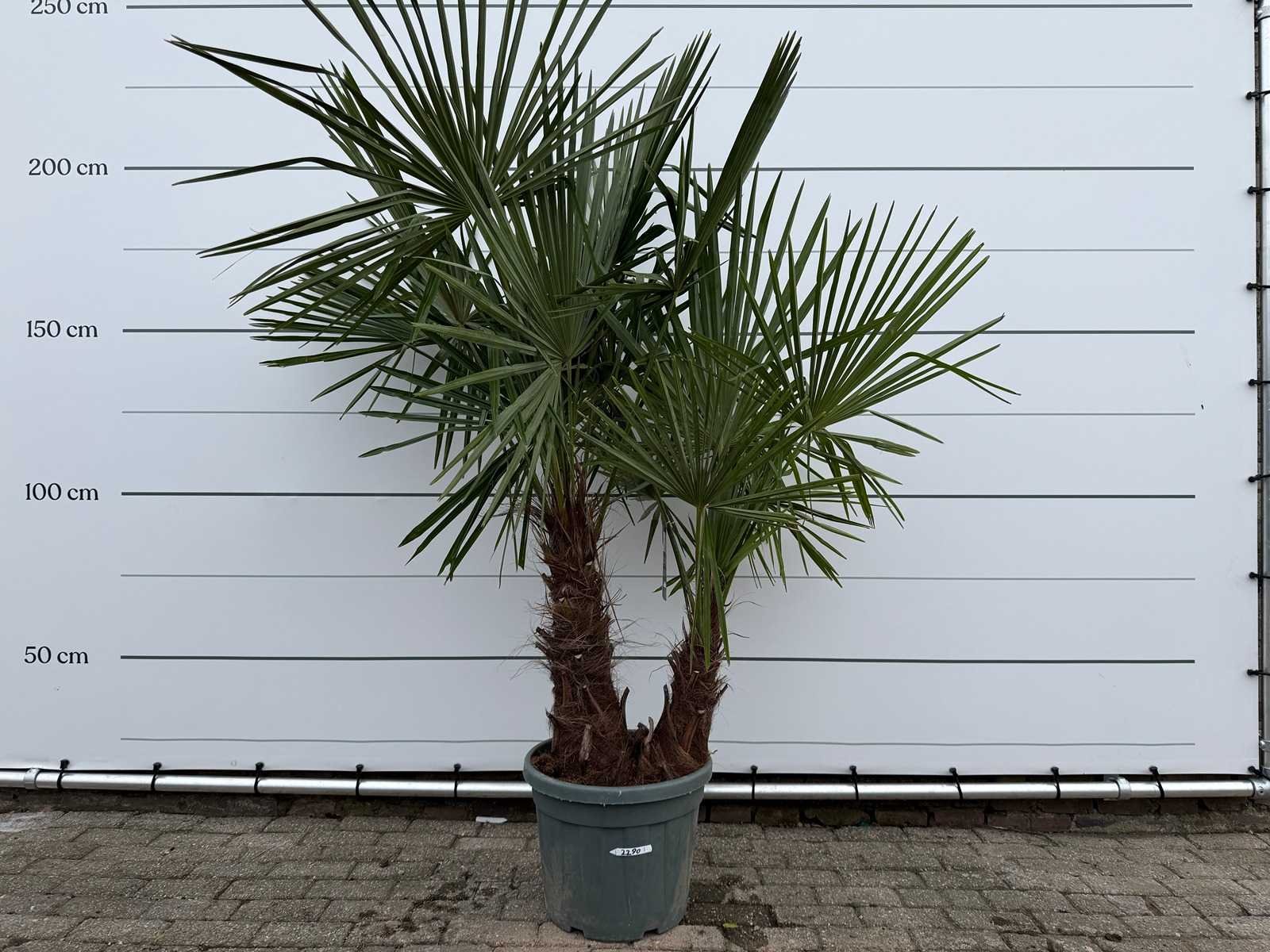 Type: Dubbele stam Latijnse benaming: Trachycarpus Fortunei Hoogte ca.: 220cm In pot: true Stamdikte: 8cm