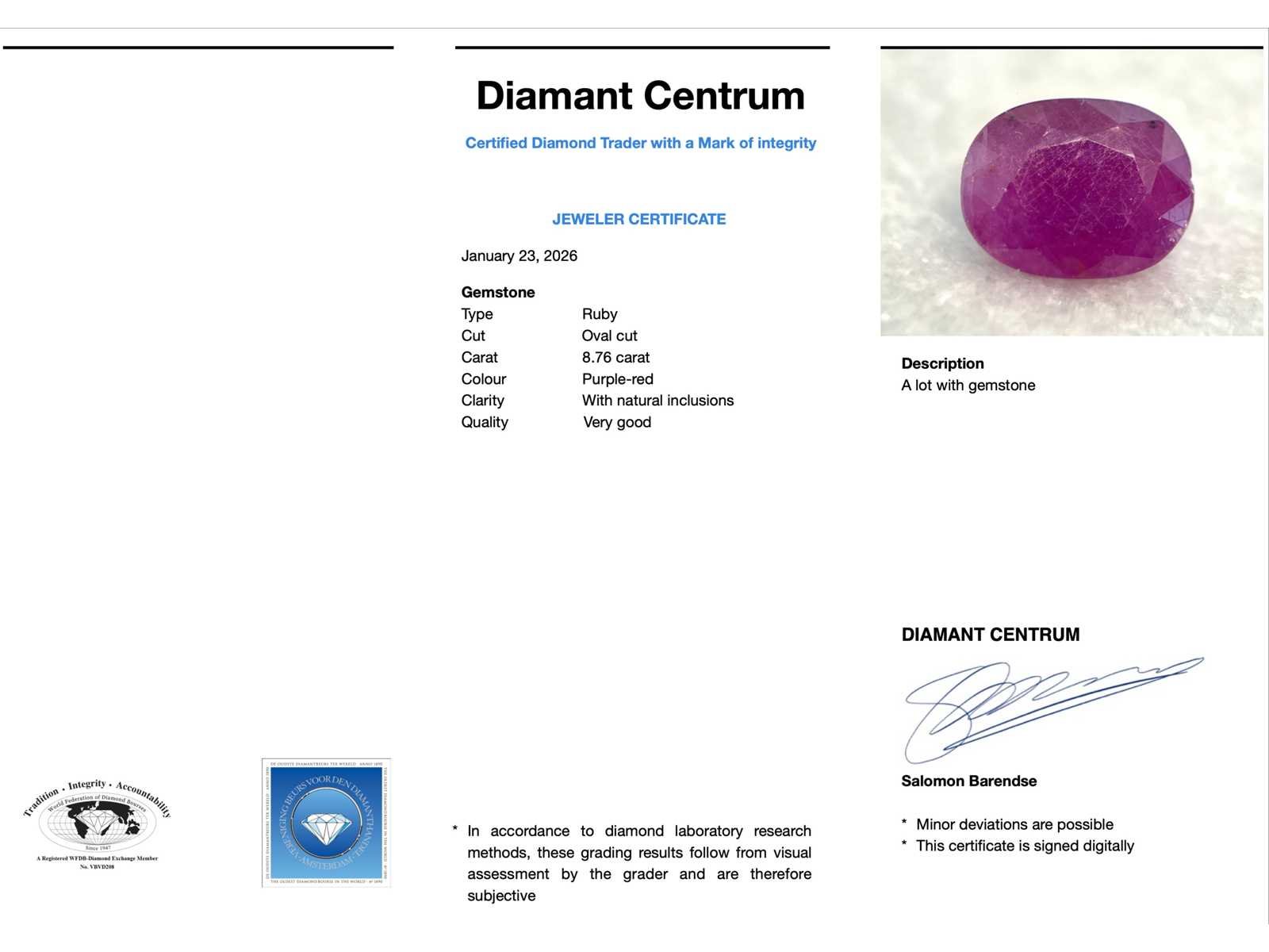 Samenvatting van gegevens Robijn - 8.76 carat natuurlijke robijn Edelsteen: Robijn; Aantal: 1 stuk; Slijpvorm: Ovaal geslepen; Gewicht (carat): 8.76 carat; Kleur: Paars-rood; Zuiverheid: Met natuurlijk insluitsels; Slijpkwaliteit: Heel mooi; Kwaliteit: Onbehandeld (niet verhit); Conditie: Nieuw; Verpakking: Edelsteendoos; Toelichting: De kwaliteit is overgenomen van het rapport behorend bij item. De waardebepaling is een beoordeling van een gecertificeerde diamantair, gebaseerd op consumentenprijzen.; Consumentenprijs: € 3.560,- Within 14 days Edelsteen: Robijn Kleur edelsteen: Paars-rood Slijpvorm edelsteen: Ovaal geslepen Slijpkwaliteit edelsteen: Heel mooi Zuiverheidsgraad edelsteen: Met natuurlijk insluitsels Lage schatting: 2848€ Hoge schatting: 3560€