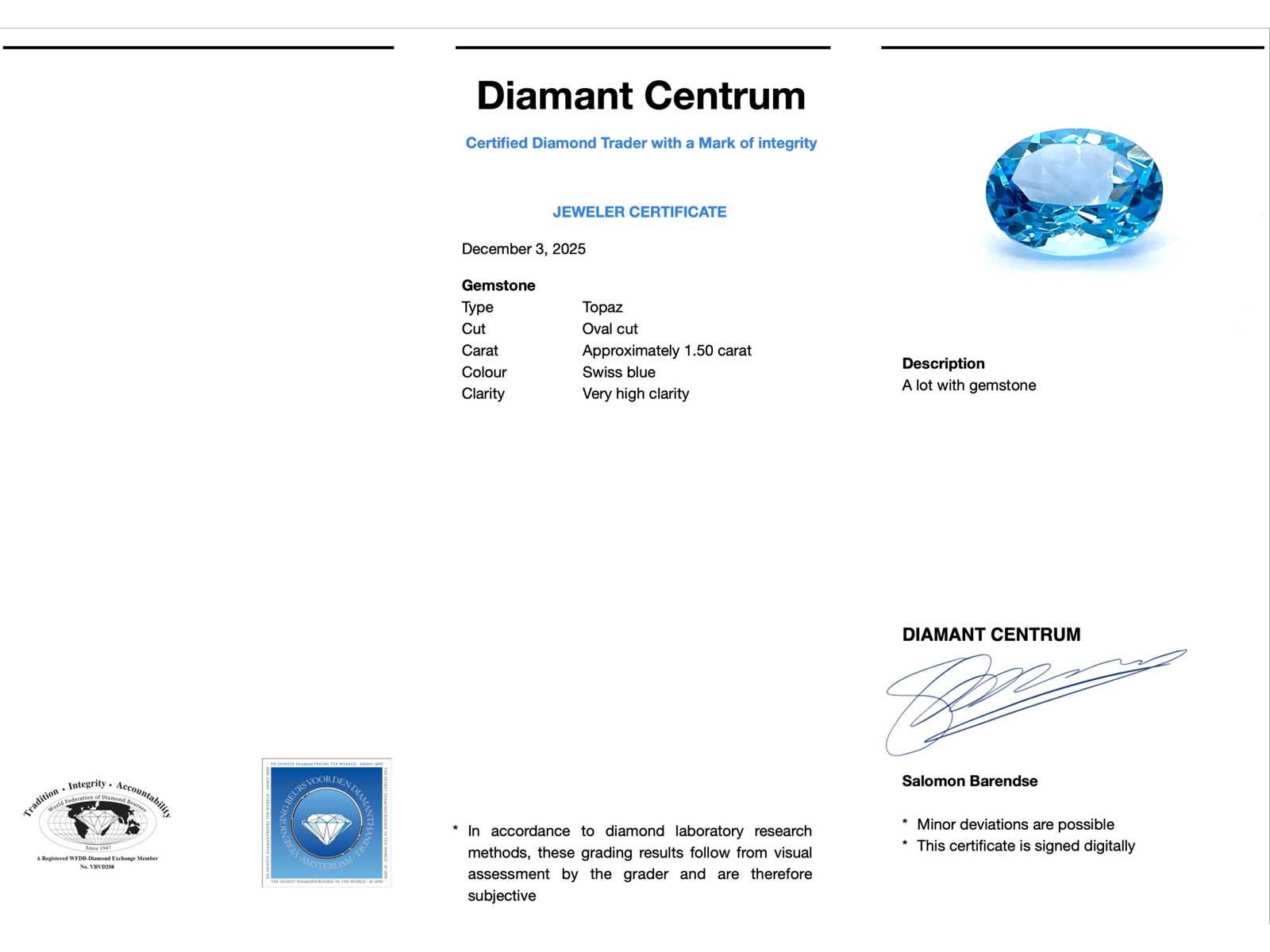 Samenvatting van gegevens Topaas - circa 1.50 carat swiss blue topaas Edelsteen: Topaas; Aantal: 1 stuk; Slijpvorm: Ovaal geslepen; Gewicht (carat): circa 1.50 carat; Kleur: Swiss blue; Zuiverheid: Zeer hoge zuiverheidsgraad; Conditie: Nieuw; Verpakking: Edelsteendoos; Toelichting: De waardebepaling is een beoordeling van een gecertificeerde diamantair, gebaseerd op consumentenprijzen.; Consumentenprijs: € 385,- Within 14 days Edelsteen: Topaas Kleur edelsteen: Swiss blue Slijpvorm edelsteen: Ovaal geslepen Zuiverheidsgraad edelsteen: Zeer hoge zuiverheidsgraad Lage schatting: 308€ Hoge schatting: 385€