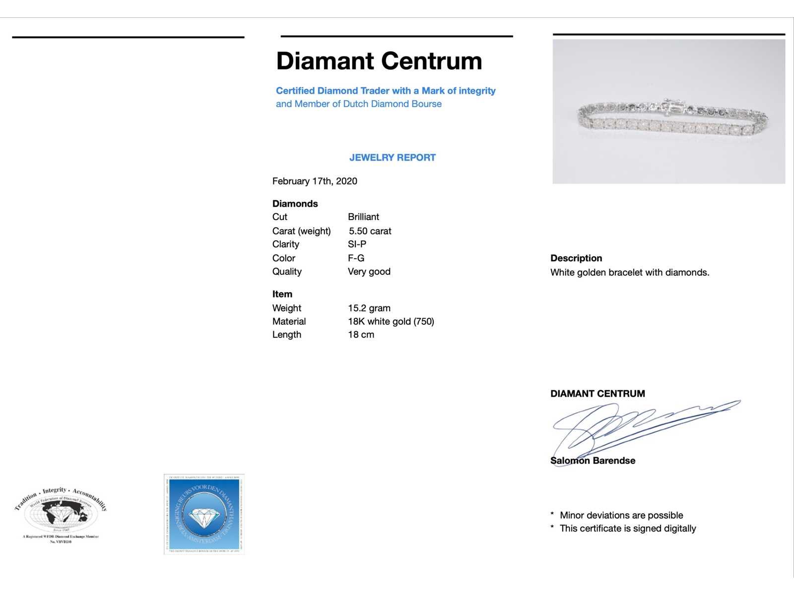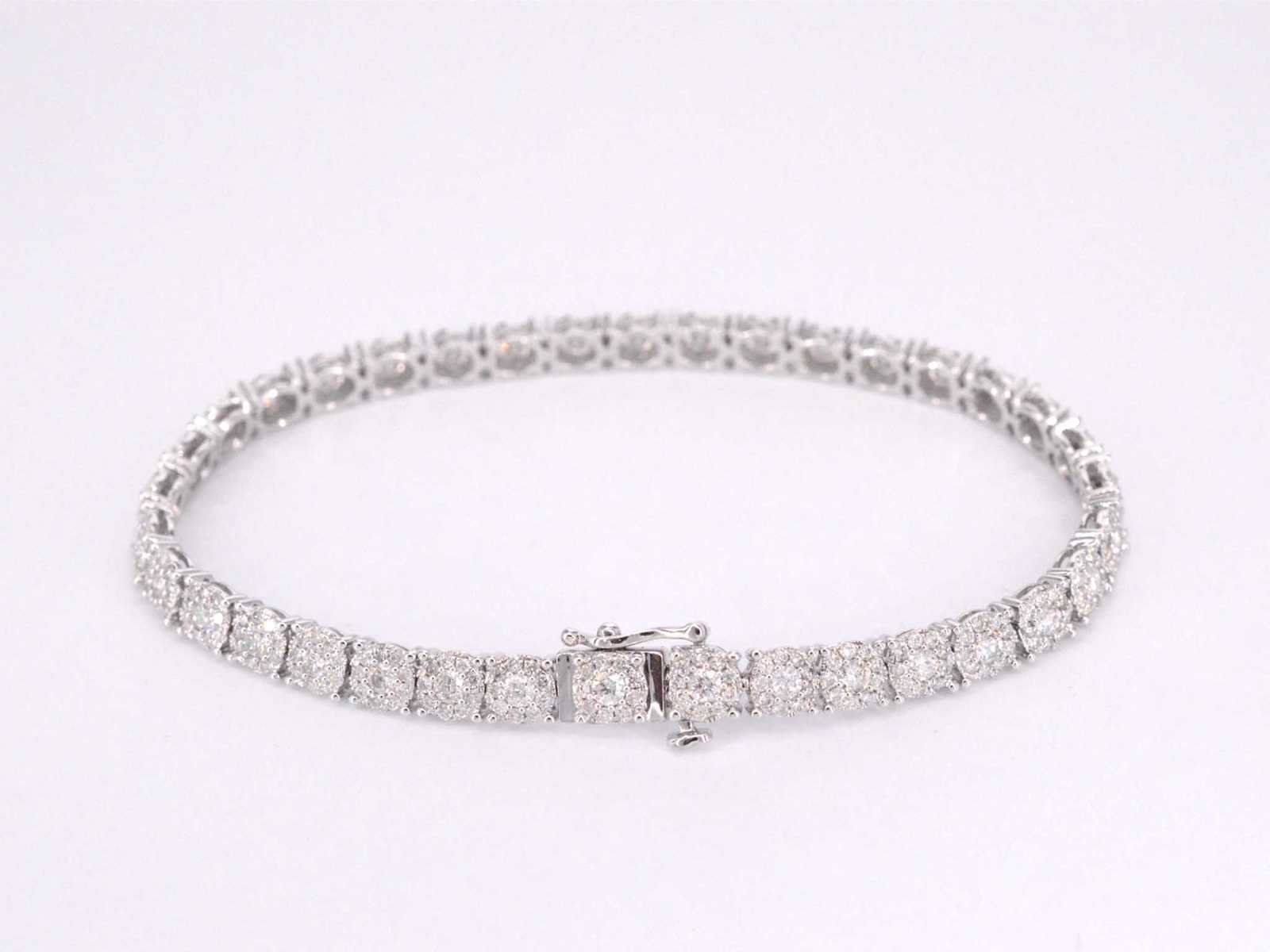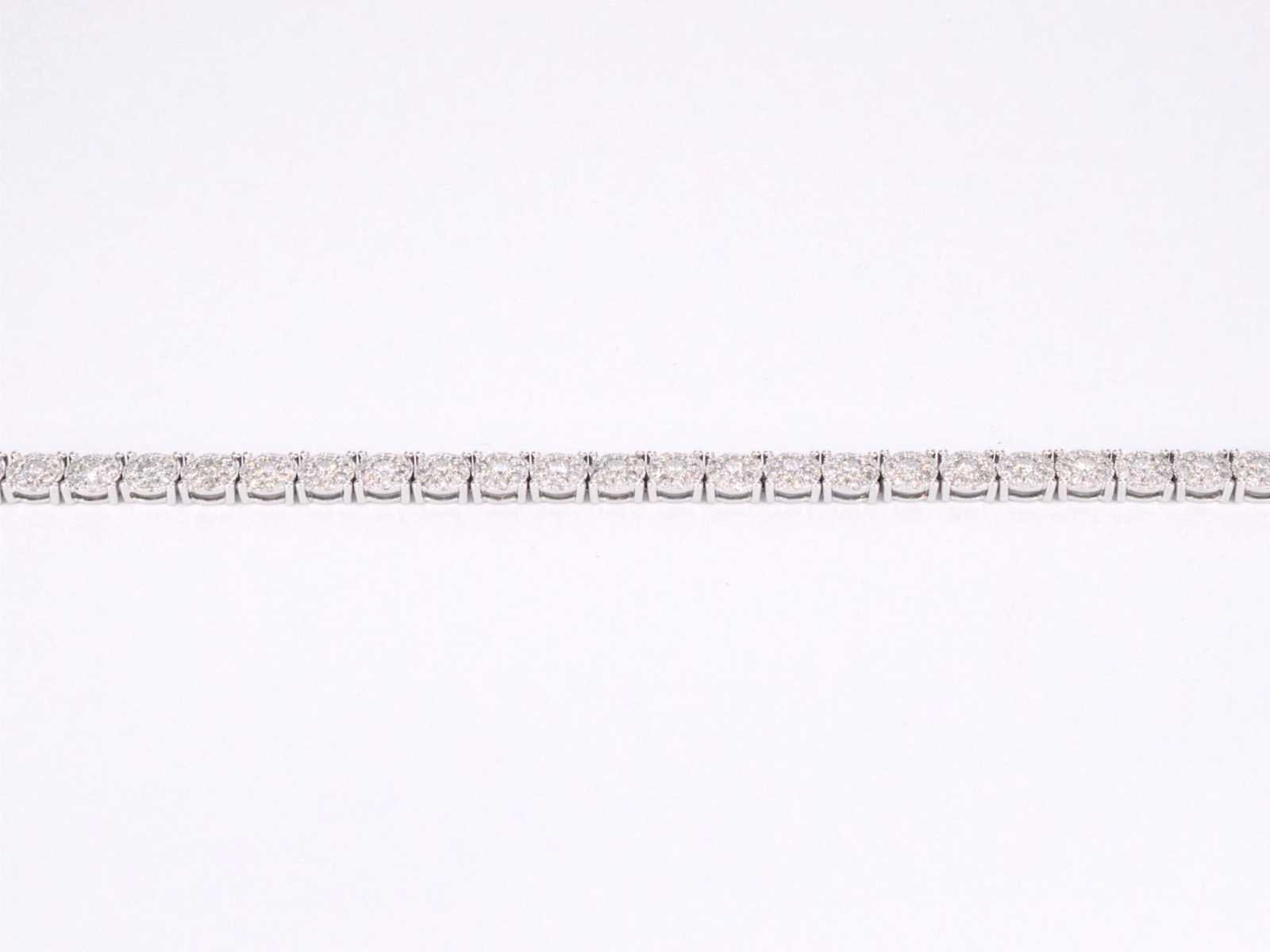 Samenvatting van gegevens Witgouden tennisarmband met diamanten 5.50 carat Diamant: Natuurlijk; Slijpvorm: Briljant geslepen; Gewicht (carat): 5.50 carat; Kleur: F-G; Zuiverheid: SI-P; Slijpkwaliteit: Zeer mooi; Juweel: Armband; Gewicht: 15.2 gram; Afmetingen/lengte: 18 cm; Materiaal: 18K goud (750); Conditie: Nieuw; Verpakking: Luxe sieradendoos; Toelichting: De kwaliteit is overgenomen van het rapport behorend bij item. De waardebepaling is een beoordeling van een gecertificeerde diamantair, gebaseerd op consumentenprijzen.; Consumentenprijs: € 22.033,- Within 14 days Materiaal: Goud Voornaamste diamant: Natuurlijk Kleur diamant: F-G Gewicht diamant: 5.50ct Slijpvorm diamant: Briljant geslepen Slijpkwaliteit diamant: Zeer mooi Zuiverheidsgraad diamant: SI-P Totaal gewicht: 15.2g Keurmerk: 750 Lage schatting: 17626€ Hoge schatting: 22033€