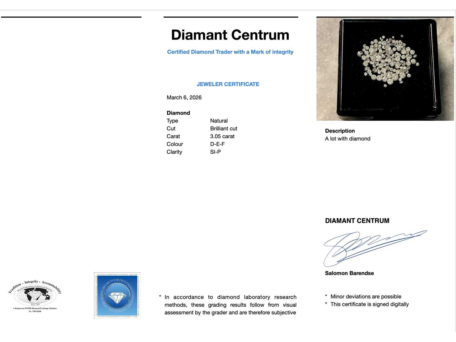 Samenvatting van gegevens Diamant - 3.05 carat natuurlijke diamant briljant geslepen Diamant: Natuurlijk; Slijpvorm: Briljant geslepen; Gewicht (carat): 3.05 carat; Kleur: D-E-F; Zuiverheid: SI-P; Conditie: Nieuw; Verpakking: Edelsteendoos; Toelichting: De kwaliteit is overgenomen van het rapport behorend bij item. De waardebepaling is een beoordeling van een gecertificeerde diamantair, gebaseerd op consumentenprijzen.; Consumentenprijs: € 5.360,- Within 14 days Voornaamste diamant: Natuurlijk Kleur diamant: D-E-F Gewicht diamant: 3.05ct Slijpvorm diamant: Briljant geslepen Zuiverheidsgraad diamant: SI-P Lage schatting: 4288€ Hoge schatting: 5360€