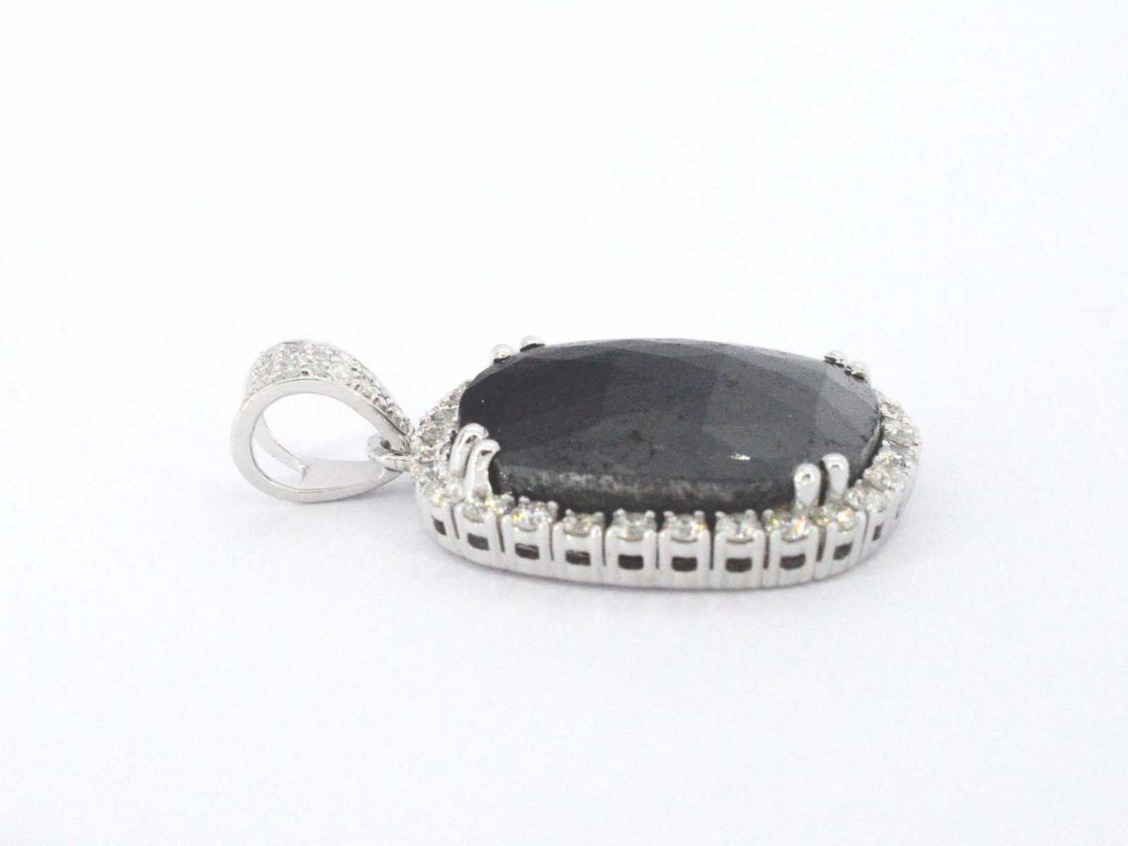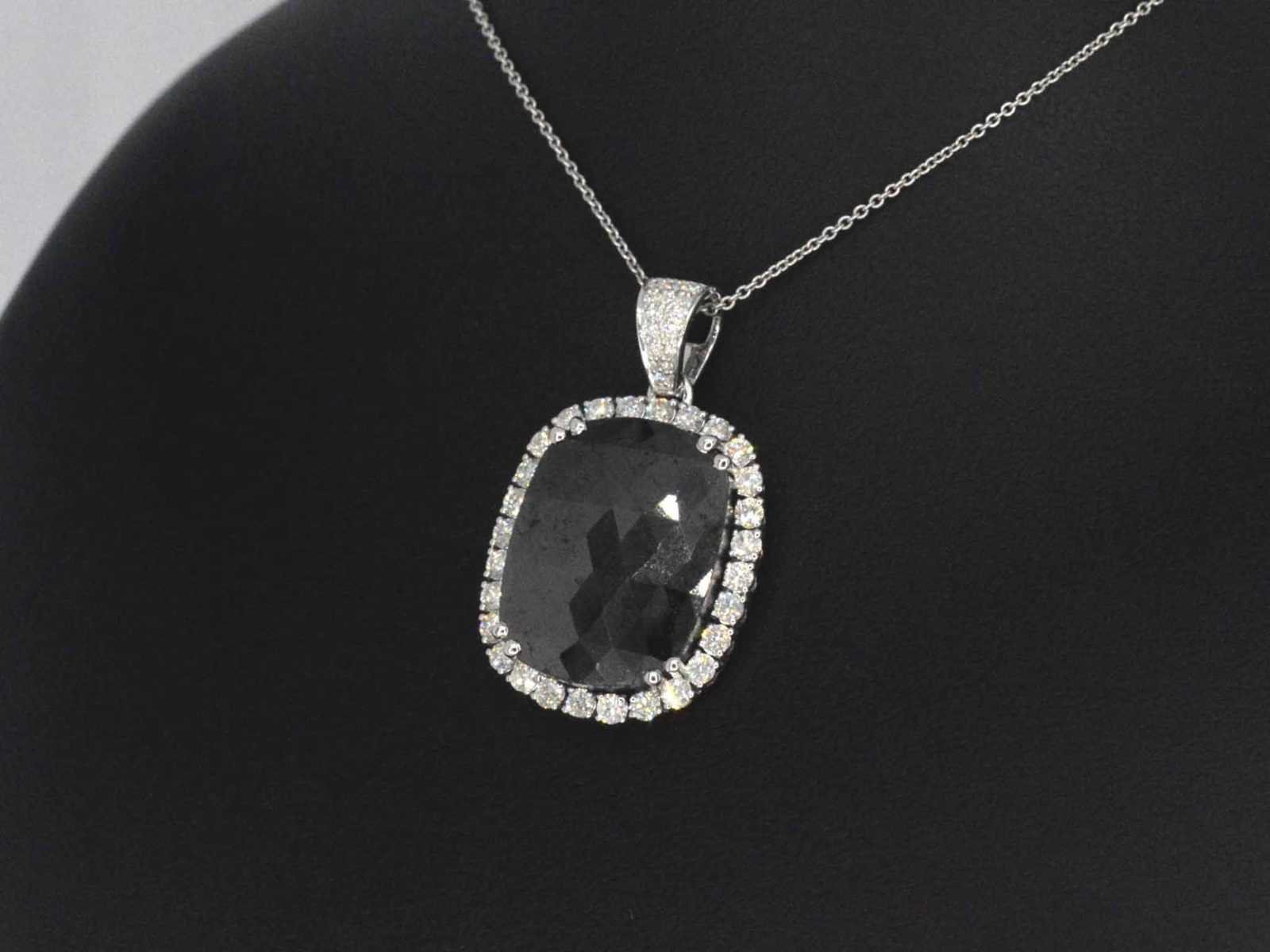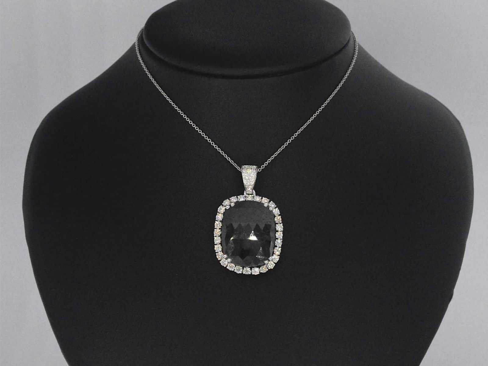 Samenvatting van gegevens Witgouden hanger met witte en zwarte diamanten Diamant: Natuurlijk; Aantal: 1 stuk; Slijpvorm: Rond ovaal gefacetteerd; Gewicht (carat): 17.19 carat; Kleur: Zwart (enhanced); Zuiverheid: Opaak; Slijpkwaliteit: Zeer mooi; Diamant (secundair): Diamanten; Aantal diamanten: 44 stuks; Slijpvorm: Rond geslepen; Gewicht (carat): 1.00 carat; Kleur: F-G; Zuiverheid: VS-SI; Juweel: Hanger (excl. ketting); Gewicht: 6 gram; Materiaal: 14k goud (585); Conditie: Nieuw; Verpakking: Luxe sieradendoos; Toelichting: De kwaliteit is overgenomen van het rapport behorend bij item. De waardebepaling is een beoordeling van een gecertificeerde diamantair, gebaseerd op consumentenprijzen.; Extra informatie: Aan de oppervlakte van deze diamanten zitten nog natuurlijke kenmerken van ruwe diamant, dit kan voor een leek lijken op beschadigingen; Consumentenprijs: € 13.580,- Within 14 days Materiaal: Goud Voornaamste diamant: Natuurlijk Kleur diamant: Zwart (enhanced) Gewicht diamant: 17.19ct Slijpvorm diamant: Rond ovaal gefacetteerd Slijpkwaliteit diamant: Zeer mooi Zuiverheidsgraad diamant: Opaak Totaal gewicht: 6g Keurmerk: 585 Lage schatting: 10864€ Hoge schatting: 13580€
