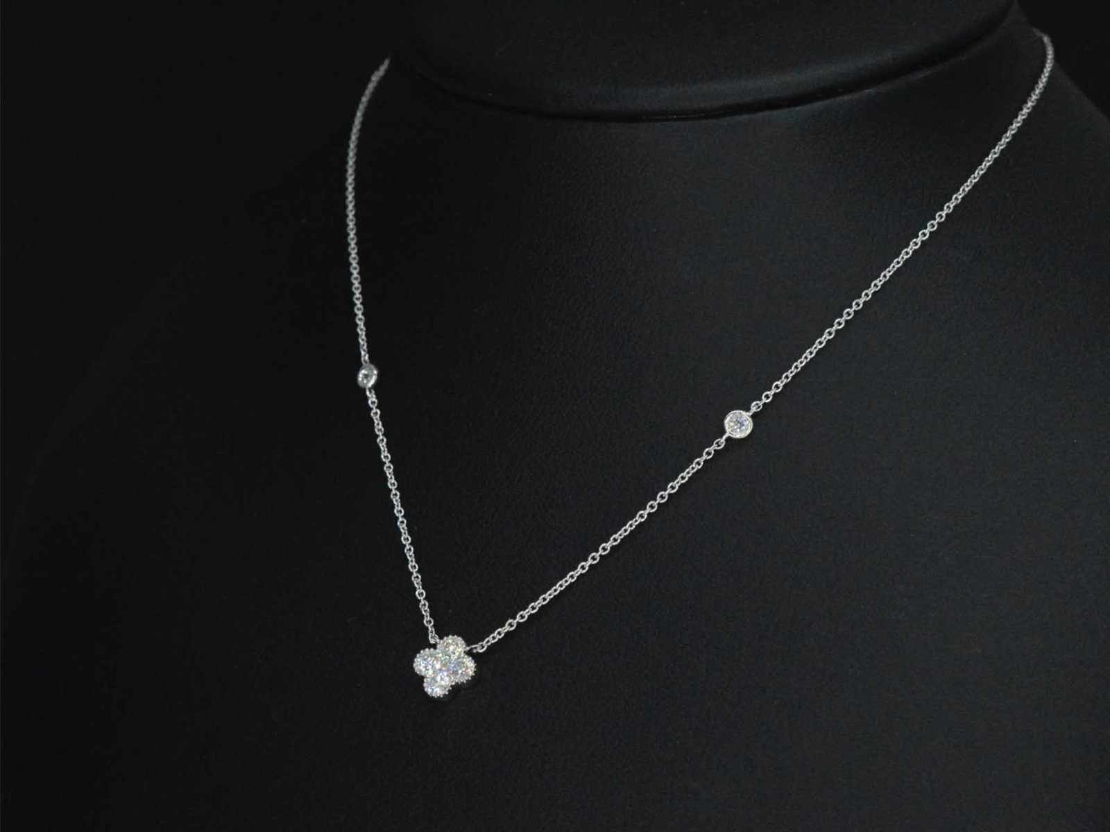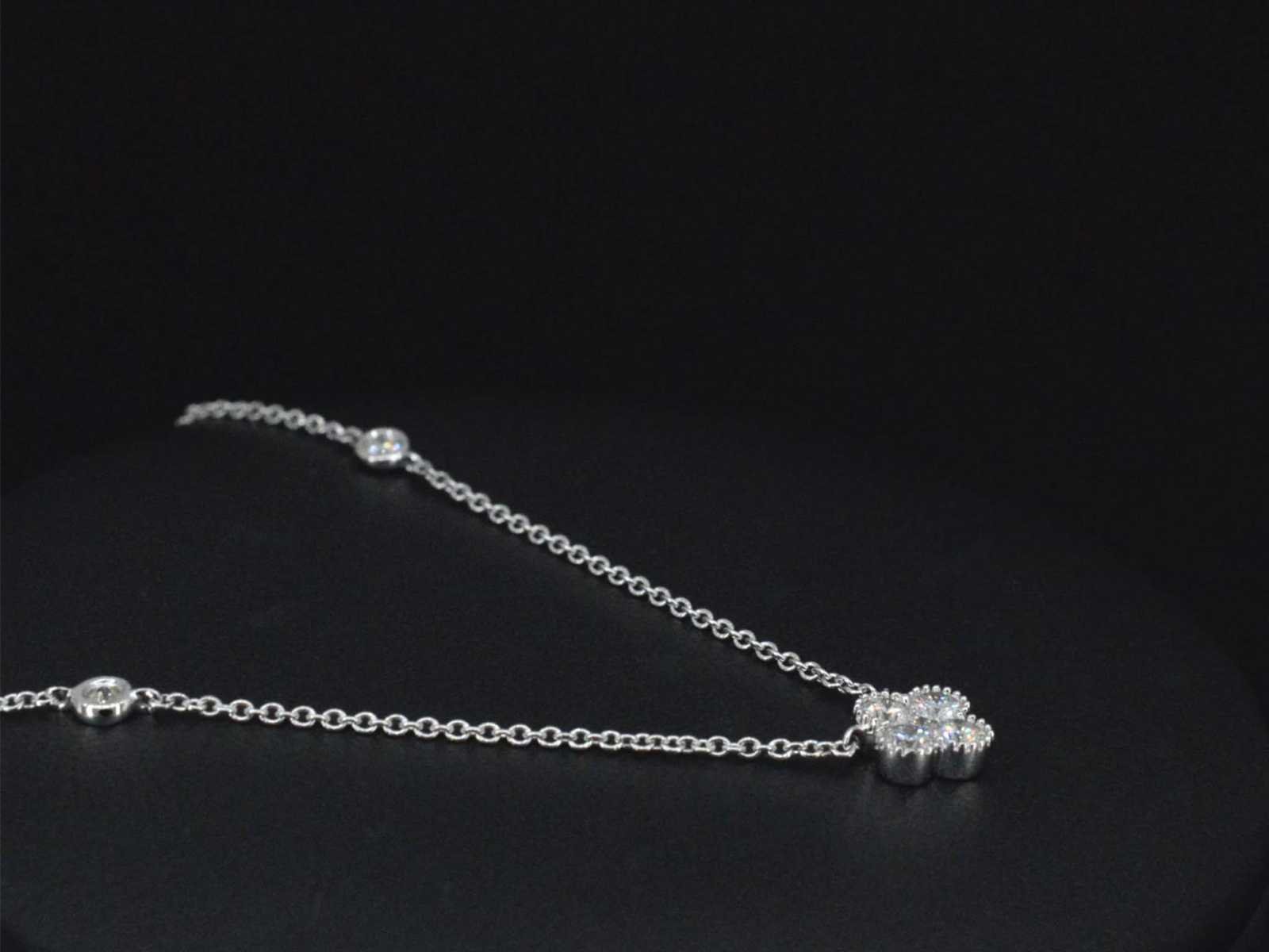 Samenvatting van gegevens Witgouden collier met diamanten hanger klaver vier Diamant: Natuurlijk; Aantal: 7 stuks; Slijpvorm: Briljant geslepen; Gewicht (carat): 0.30 carat; Kleur: F-G; Zuiverheid: VS; Slijpkwaliteit: Zeer mooi; Juweel: Collier; Gewicht: 1.9 gram; Afmetingen/lengte: 42 cm; Materiaal: 18K goud (750); Conditie: Nieuw; Verpakking: Luxe sieradendoos; Toelichting: De kwaliteit is overgenomen van het rapport behorend bij item. De waardebepaling is een beoordeling van een gecertificeerde diamantair, gebaseerd op consumentenprijzen.; Consumentenprijs: € 4.305,- Within 14 days Materiaal: Goud Voornaamste diamant: Natuurlijk Kleur diamant: F-G Gewicht diamant: 0.30ct Slijpvorm diamant: Briljant geslepen Slijpkwaliteit diamant: Zeer mooi Zuiverheidsgraad diamant: VS Totaal gewicht: 1.9g Keurmerk: 750 Lage schatting: 3444€ Hoge schatting: 4305€