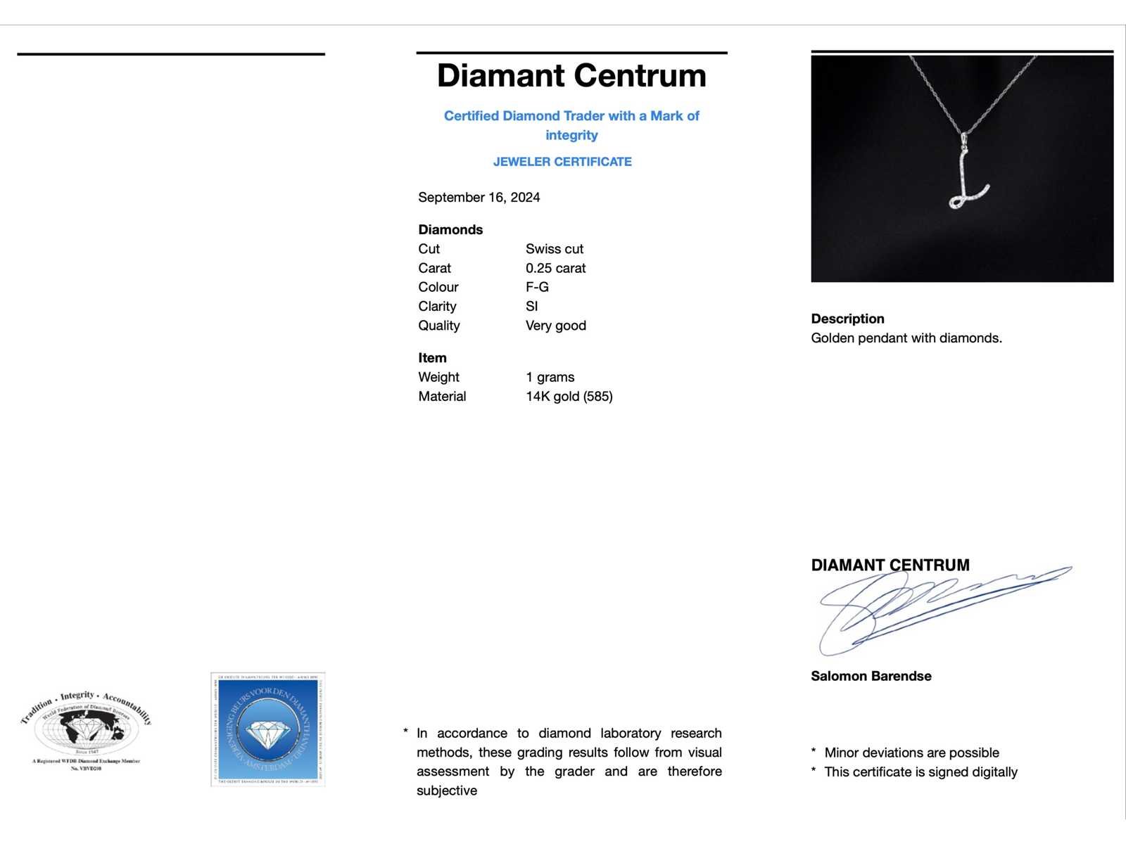Samenvatting van gegevens Hanger met echte natuurlijke diamanten in de letter L Diamant: Natuurlijk; Slijpvorm: Swiss geslepen; Gewicht (carat): 0.25 carat; Kleur: F-G; Zuiverheid: SI; Slijpkwaliteit: Zeer mooi; Juweel: Hanger (excl. ketting); Gewicht: 1 gram; Materiaal: 14k goud (585); Conditie: Nieuw; Verpakking: Luxe sieradendoos; Toelichting: De kwaliteit is overgenomen van het rapport behorend bij item. De waardebepaling is een beoordeling van een gecertificeerde diamantair, gebaseerd op consumentenprijzen.; Consumentenprijs: € 1.295,- Within 14 days Materiaal: Goud Voornaamste diamant: Natuurlijk Kleur diamant: F-G Gewicht diamant: 0.25ct Slijpvorm diamant: Swiss geslepen Slijpkwaliteit diamant: Zeer mooi Zuiverheidsgraad diamant: SI Totaal gewicht: 1g Keurmerk: 585 Lage schatting: 1414€ Hoge schatting: 1295€