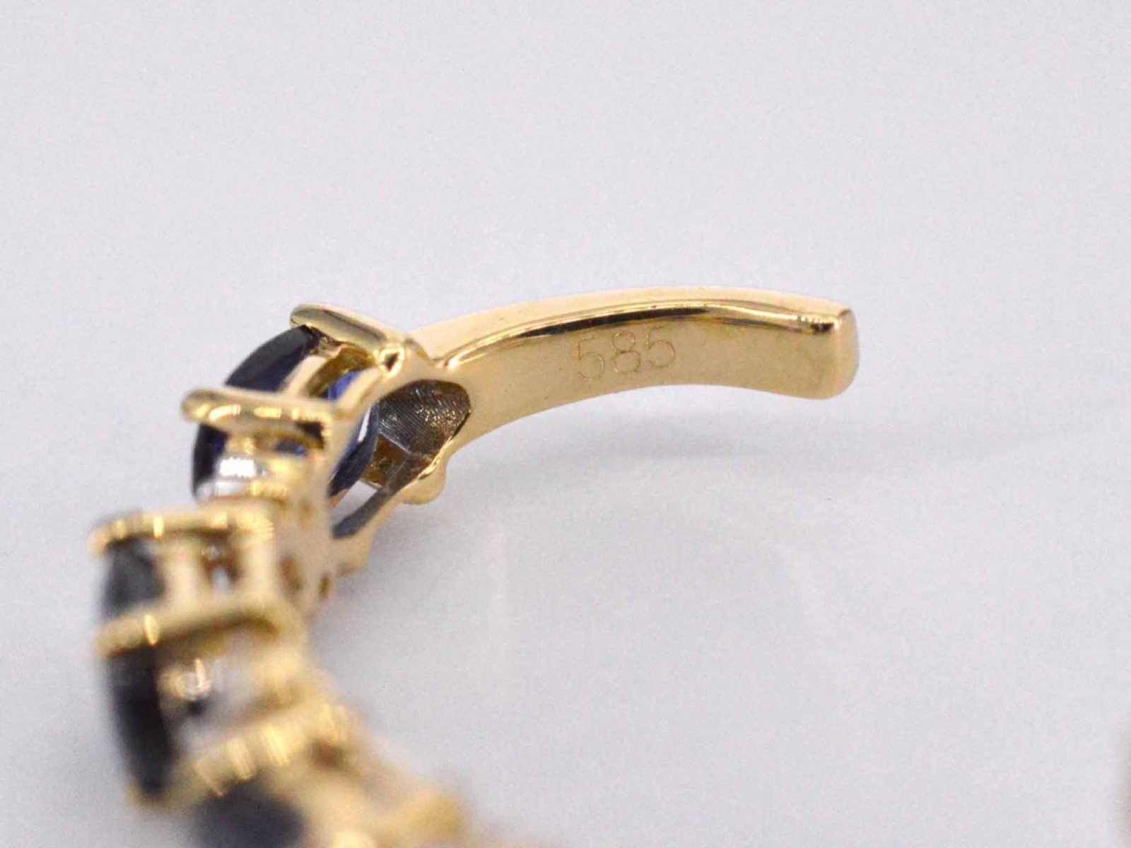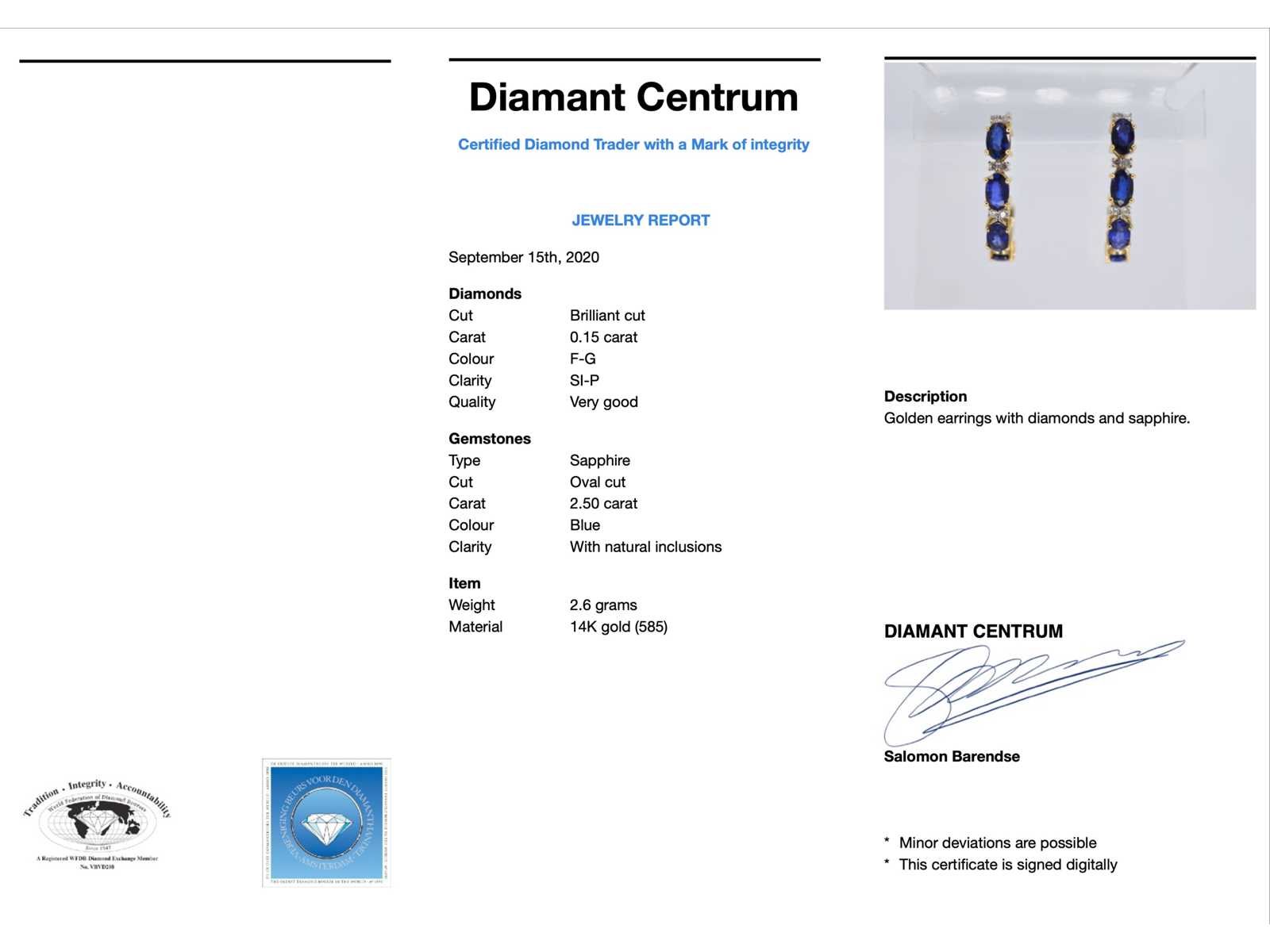 Samenvatting van gegevens Gouden oorbellen met diamanten en saffier Diamant: Natuurlijk; Slijpvorm: Briljant geslepen; Gewicht (carat): 0.15 carat; Kleur: F-G; Zuiverheid: SI-P; Slijpkwaliteit: Zeer mooi; Edelsteen: Saffier; Slijpvorm: Ovaal geslepen; Gewicht (carat): 2.50 carat; Juweel: Oorbellen; Gewicht: 2.6 gram; Materiaal: 14 karaat (585); Conditie: Nieuw; Verpakking: Luxe sieradendoos; Toelichting: De kwaliteit is overgenomen van het rapport behorend bij item. De waardebepaling is een beoordeling van een gecertificeerde diamantair, gebaseerd op consumentenprijzen.; Consumentenprijs: € 2.275,- Within 14 days Voornaamste diamant: Natuurlijk Kleur diamant: F-G Gewicht diamant: 0.15ct Slijpvorm diamant: Briljant geslepen Slijpkwaliteit diamant: Zeer mooi Zuiverheidsgraad diamant: SI-P Edelsteen: Saffier Slijpvorm edelsteen: Ovaal geslepen Totaal gewicht: 2.6g Keurmerk: 585 Lage schatting: 1820€ Hoge schatting: 2275€