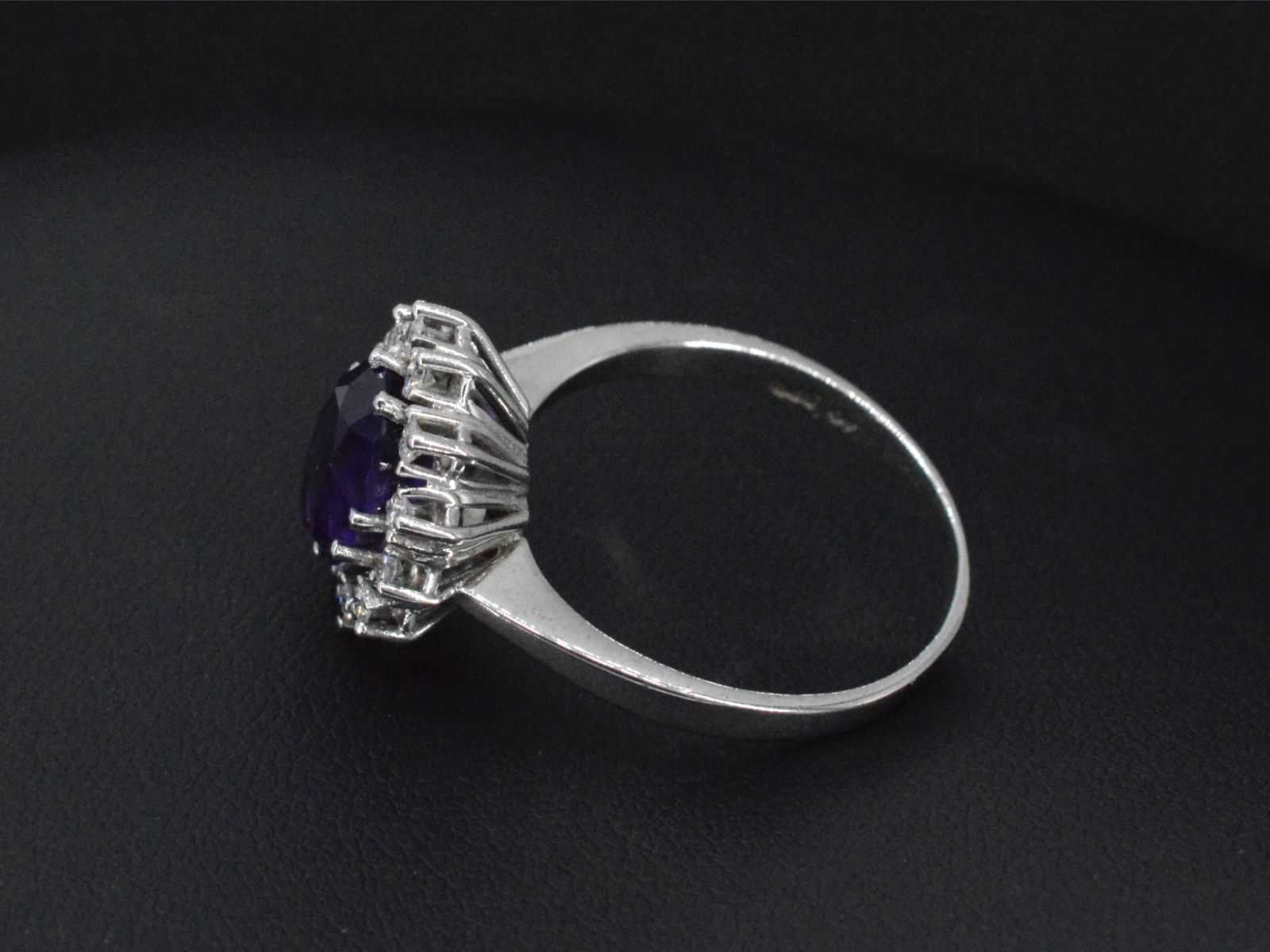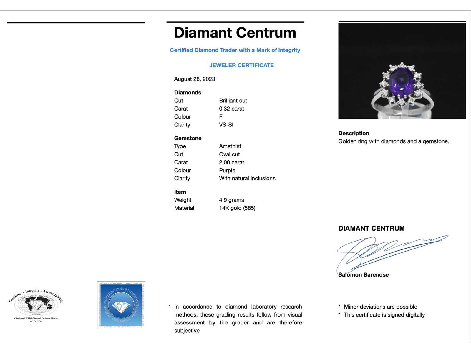 Samenvatting van gegevens Witgouden ring met diamanten en amethist Diamant: Natuurlijk; Aantal: 12 stuks; Slijpvorm: Briljant geslepen; Gewicht (carat): 0.32 carat; Kleur: F; Zuiverheid: VS-SI; Edelsteen: Amethist; Slijpvorm: Ovaal geslepen; Gewicht (carat): 2.00 carat; Kleur: Paars; Zuiverheid: Met natuurlijke insluitsels; Juweel: Ring; Gewicht: 4.9 gram; Ringmaat (op maat gemaakt*): 60.5 (19.25 mm); Materiaal: 14k goud (585); Conditie: Vintage; Verpakking: Luxe sieradendoos; Toelichting: De kwaliteit is overgenomen van het rapport behorend bij item. De waardebepaling is een beoordeling van een gecertificeerde diamantair, gebaseerd op consumentenprijzen.; Consumentenprijs: € 3.465,- Within 14 days Materiaal: Goud Voornaamste diamant: Natuurlijk Gewicht diamant: 0.32ct Edelsteen: Amethist Totaal gewicht: 4.9g Keurmerk: 585 Lage schatting: 2772€ Hoge schatting: 3465€ Kleur diamant: F Slijpvorm diamant: Briljant geslepen Zuiverheidsgraad diamant: VS-SI Kleur edelsteen: Paars Slijpvorm edelsteen: Ovaal geslepen Zuiverheidsgraad edelsteen: Met natuurlijke insluitsels
