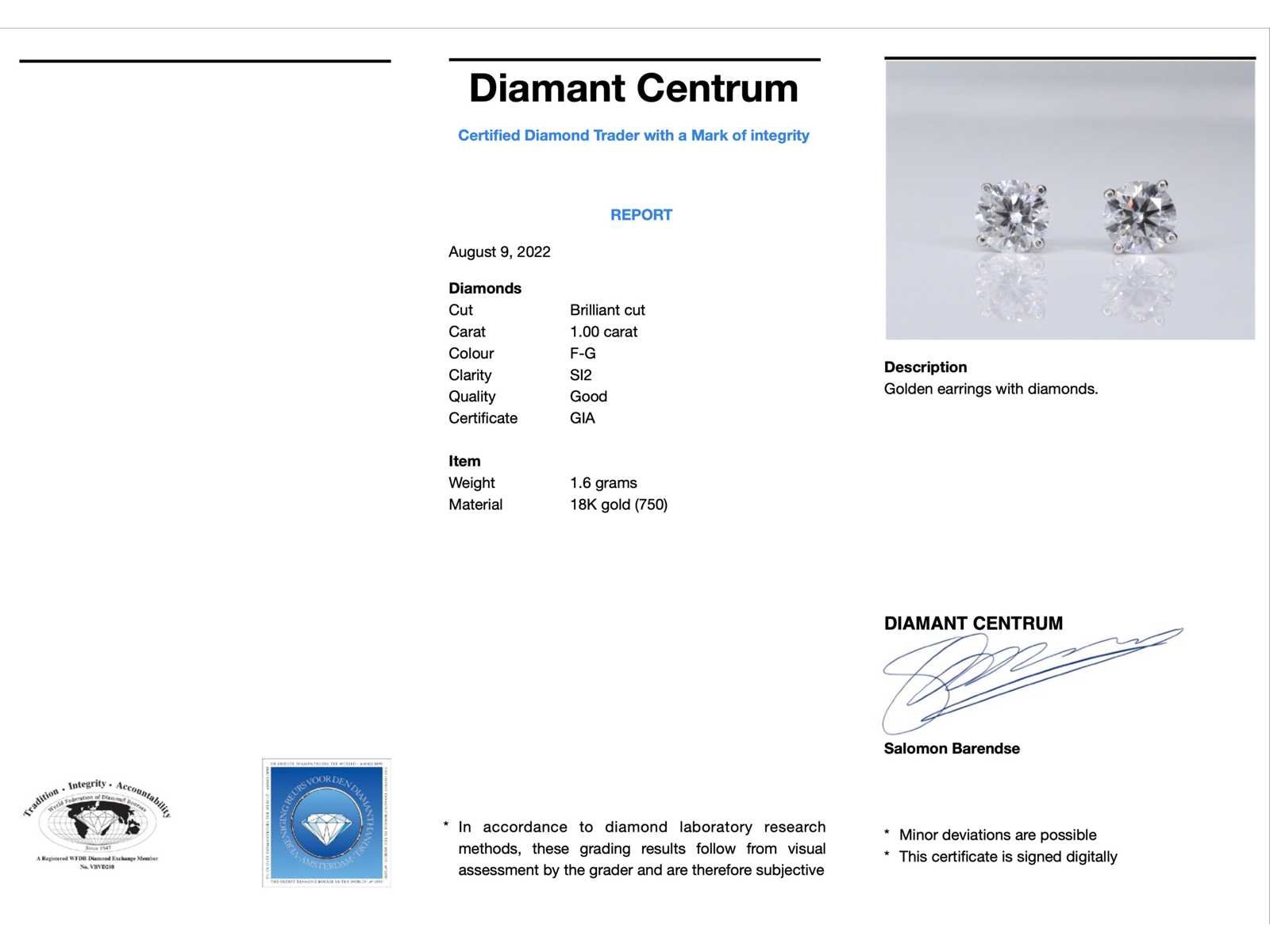 Samenvatting van gegevens Witgouden diamanten oorbellen van 1.00 carat Diamant: Natuurlijk; Aantal: 2 stuks; Slijpvorm: Briljant geslepen; Gewicht (carat): 1.00 carat; Kleur: F-G; Zuiverheid: SI2; Slijpkwaliteit: Mooi; Certificaat: GIA; Juweel: Oorbellen; Gewicht: 1.6 gram; Materiaal: 18K goud (750); Conditie: Nieuw; Verpakking: Luxe sieradendoos; Toelichting: De kwaliteit is overgenomen van het rapport behorend bij item. De waardebepaling is een beoordeling van een gecertificeerde diamantair, gebaseerd op consumentenprijzen.; Consumentenprijs: € 10.000,- Within 14 days Materiaal: Goud Voornaamste diamant: Natuurlijk Kleur diamant: F-G Gewicht diamant: 1.00ct Slijpvorm diamant: Briljant geslepen Slijpkwaliteit diamant: Mooi Zuiverheidsgraad diamant: SI2 Totaal gewicht: 1.6g Keurmerk: 750 Certificaat: GIA Lage schatting: 8000€ Hoge schatting: 10000€