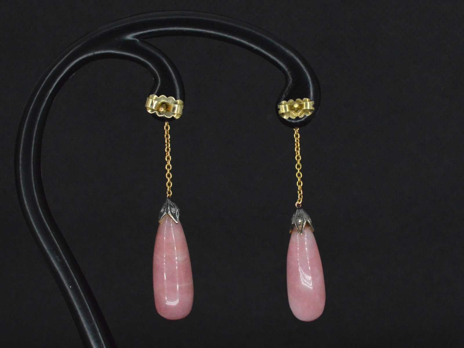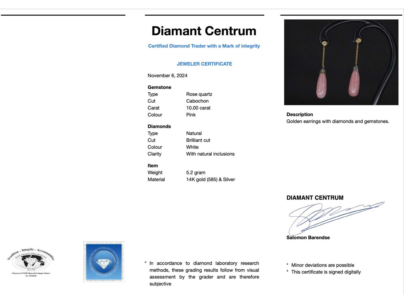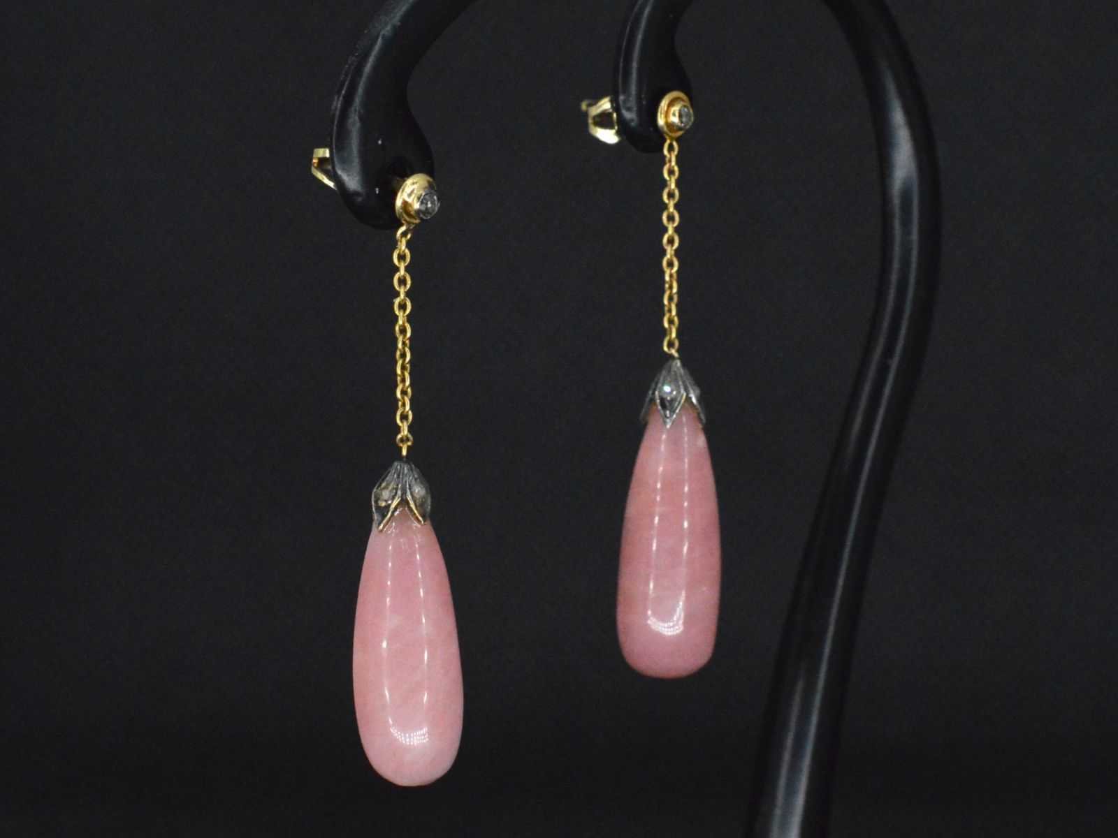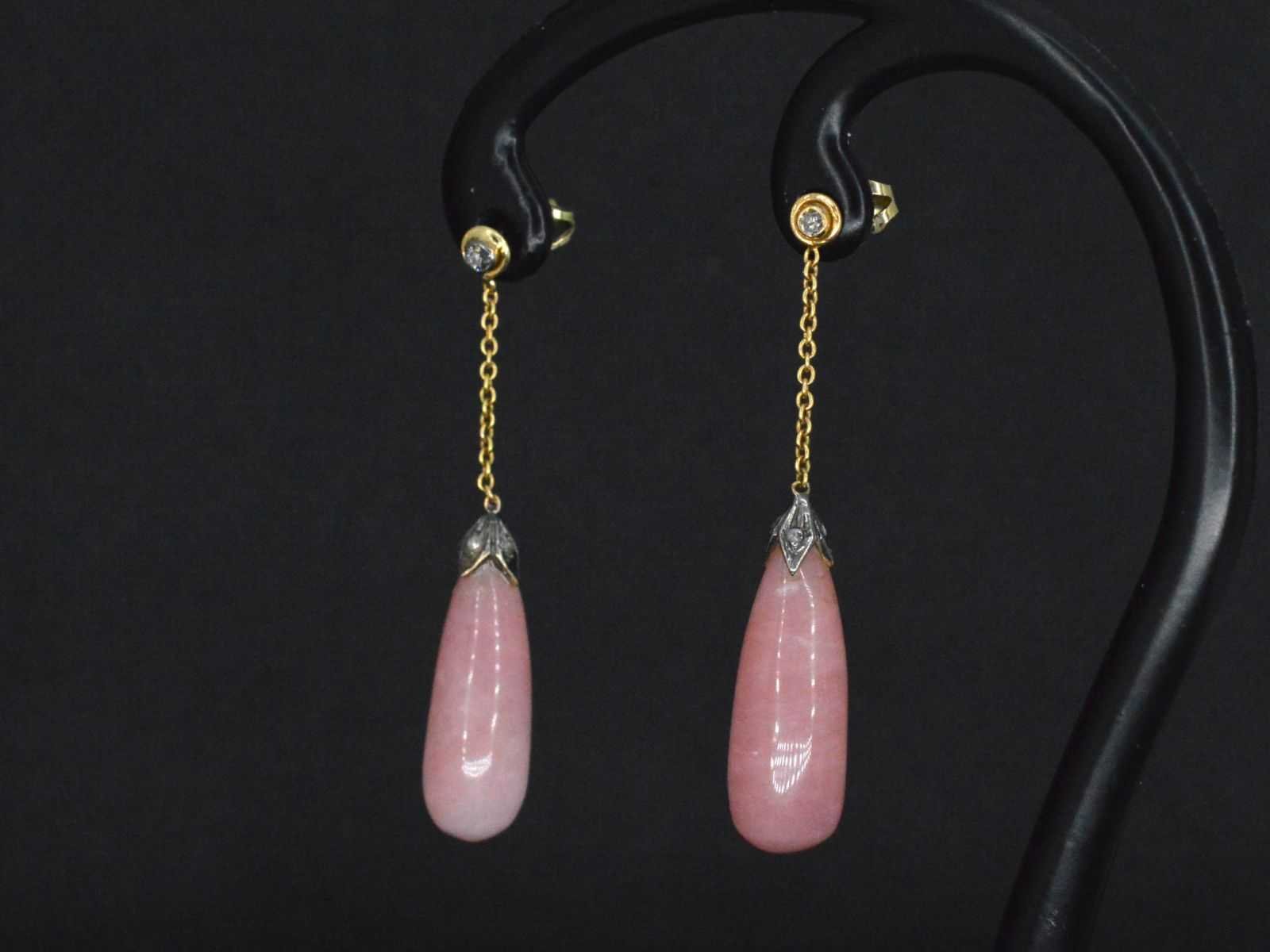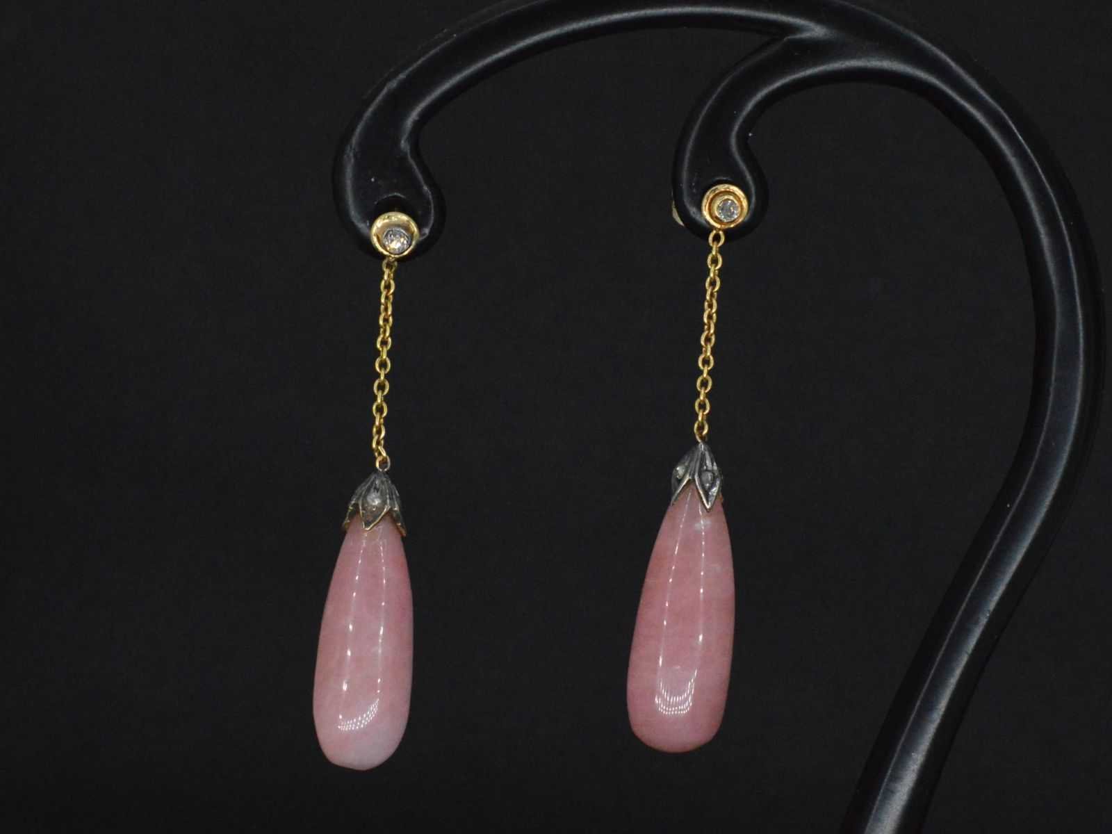 Samenvatting van gegevens Goud en zilveren oorbellen met diamanten en rozenkwarts Diamant: Natuurlijk; Aantal: 2 stuks; Slijpvorm: Briljant geslepen; Kleur: Wit; Zuiverheid: Met natuurlijke insluitsels; Edelsteen: Rozenkwarts; Slijpvorm: Cabochon; Gewicht (carat): 10.00 carat; Kleur: Roze; Juweel: Oorbellen; Gewicht: 5.2 gram; Afmetingen/lengte: 45 mm; Materiaal: 14k goud (585) en zilver; Conditie: Vintage; Verpakking: Luxe sieradendoos; Toelichting: De kwaliteit is overgenomen van het rapport behorend bij item. De waardebepaling is een beoordeling van een gecertificeerde diamantair, gebaseerd op consumentenprijzen.; Consumentenprijs: € 2.250,- Within 14 days Materiaal: Goud en zilver Voornaamste diamant: Natuurlijk Kleur diamant: Wit Slijpvorm diamant: Briljant geslepen Zuiverheidsgraad diamant: Met natuurlijke insluitsels Edelsteen: Rozenkwarts Kleur edelsteen: Roze Slijpvorm edelsteen: Cabochon Totaal gewicht: 5.2g Keurmerk: 585 Lage schatting: 1800€ Hoge schatting: 2250€