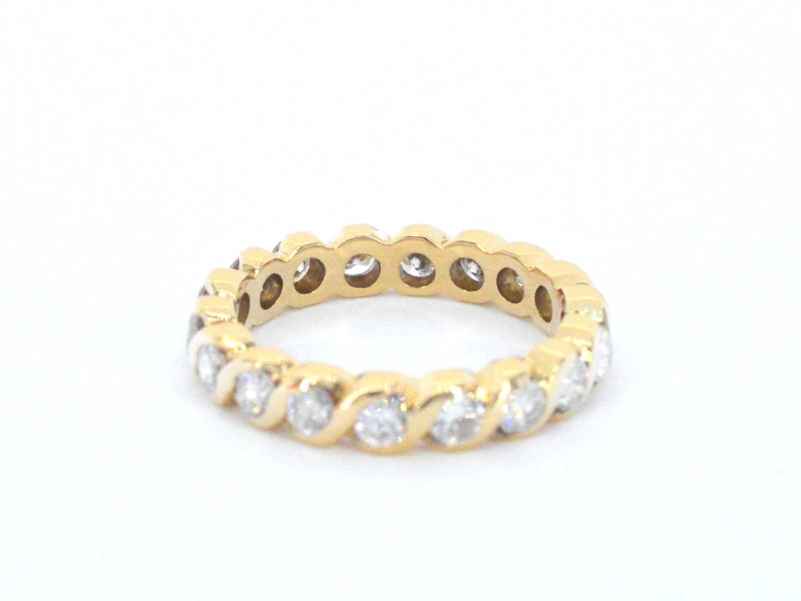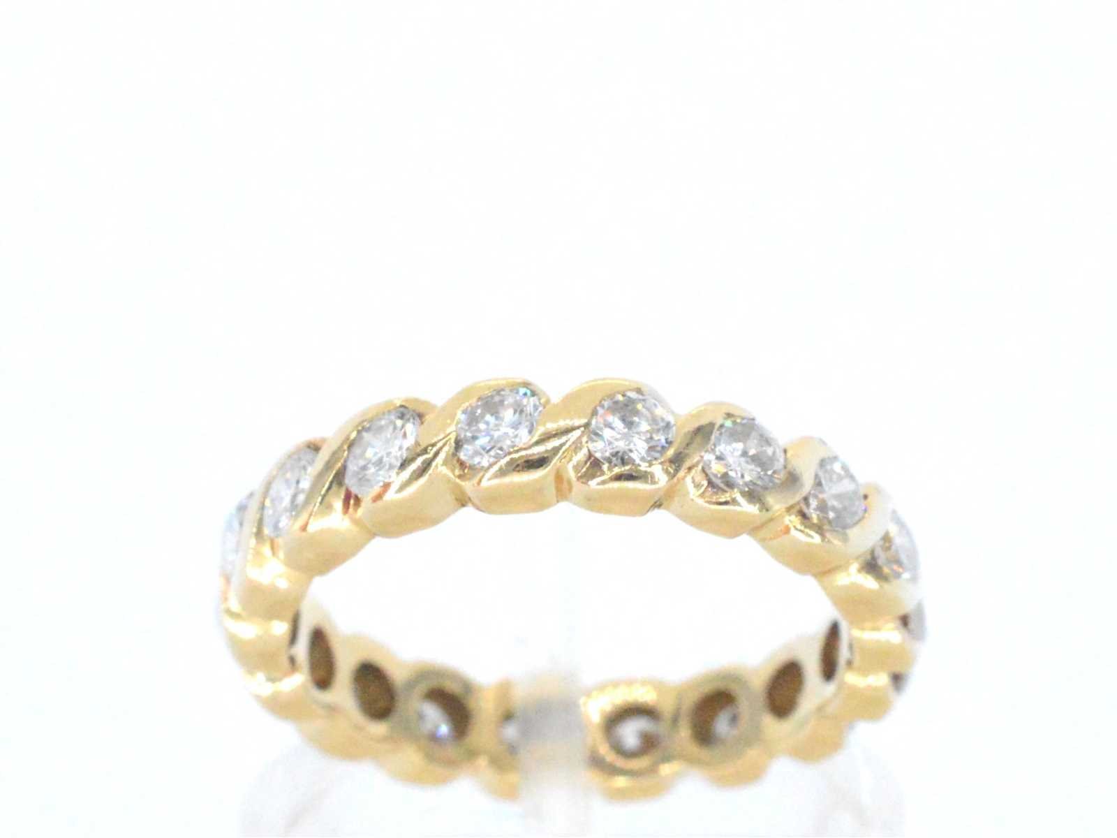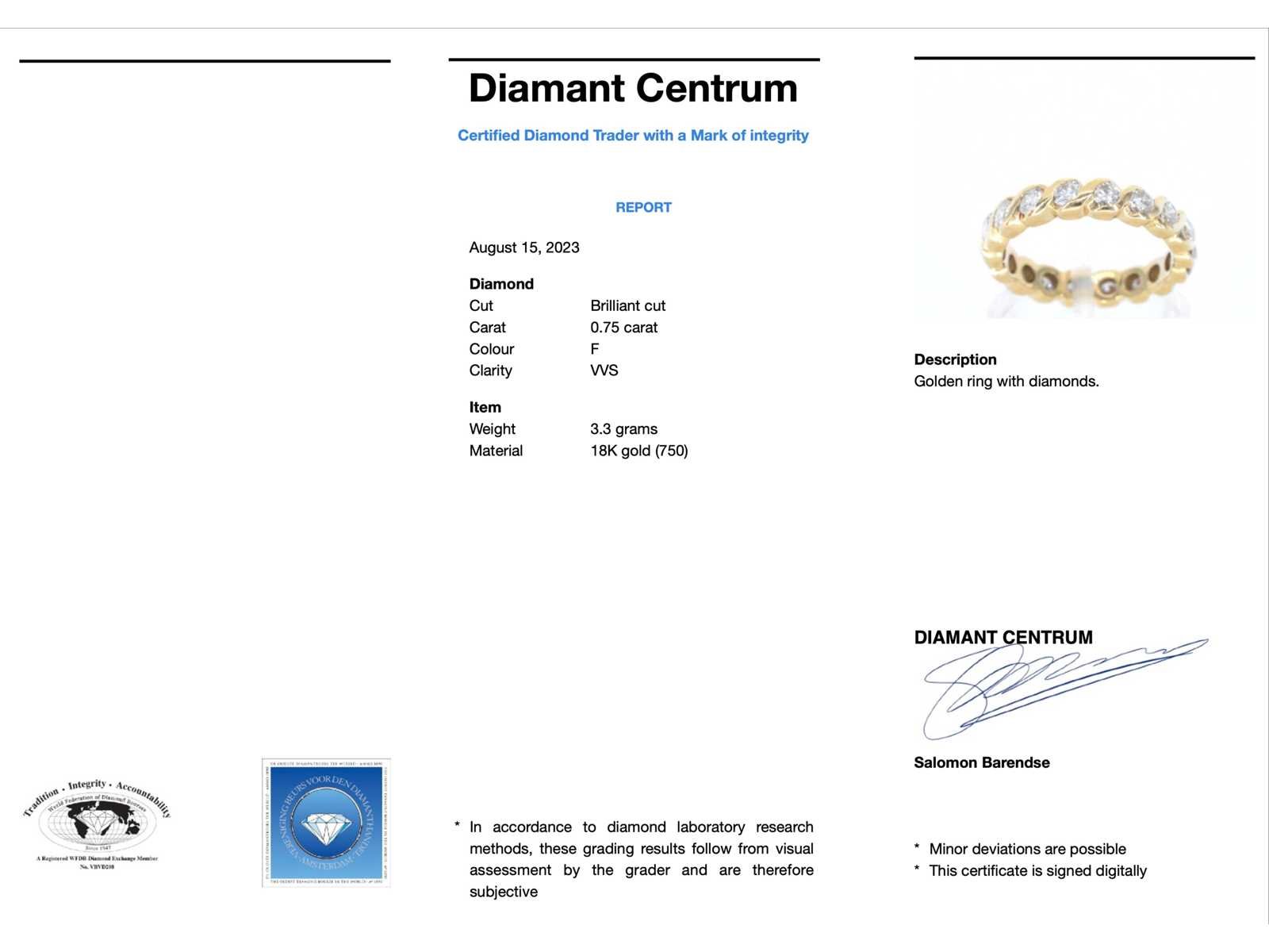 Samenvatting van gegevens Gouden alliance ring met diamanten Diamant: Natuurlijk; Aantal: 18 stuks; Slijpvorm: Briljant geslepen; Gewicht (carat): 0.75 carat; Kleur: F; Zuiverheid: VVS; Juweel: Ring; Gewicht: 3.3 gram; Ringmaat (op maat gemaakt*): 47.5 (15.25 mm); Materiaal: 18k goud (750); Conditie: Zo goed als nieuw; Verpakking: Luxe sieradendoos; Toelichting: De kwaliteit is overgenomen van het rapport behorend bij item. De waardebepaling is een beoordeling van een gecertificeerde diamantair, gebaseerd op consumentenprijzen.; Consumentenprijs: € 5.215,- Within 14 days Materiaal: Goud Voornaamste diamant: Natuurlijk Gewicht diamant: 0.75ct Totaal gewicht: 3.3g Keurmerk: 750 Lage schatting: 4172€ Hoge schatting: 5215€ Kleur diamant: F Slijpvorm diamant: Briljant geslepen Zuiverheidsgraad diamant: VVS