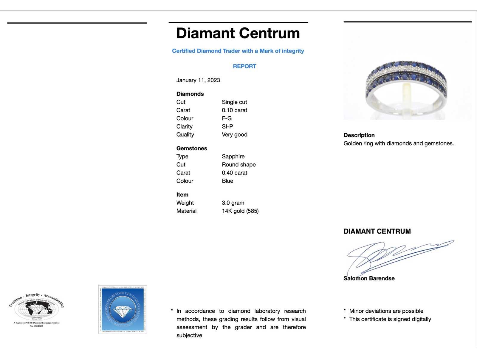 Samenvatting van gegevens Witgouden ring met diamanten en saffieren Diamant: Natuurlijk; Aantal: 20 stuks; Slijpvorm: Single geslepen; Gewicht (carat): 0.10 carat; Kleur: F-G; Zuiverheid: SI-P; Slijpkwaliteit: Zeer mooi; Edelsteen: Saffier; Slijpvorm: Rond; Gewicht (carat): 0.40 carat; Kleur: Blauw; Juweel: Ring; Gewicht: 3 gram; Ringmaat (op maat gemaakt*): 54 (17.25 mm); Materiaal: 14 karaat (585); Conditie: Nieuw; Verpakking: Luxe sieradendoos; Toelichting: De kwaliteit is overgenomen van het rapport behorend bij item. De waardebepaling is een beoordeling van een gecertificeerde diamantair, gebaseerd op consumentenprijzen.; Consumentenprijs: € 2.240,- Within 14 days Voornaamste diamant: Natuurlijk Gewicht diamant: 0.10ct Edelsteen: Saffier Totaal gewicht: 3g Keurmerk: 585 Lage schatting: 1792€ Hoge schatting: 2240€ Kleur diamant: F-G Slijpvorm diamant: Single geslepen Slijpkwaliteit diamant: Zeer mooi Zuiverheidsgraad diamant: SI-P Kleur edelsteen: Blauw Slijpvorm edelsteen: Rond