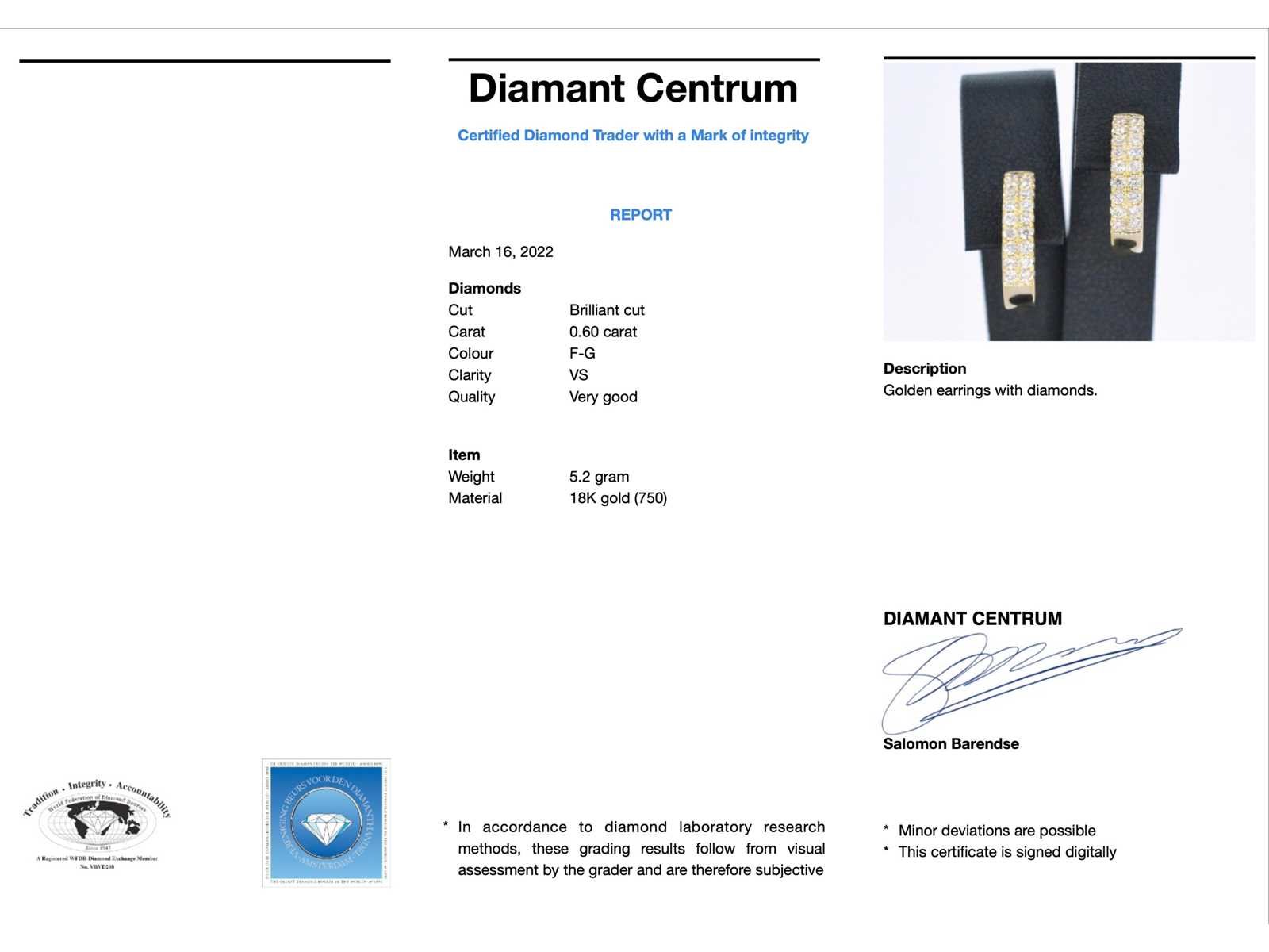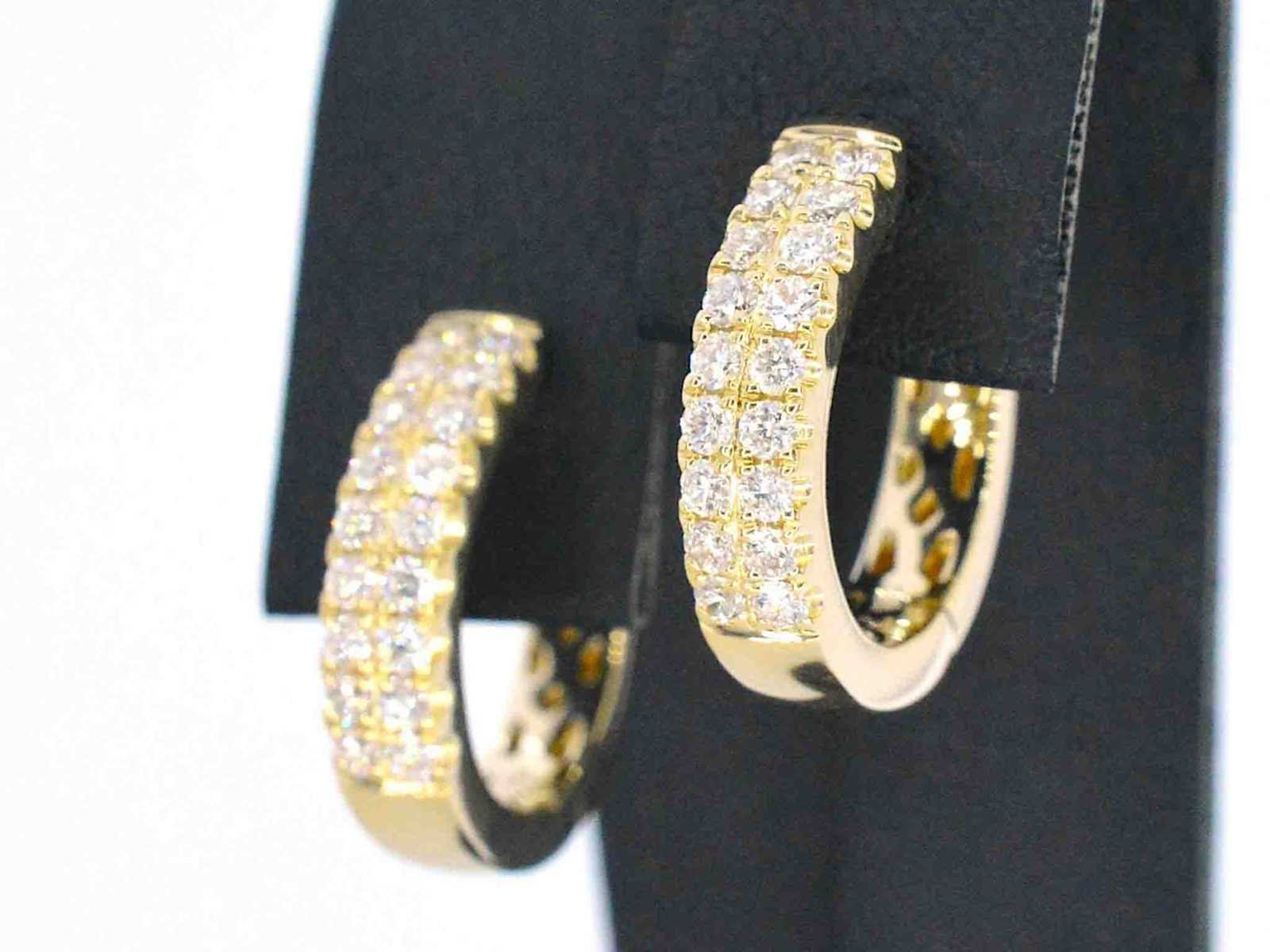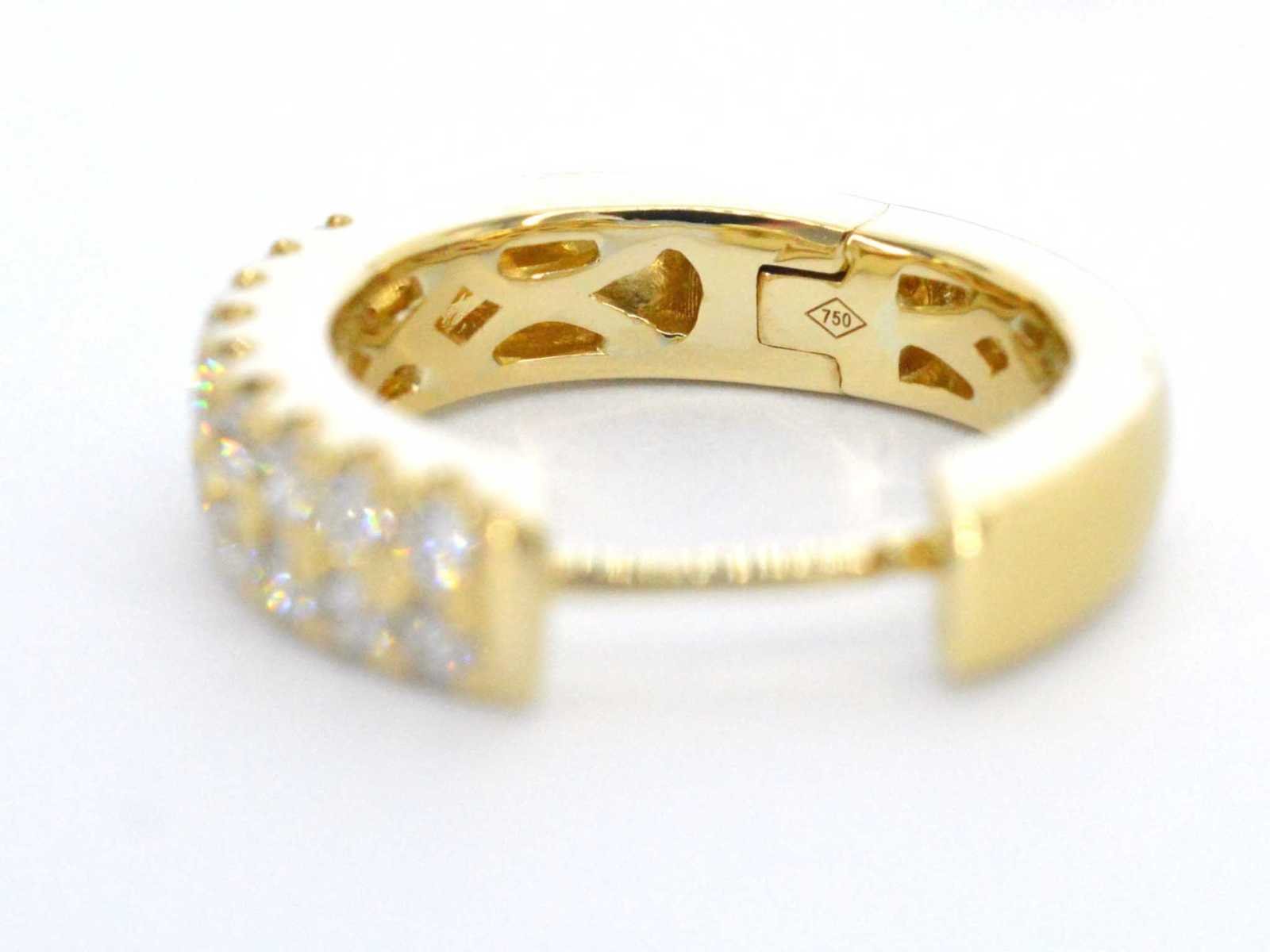 Samenvatting van gegevens Gouden oorbellen met twee rijen diamanten Diamant: Natuurlijk; Aantal: 36 stuks; Slijpvorm: Briljant geslepen; Gewicht (carat): 0.60 carat; Kleur: F-G; Zuiverheid: VS; Slijpkwaliteit: Zeer mooi; Juweel: Oorbellen; Gewicht: 5.2 gram; Afmetingen/lengte: 16 x 3 mm; Materiaal: 18K goud (750); Conditie: Nieuw; Verpakking: Luxe sieradendoos; Toelichting: De kwaliteit is overgenomen van het rapport behorend bij item. De waardebepaling is een beoordeling van een gecertificeerde diamantair, gebaseerd op consumentenprijzen.; Consumentenprijs: € 7.945,- Within 14 days Materiaal: Goud Voornaamste diamant: Natuurlijk Kleur diamant: F-G Gewicht diamant: 0.60ct Slijpvorm diamant: Briljant geslepen Slijpkwaliteit diamant: Zeer mooi Zuiverheidsgraad diamant: VS Totaal gewicht: 5.2g Keurmerk: 750 Lage schatting: 6356€ Hoge schatting: 7945€