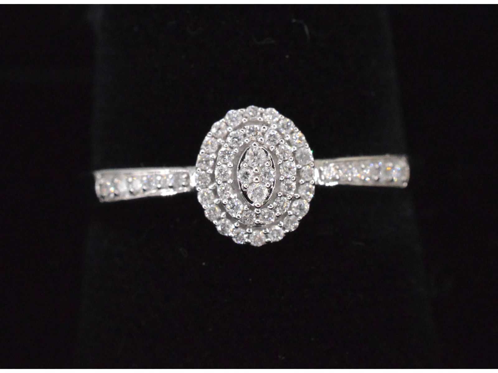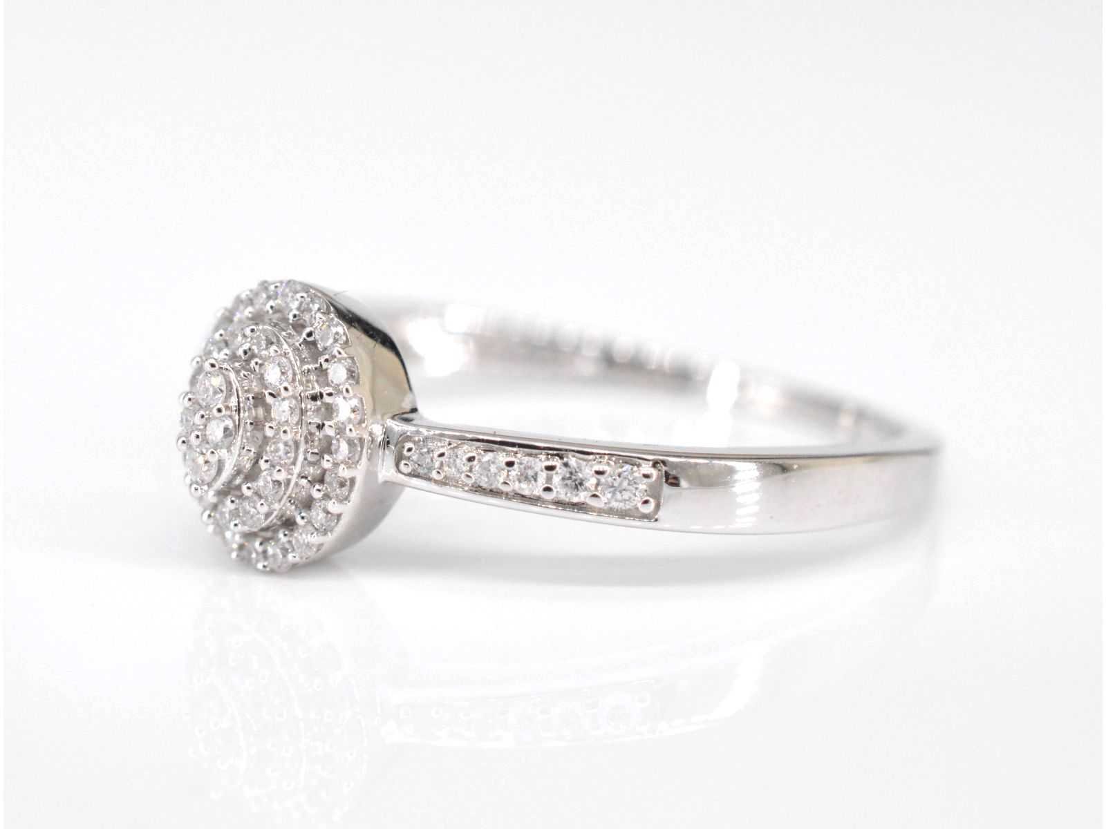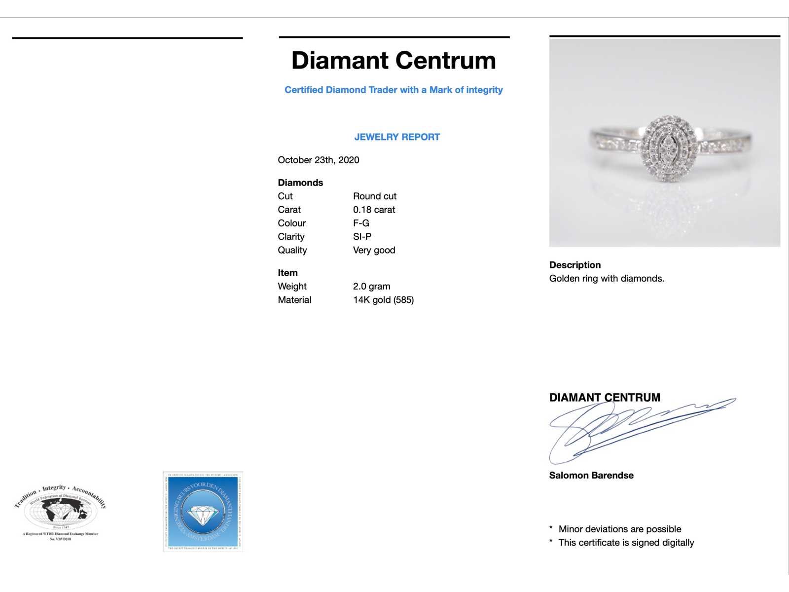 Samenvatting van gegevens Witgouden entourage ring met diamanten Diamant: Natuurlijk; Slijpvorm: Rond geslepen; Gewicht (carat): 0.18 carat; Kleur: F-G; Zuiverheid: SI-P; Slijpkwaliteit: Zeer mooi; Juweel: Ring; Gewicht: 2 gram; Ringmaat (op maat gemaakt*): 54 (17.25 mm); Materiaal: 14k goud (585); Conditie: Nieuw; Verpakking: Luxe sieradendoos; Toelichting: De kwaliteit is overgenomen van het rapport behorend bij item. De waardebepaling is een beoordeling van een gecertificeerde diamantair, gebaseerd op consumentenprijzen.; Consumentenprijs: € 1.768,- Within 14 days Materiaal: Goud Voornaamste diamant: Natuurlijk Gewicht diamant: 0.18ct Totaal gewicht: 2g Keurmerk: 585 Lage schatting: 1414€ Hoge schatting: 1768€ Kleur diamant: F-G Slijpvorm diamant: Rond geslepen Slijpkwaliteit diamant: Zeer mooi Zuiverheidsgraad diamant: SI-P