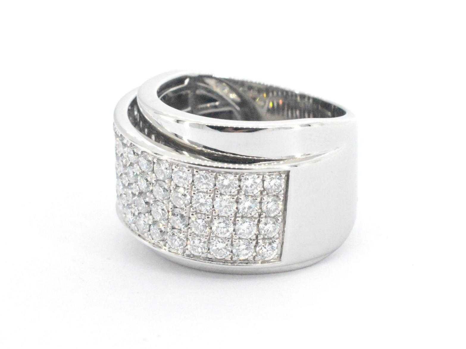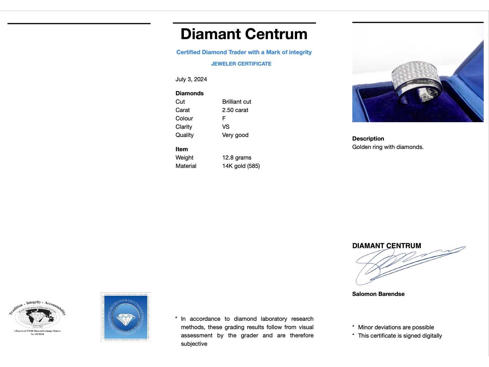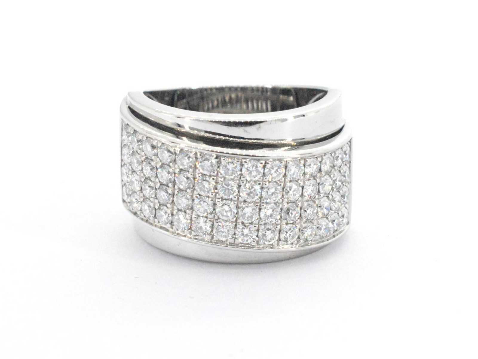 Samenvatting van gegevens Rijring met briljant geslepen hoge kwaliteit diamanten Diamant: Natuurlijk; Aantal: 56 stuks; Slijpvorm: Briljant geslepen; Gewicht (carat): 2.50 carat; Kleur: F; Zuiverheid: VS; Slijpkwaliteit: Zeer mooi; Juweel: Ring; Gewicht: 12.8 gram; Ringmaat (op maat gemaakt*): 56 (18 mm); Materiaal: 14 karaat (585); Conditie: Zo goed als nieuw; Toelichting: De kwaliteit is overgenomen van het rapport behorend bij item. De waardebepaling is een beoordeling van een gecertificeerde diamantair, gebaseerd op consumentenprijzen.; Consumentenprijs: € 14.700,- Within 14 days Voornaamste diamant: Natuurlijk Gewicht diamant: 2.50ct Totaal gewicht: 12.8g Keurmerk: 585 Lage schatting: 11760€ Hoge schatting: 14700€ Kleur diamant: F Slijpvorm diamant: Briljant geslepen Slijpkwaliteit diamant: Zeer mooi Zuiverheidsgraad diamant: VS