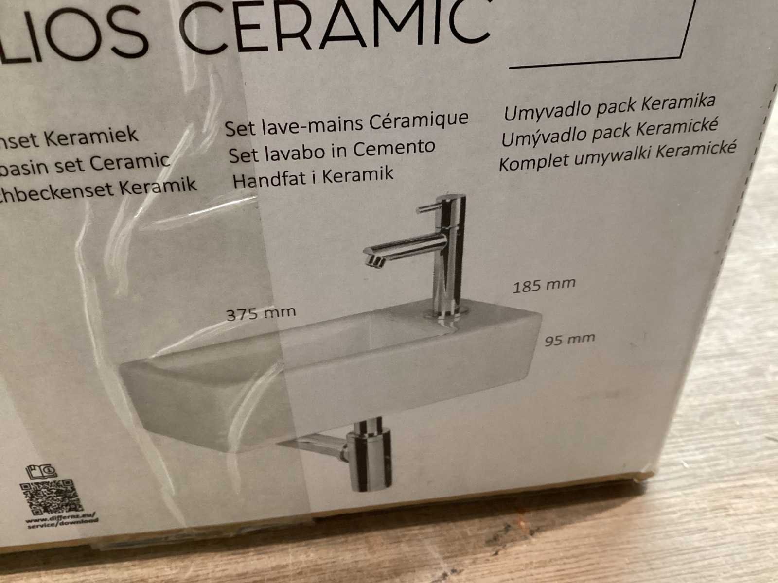 Wasbak wit keramiek compleet met chroom kraan, sifon, afvoerplug. Gecontroleerde webshopretour