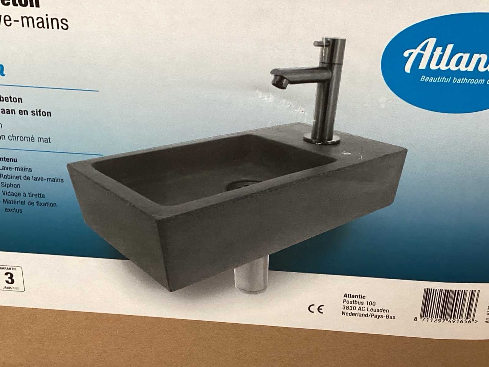 Wasbak beton compleet met matzwarte kraan, sifon, afvoerplug. Gecontroleerde webshopretour