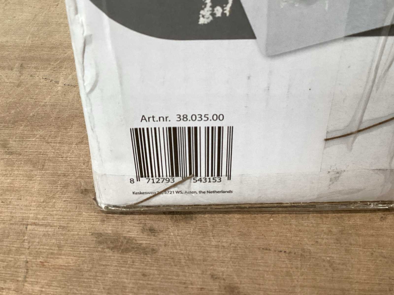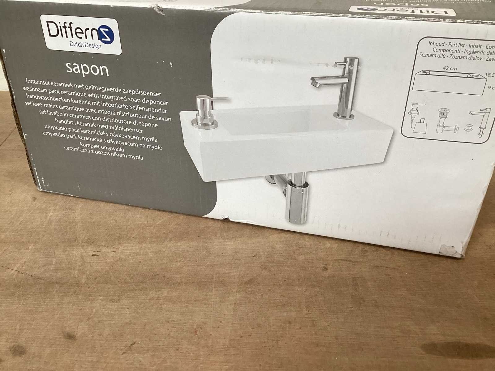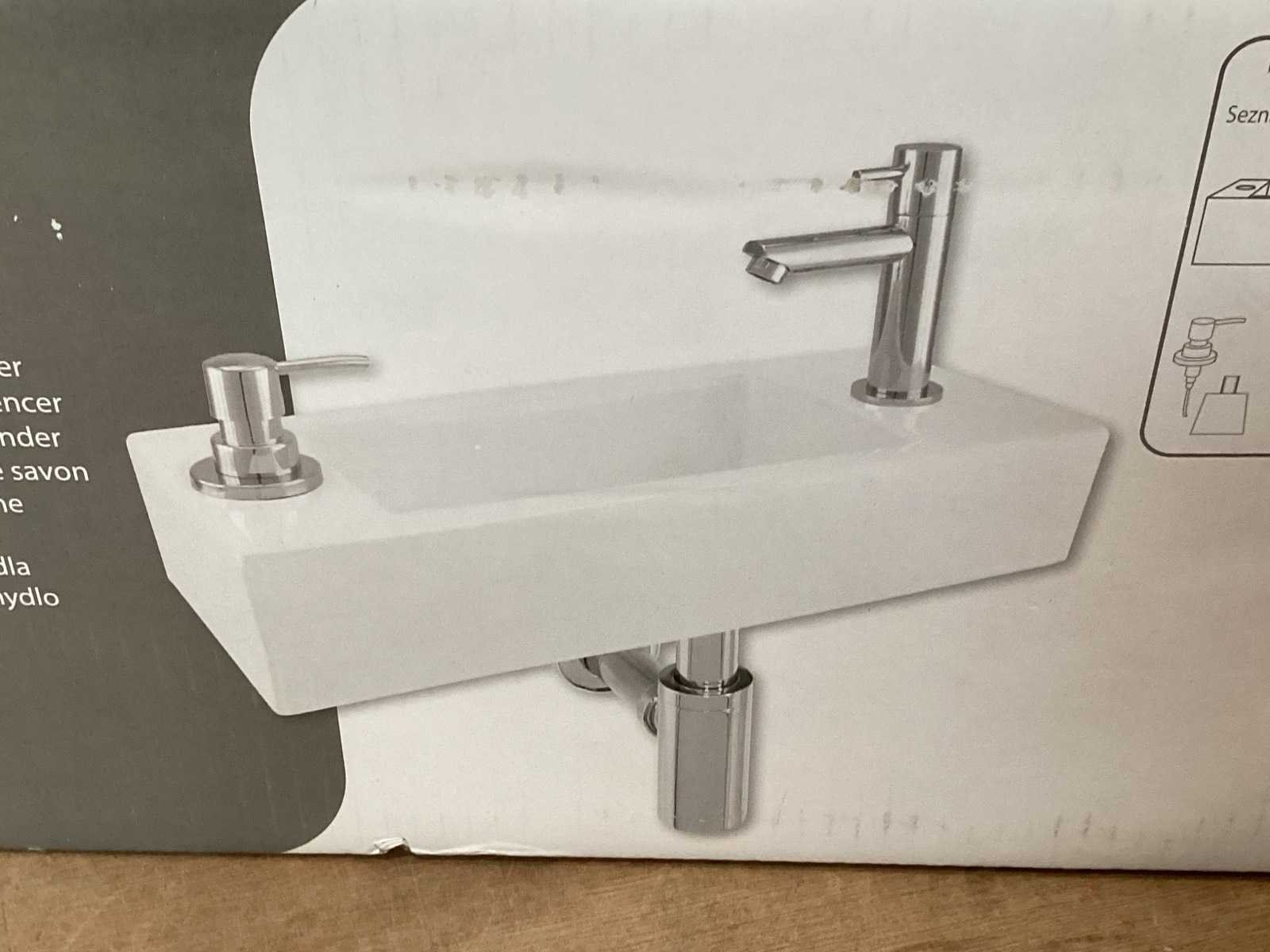 Wasbak wit keramiek compleet met chroom kraan, sifon, afvoerplug en zeeppomp. Gecontroleerde webshopretour