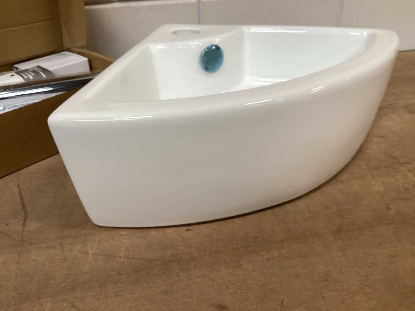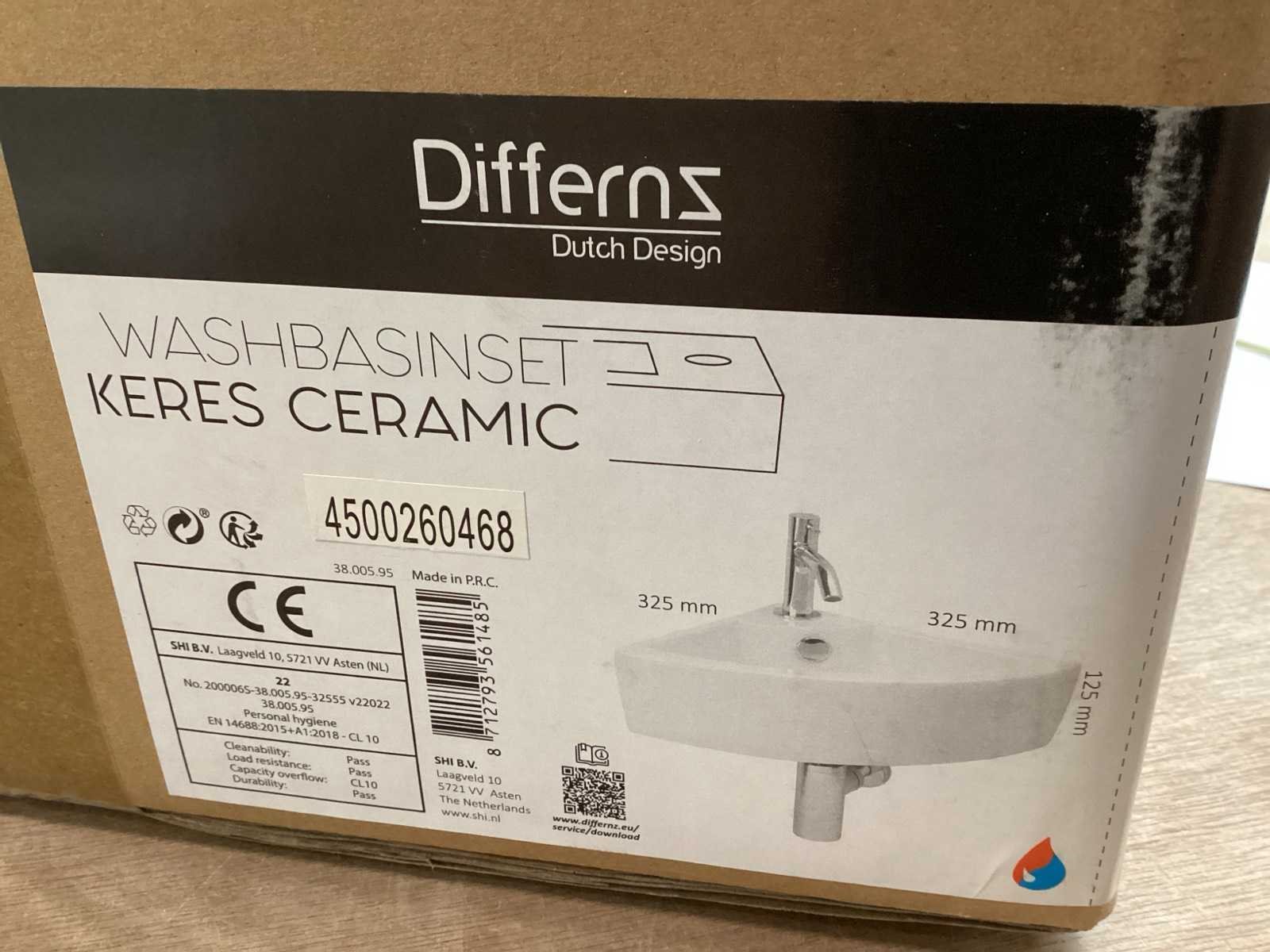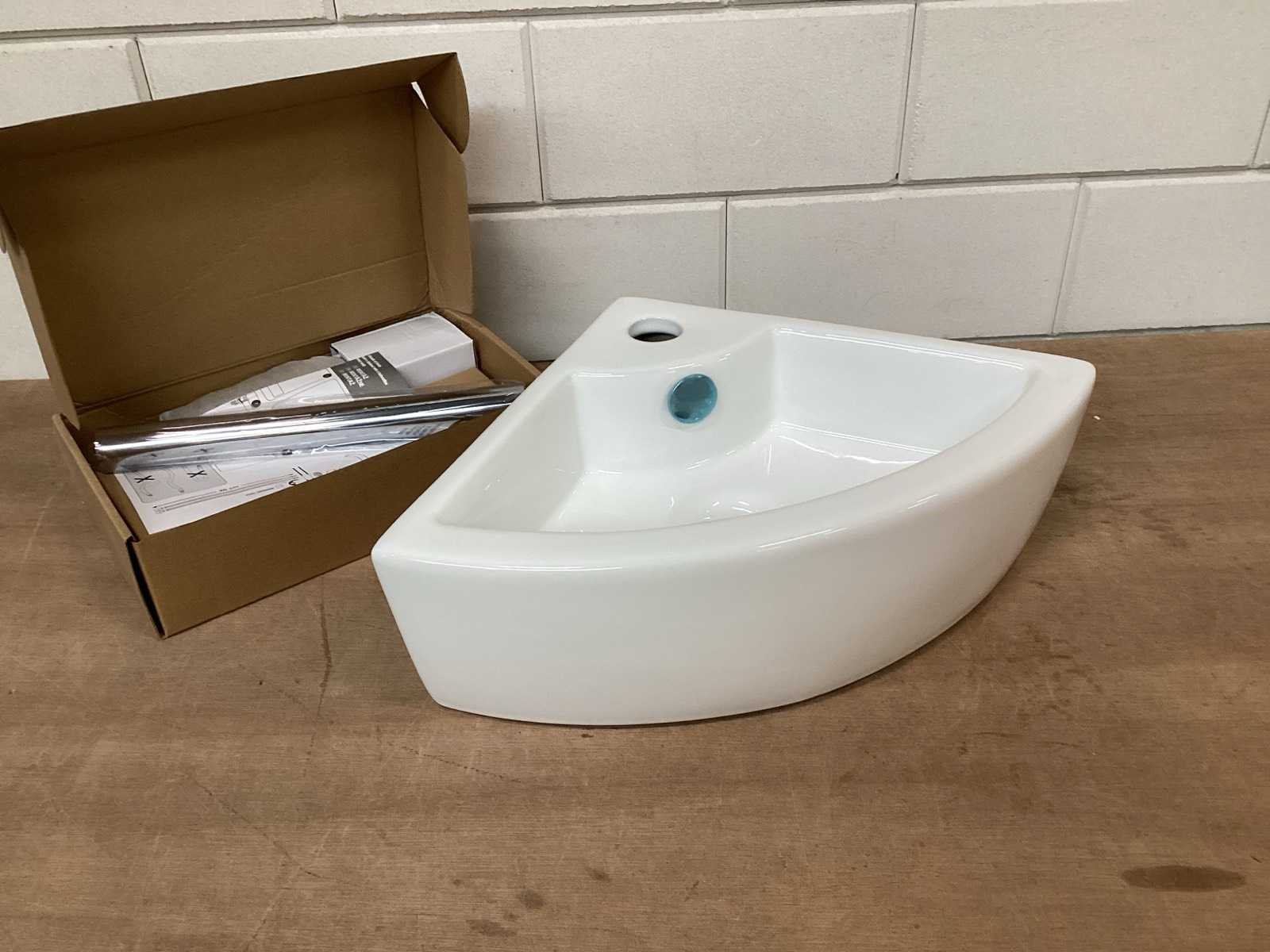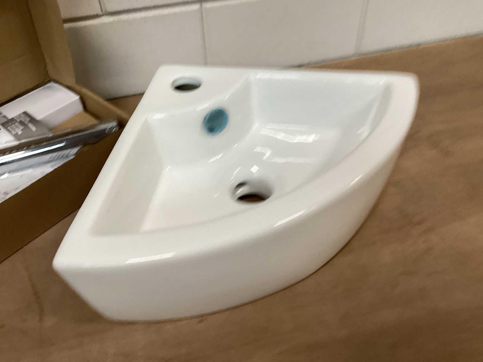 Wasbak wit keramiek compleet met chroom kraan, sifon, afvoerplug. Gecontroleerde webshopretour