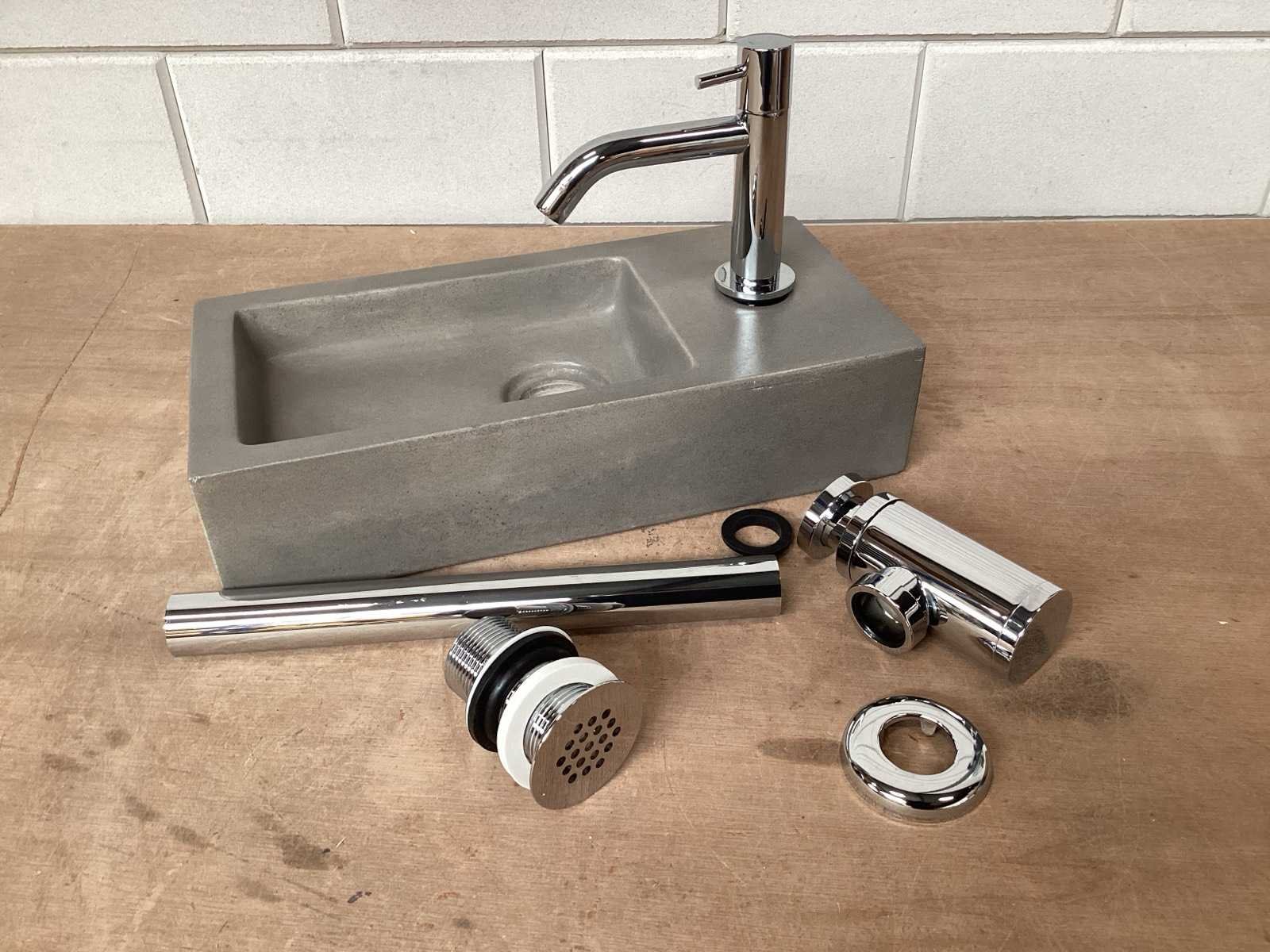 Toiletfontein beton, met chroom kraan, sifon, muurbuis en afvoerplug. Afmeting bak 38,5x18,5x9 cm. Complete set. Kraangat rechts