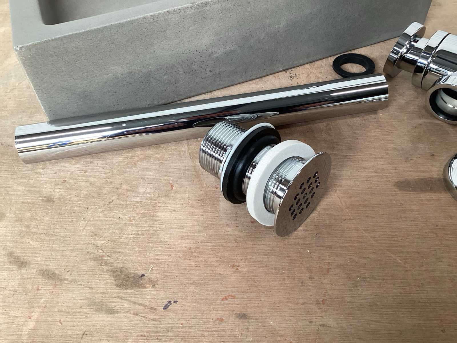 Toiletfontein beton, met chroom kraan, sifon, muurbuis en afvoerplug. Afmeting bak 38,5x18,5x9 cm. Complete set. Kraangat rechts