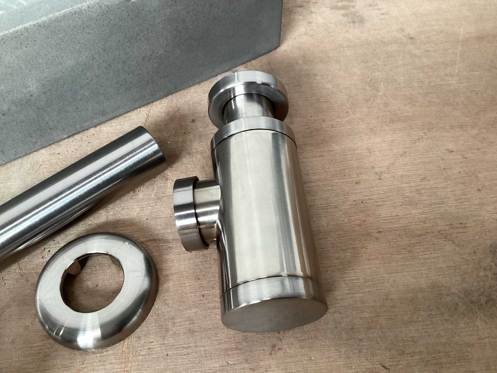 Toiletfontein beton, met mat RVS kraan, sifon, muurbuis en afvoerplug. Afmeting bak 38,5x18,5x9 cm. Complete set. Kraangat rechts