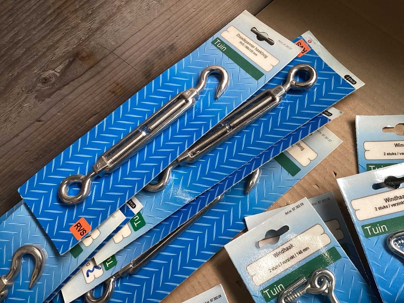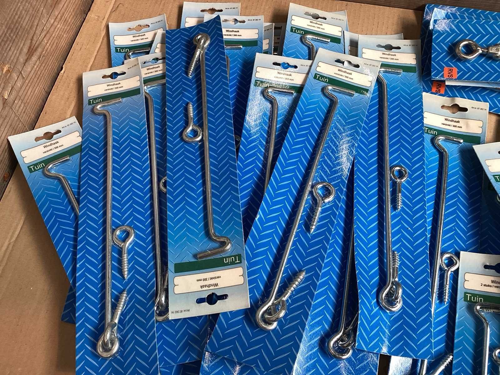 Diverse windhaken en draadspanners, verzinkt en RVS. Vermeld aantal betreft aantal verpakkingen
