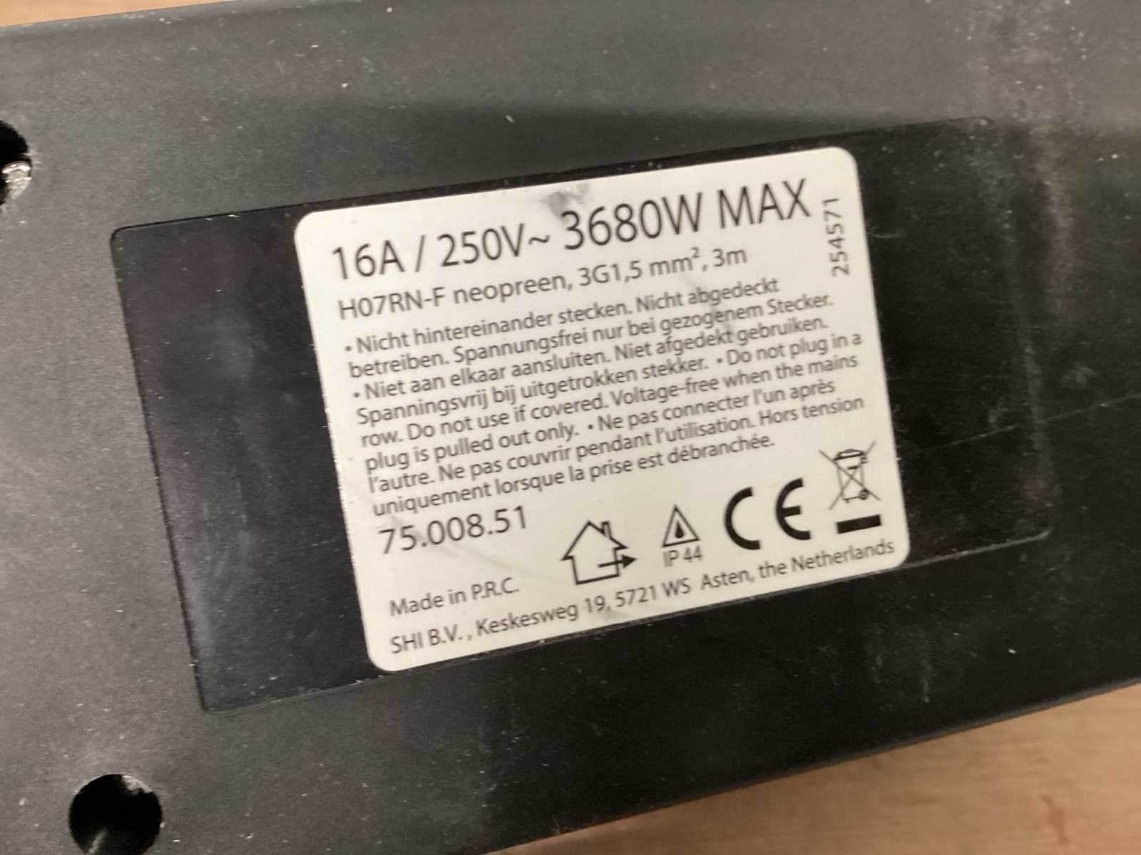 Spatwaterdichte stekkerdoos met schakelaar, rubber kabel 3 meter, 3x1,5 mm2 Merk: SHI
