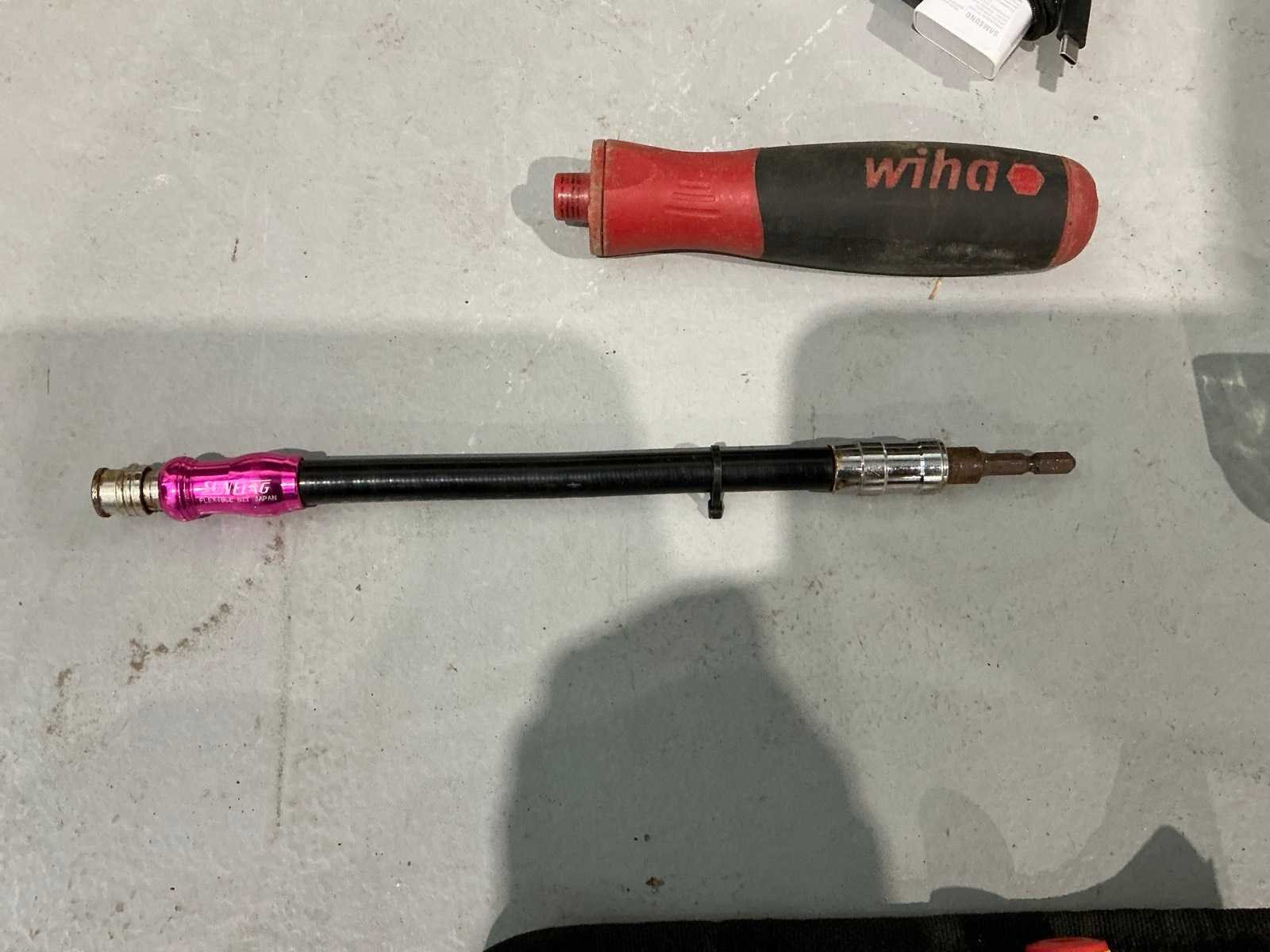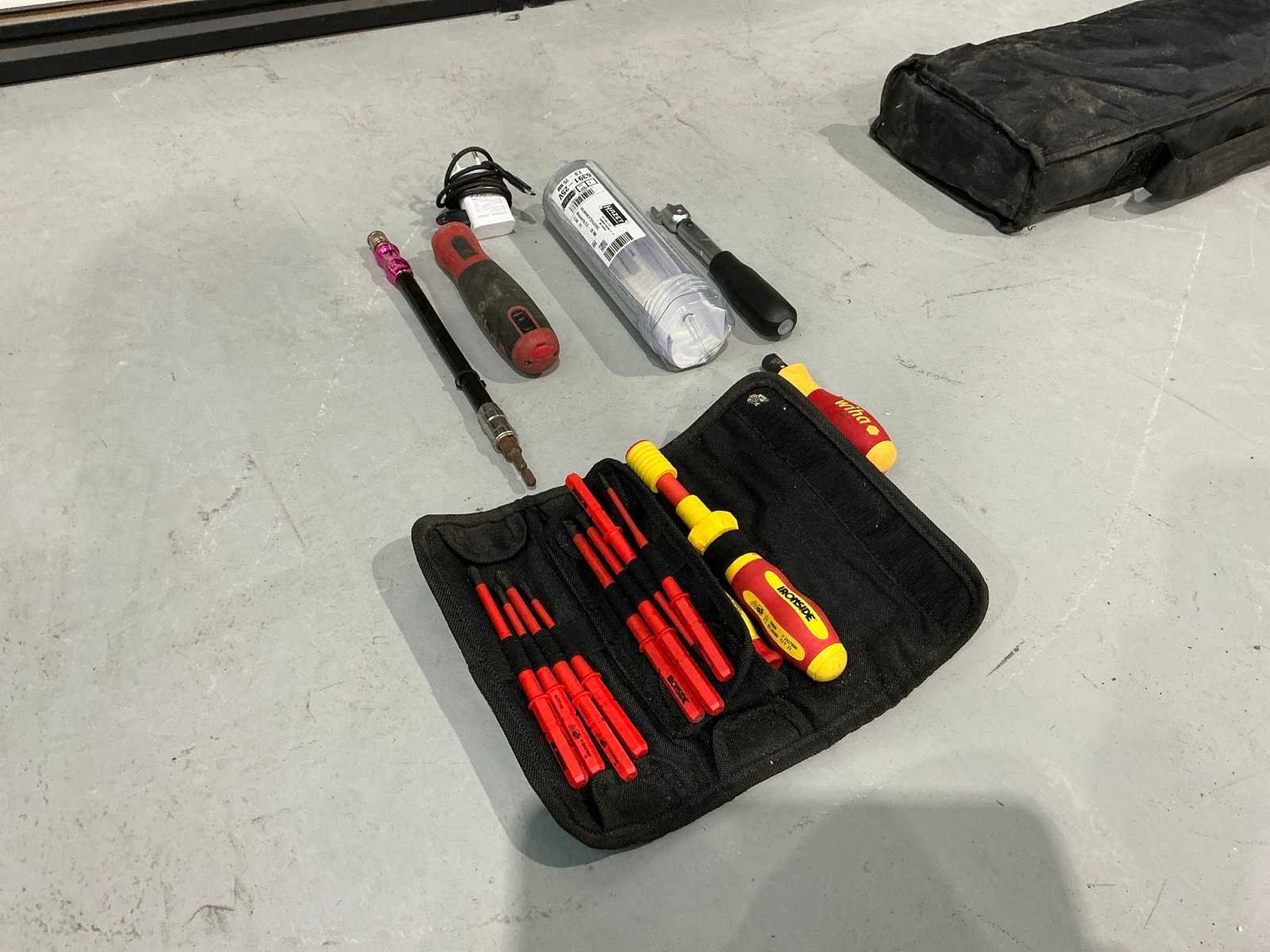 Wiha Speed E elektrische schroevendraaier met lader, Wiha momentschroevendraaier, Ironside geïsoleerde schroevendraaier set, Hazet 6391-25 momentsleutel en Sunflag flexibele bithouder