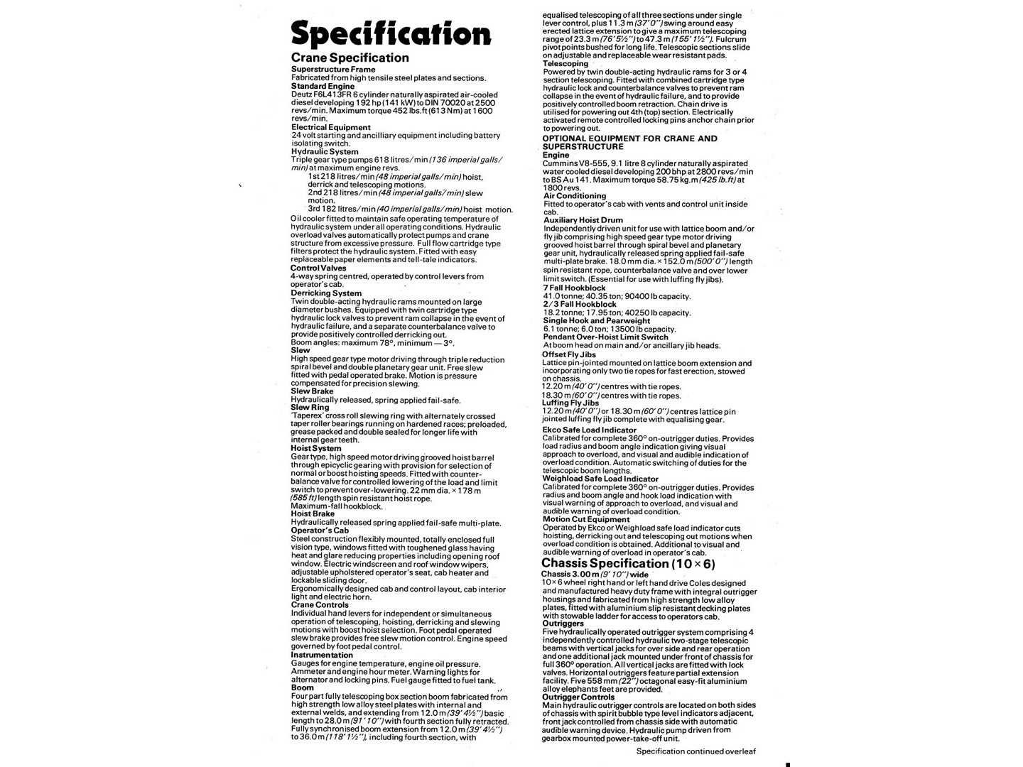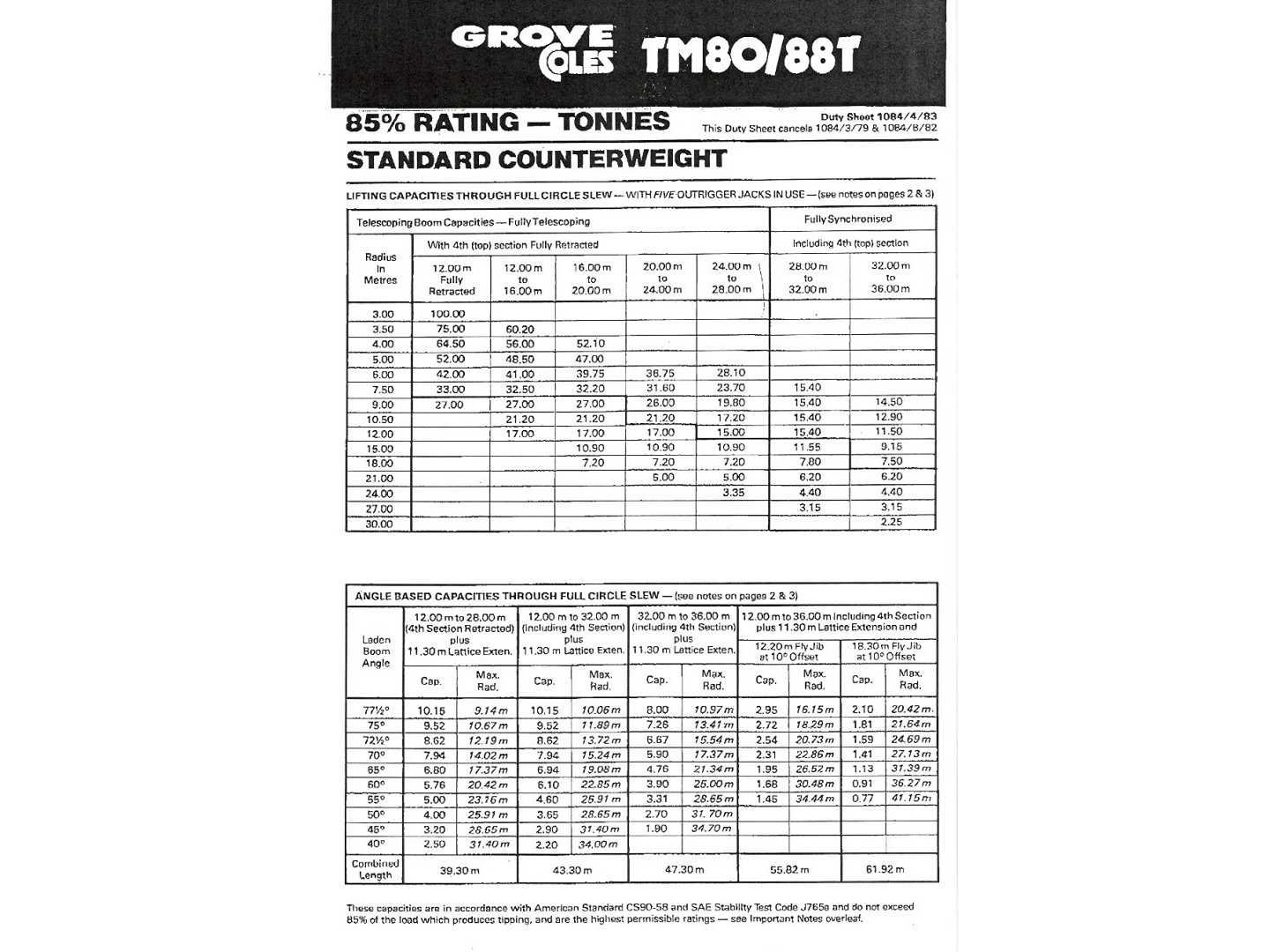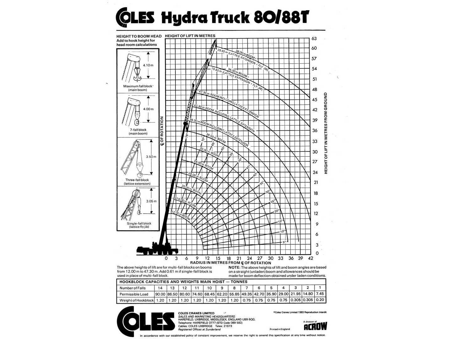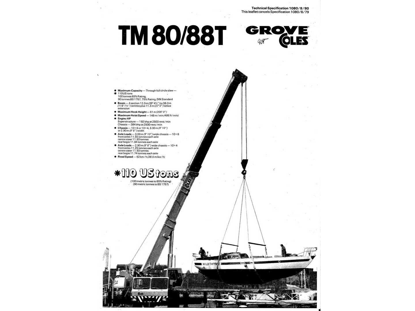 Chassisnummer 39969 Merk: Grove Type: Coles TM 80 Eigen gewicht: 59500kg Max. hijshoogte: 6.3m Merk motor: Deutz F6L413FR Totale afmeting L: 15290mm Max. hijscapaciteit: 58000kg