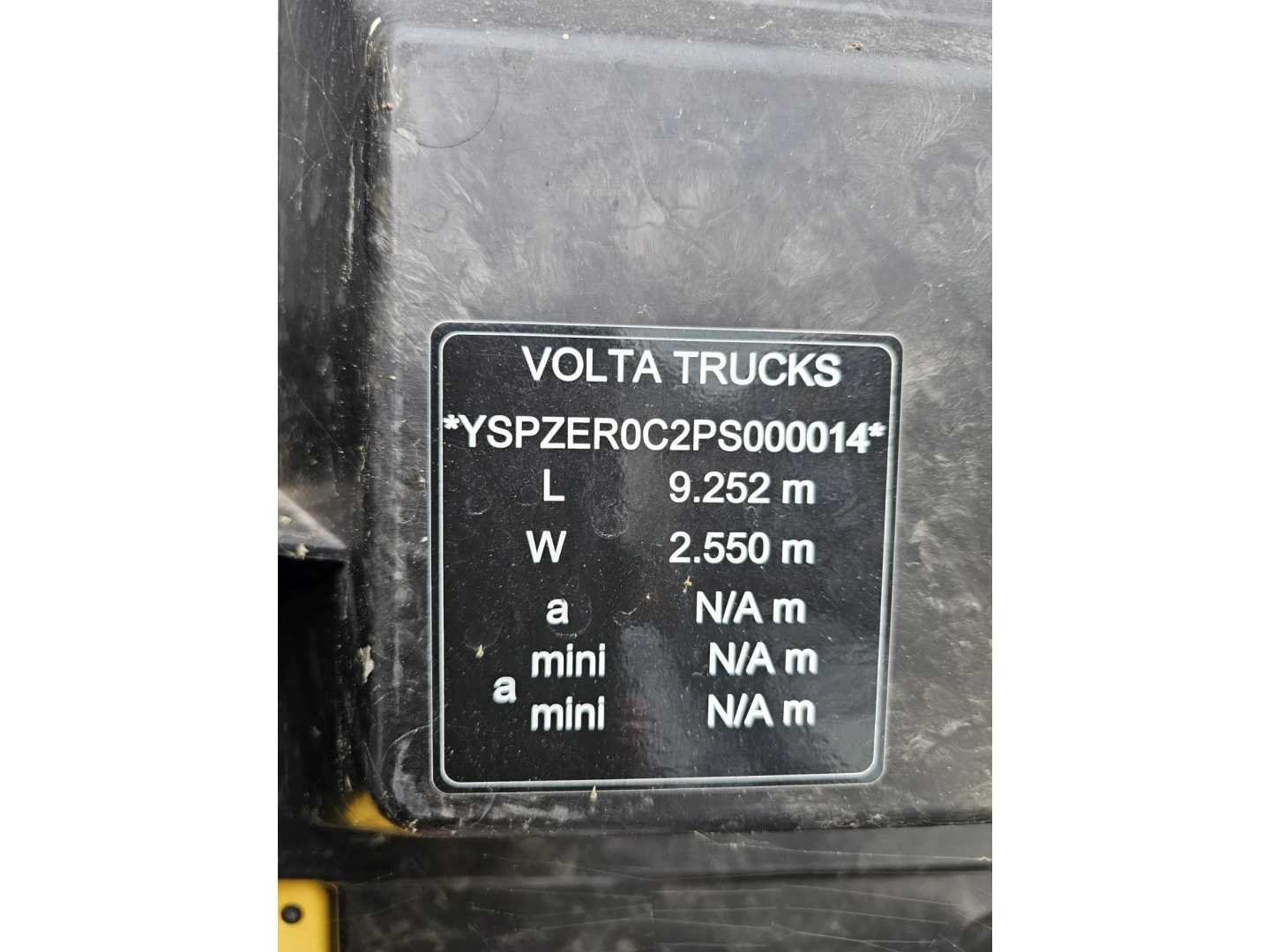 Voor as merk volta remschijven; vering lucht; maximale as last 9000 kg; achter as volta remtrommel; vering lucht; maximale as last 9000 kg; bandenmaat 285/70 r19,5; zijdeuren Kenteken: W-464-LT Merk: Volta Type: Full Elektric Bouwjaar: 2022 Chassisnummer VIN: YSPZER0C2PS000014 Aantal assen: 2 Laadvermogen: 10500kg Aantal sleutels: 1 Elektrisch: true Eigen gewicht: 5500kg Totale afmeting L: 9250mm Totale afmeting Breedte: 2550mm Afgelezen kilometerstand: 350km