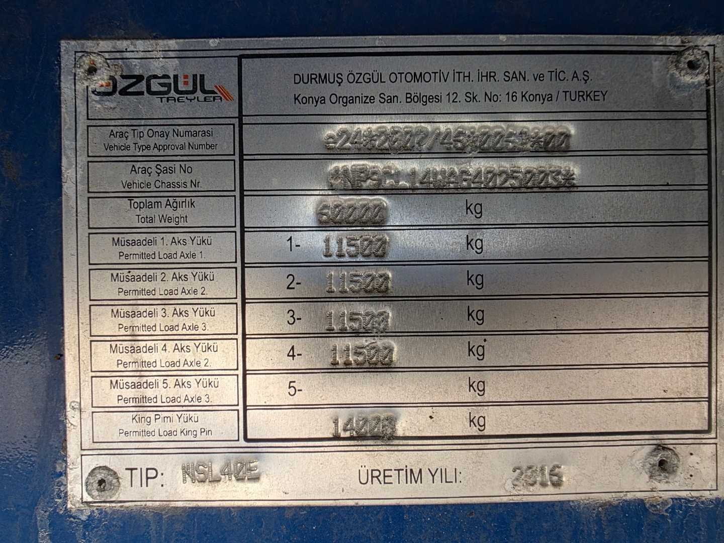 Merk: Ozgul Type: L14 Bouwjaar: 2016 Chassisnummer VIN: NP9CL14WWAG4025003 Kenteken: QADN318 Aantal assen: 4 Laadvermogen: 33420kg Eigen gewicht: 26820kg Totale afmeting L: 18000mm Totale afmeting Breedte: 2550mm Totale afmeting Hoogte: 1419mm