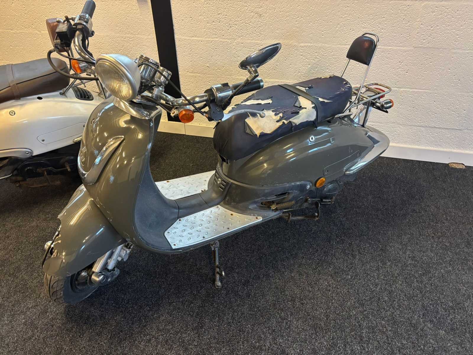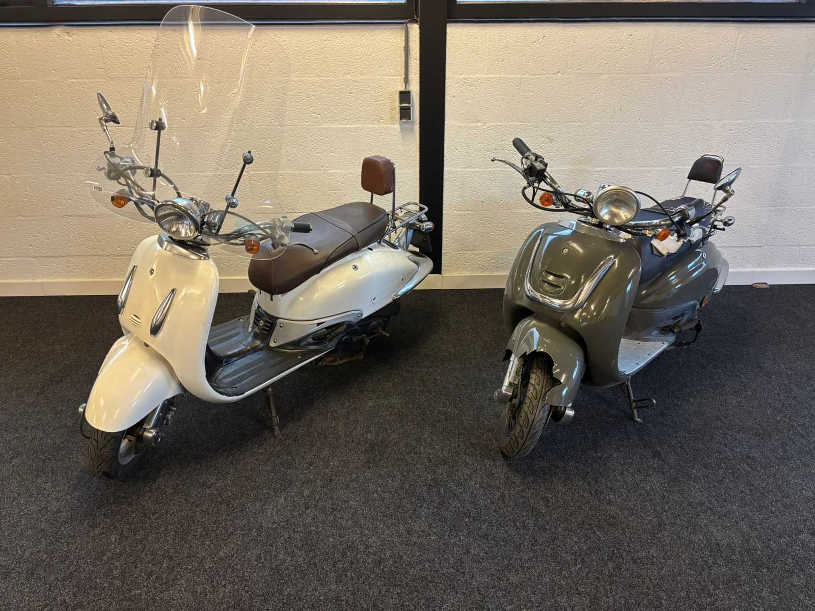 2x scooter Witte scooter start + rijdt Grijze scooter start niet Merk: Benzhou YiYing Model: Snorscooter Type: Sixties / Retro Handelsbenaming: 50RETRO Snelheid: 25km/h Kenteken: D263jt Datum eerste toelating: 2010-04-22 Bouwjaar: 2010 Brandstof: Benzine Kleur: niet van toepassing Afgelezen kilometerstand: 12671km