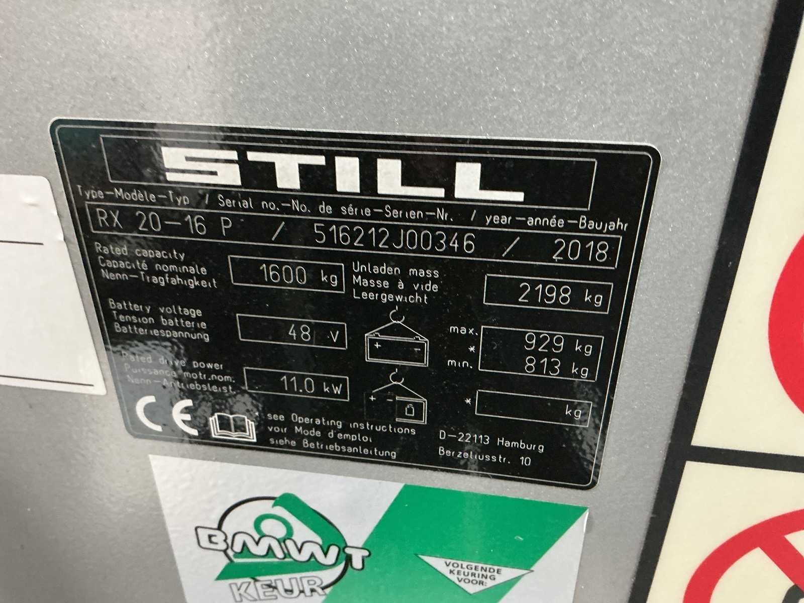 Uitschuifbare vorken, 800mm tot 1200mm Merk: STILL Type: RX20-16P Bouwjaar: 2018 Serienummer: 516212J00346 Mast: Triplex Aantal wielen: 4 Afgelezen urenstand: 9091 Free-lift: true Side-shift: true Triple mast: true Hefvermogen: 1600kg Lepellengte: 800mm Hefhoogte: 4920mm Minimale doorrijhoogte: 2160mm