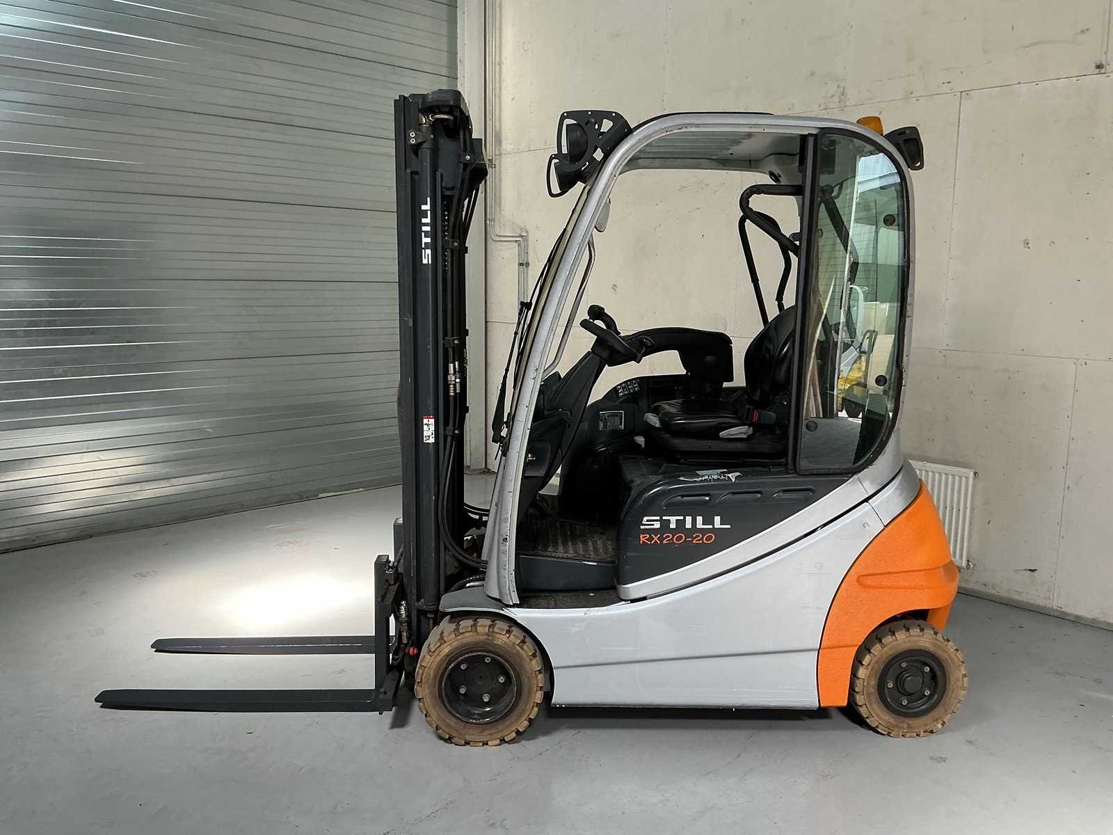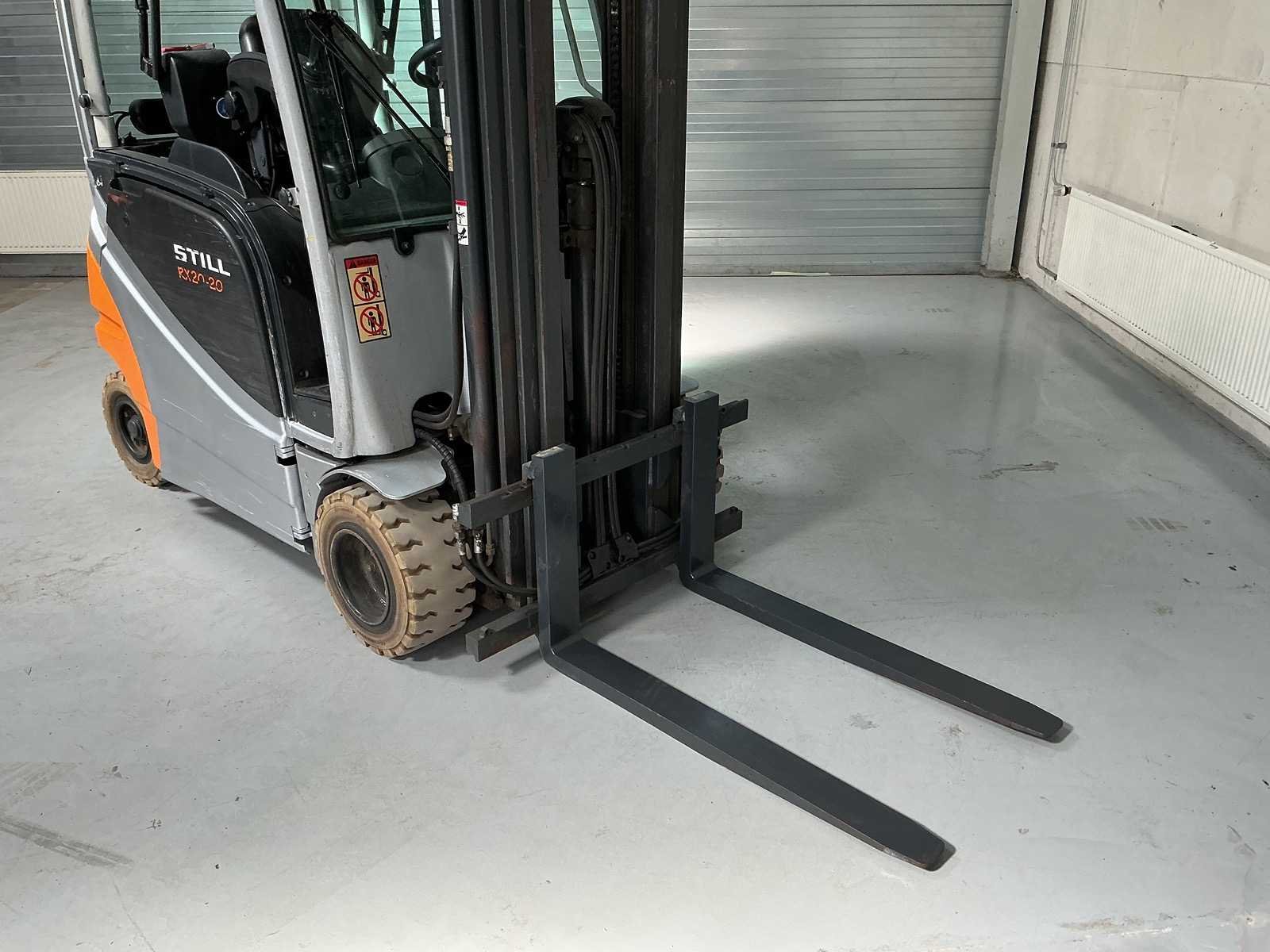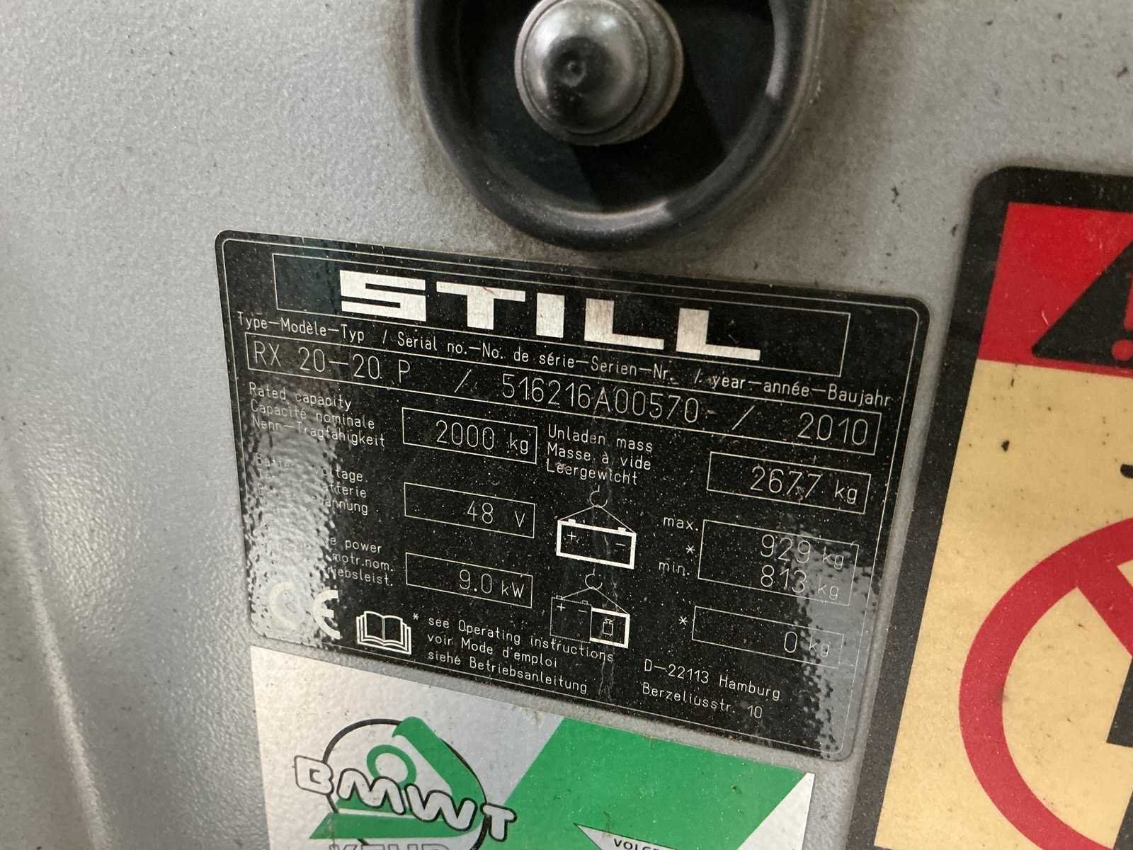 Merk: STILL Type: RX20-20P Bouwjaar: 2010 Serienummer: 516216A00570 Mast: Triplex Aantal wielen: 4 Afgelezen urenstand: 8175 Free-lift: true Side-shift: false Triple mast: true Hefvermogen: 2000kg Lepellengte: 1000mm Hefhoogte: 4780mm Minimale doorrijhoogte: 2160mm