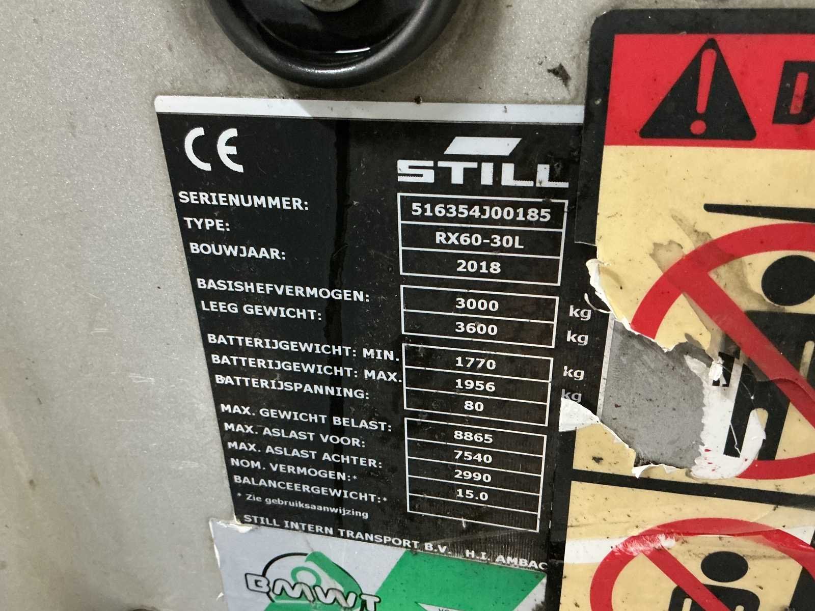 Merk: STILL Type: RX60-30 Bouwjaar: 2018 Serienummer: 516354J00185 Mast: Triplex Aantal wielen: 4 Afgelezen urenstand: 10691 Free-lift: true Side-shift: true Hydraulisch verstelbare lepels: true Triple mast: true Hefvermogen: 3000kg Lepellengte: 1600mm Hefhoogte: 4590mm Minimale doorrijhoogte: 2175mm