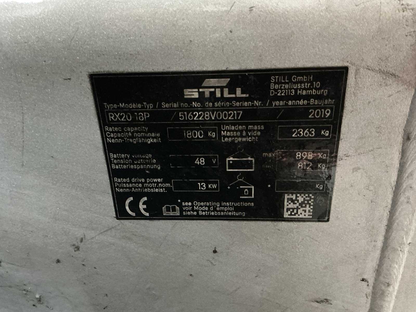 Merk: STILL Type: RX20-18P Bouwjaar: 2018 Serienummer: 516228V00217 Mast: Triplex Aantal wielen: 4 Afgelezen urenstand: 6157 Free-lift: true Side-shift: true Triple mast: true Hefvermogen: 1800kg Lepellengte: 900mm Hefhoogte: 3180mm Minimale doorrijhoogte: 2160mm