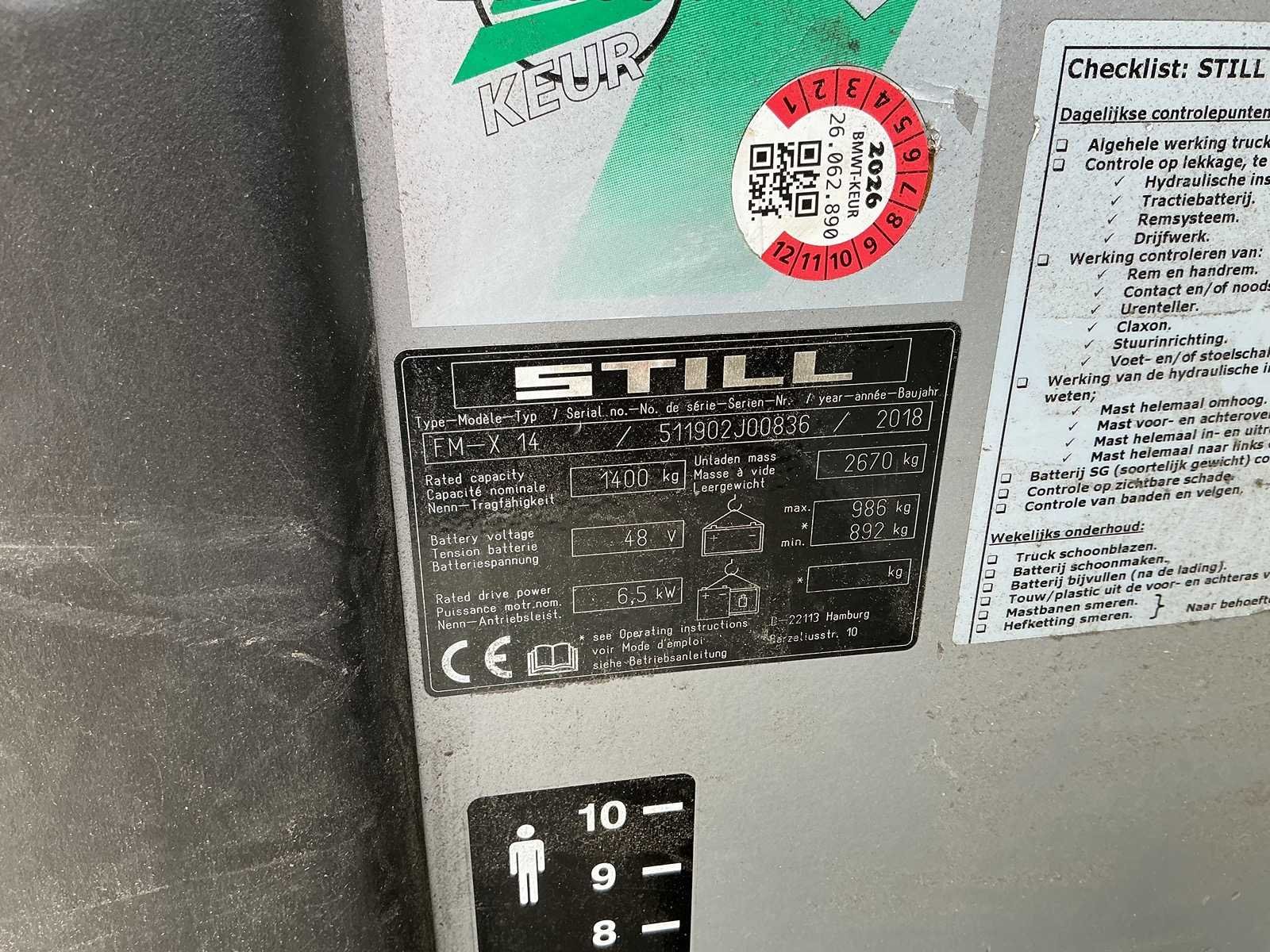 Merk: STILL Type: FMX-14 Bouwjaar: 2018 Serienummer: 511902J00836 Mast: Triplex Afgelezen urenstand: 8493 Free-lift: true Side-shift: true Triple mast: true Hefvermogen: 1400kg Lepellengte: 1150mm Hefhoogte: 7100mm Minimale doorrijhoogte: 2900mm