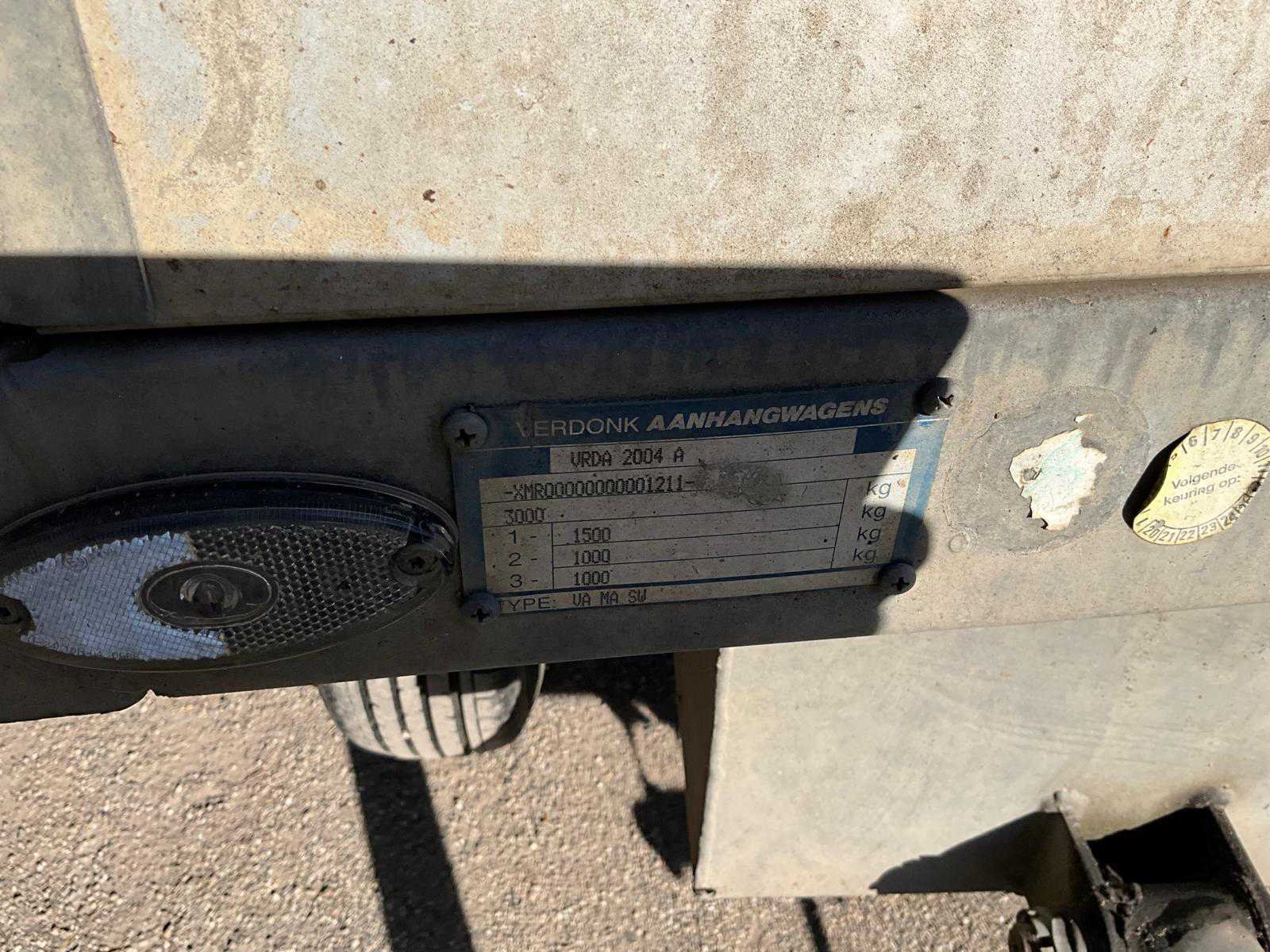 Merk: Verdonk Bouwjaar: 2000 Laadbak afmeting l: 500cm Laadbak afmeting b: 176cm Ledig gewicht: 790kg Laadvermogen: 2710kg Datum eerste toelating: 2000-07-03 Datum eerste toelating (NL): 2000-07-03 Kenteken: WY-02-YK Kentekenpapieren compleet?: true