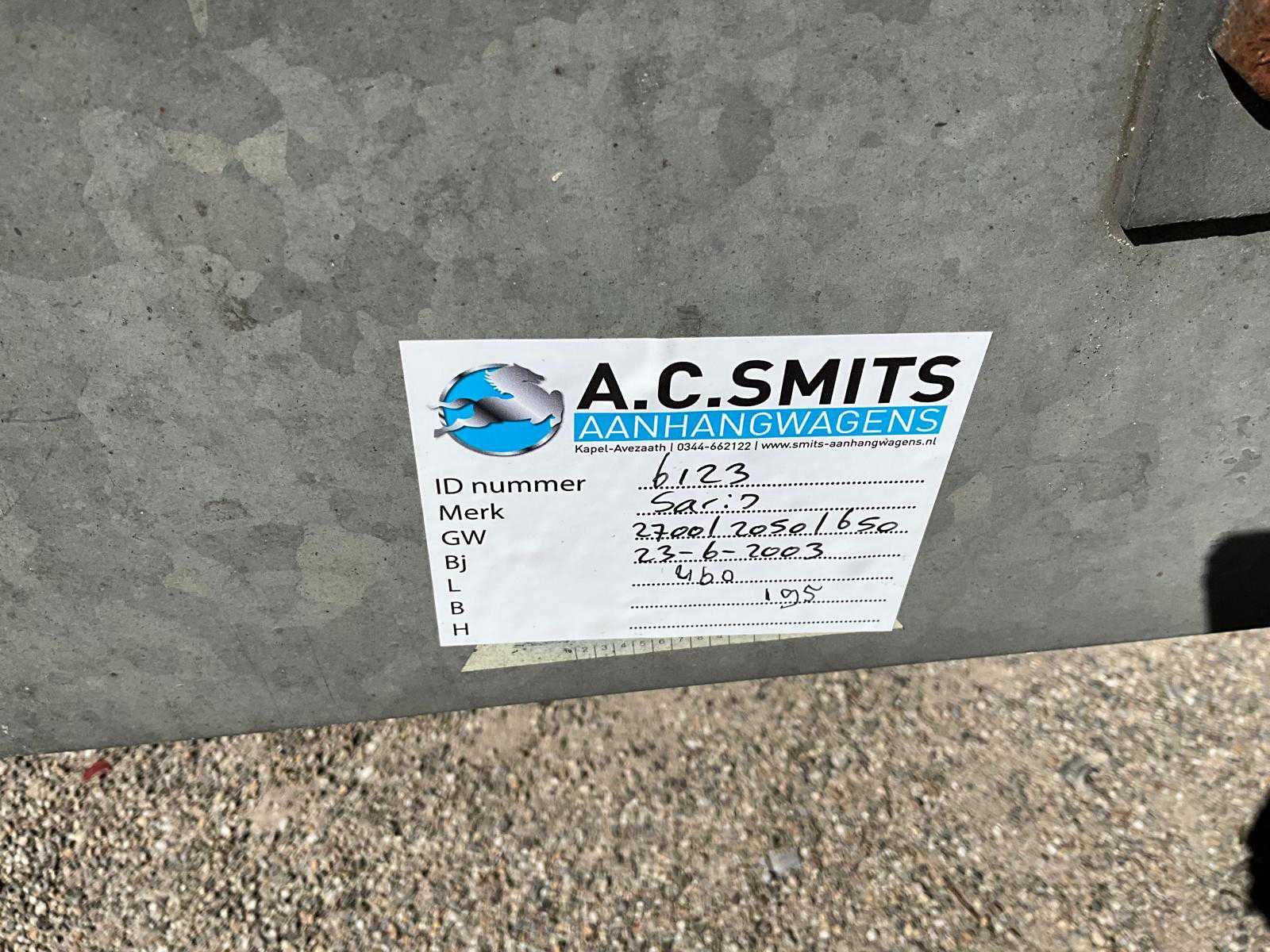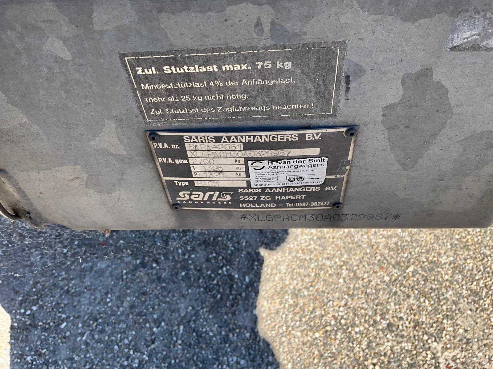 Merk: Saris Bouwjaar: 2003 Laadbak afmeting l: 460cm Laadbak afmeting b: 195cm Ledig gewicht: 650kg Laadvermogen: 2050kg Datum eerste toelating: 2003-06-23 Datum eerste toelating (NL): 2003-06-23 Kenteken: WH-XD-33 Kentekenpapieren compleet?: true