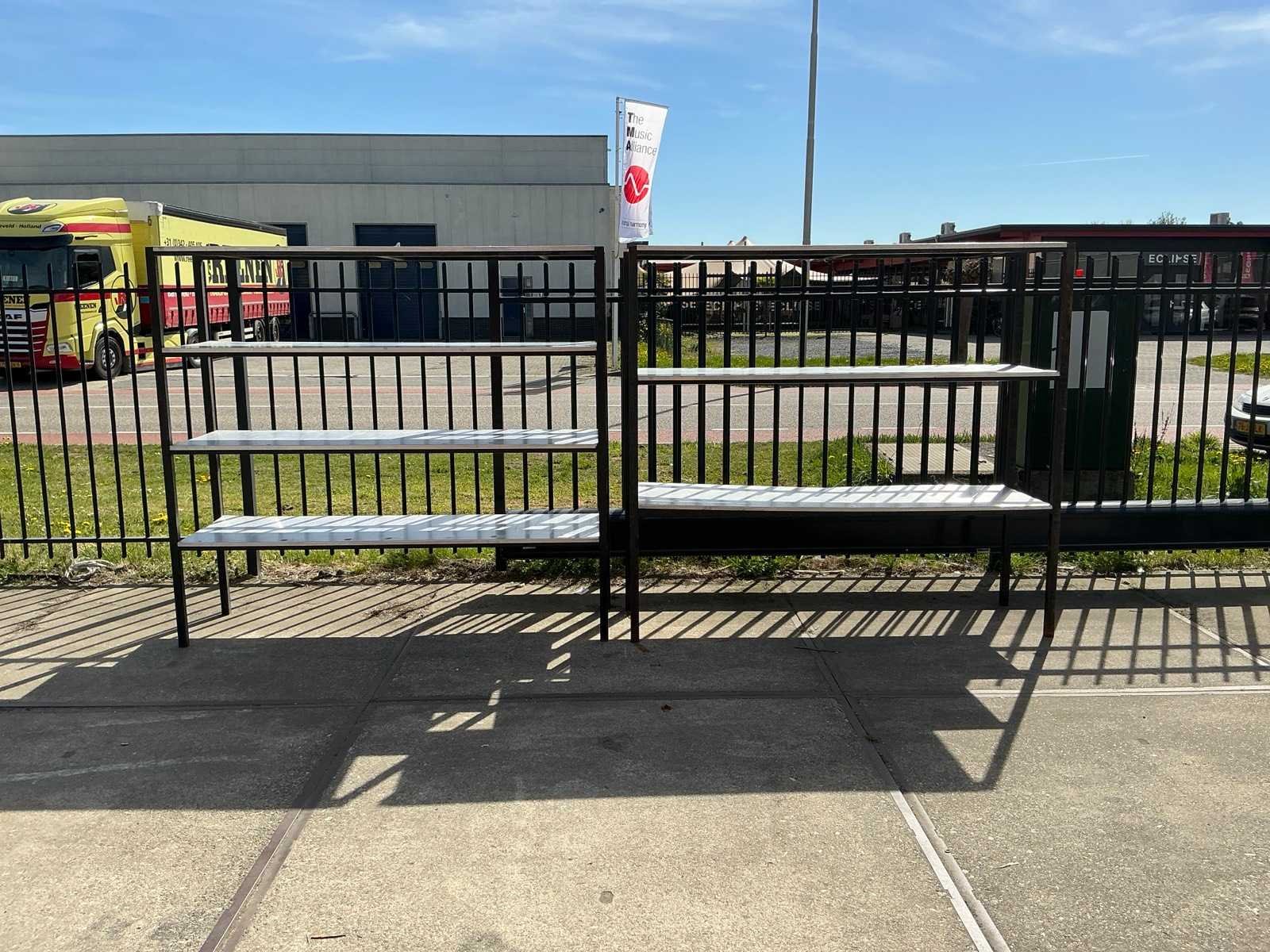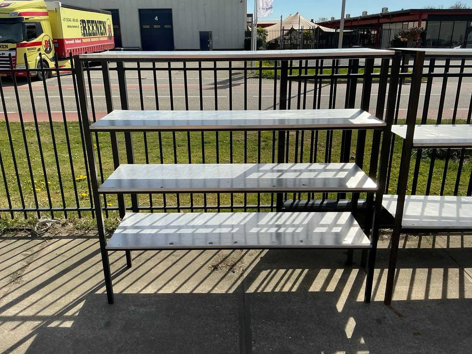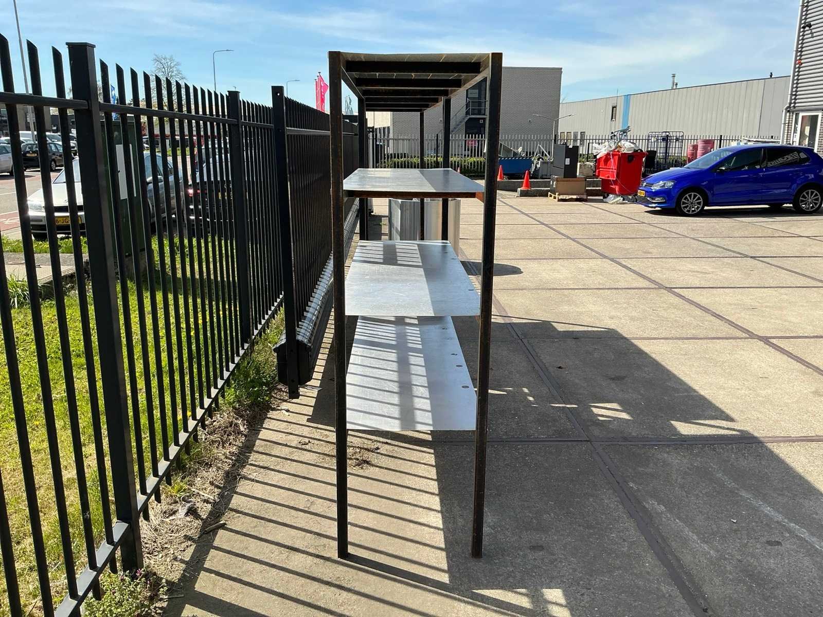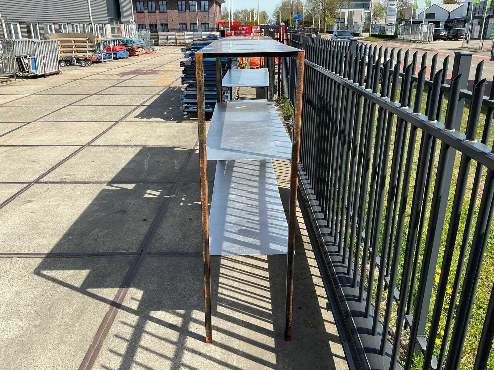 1 blad zit los, stalen poten zijn verroest Sectie afm. b: 2080mm Sectie diepte: 575mm Sectie afm. h: 1900mm Aantal legborden: 7 Materiaal: Staal,IJzer Lengte: 57.5cm Breedte: 208cm Hoogte: 190cm