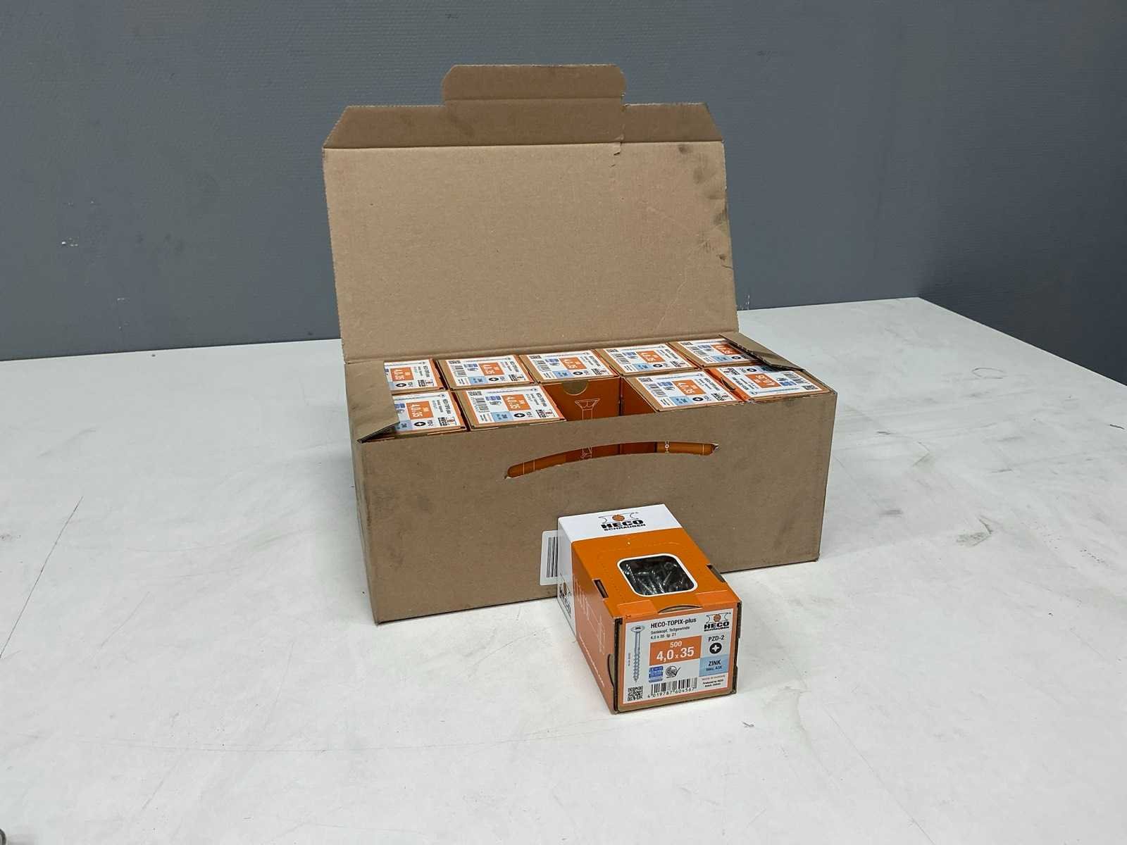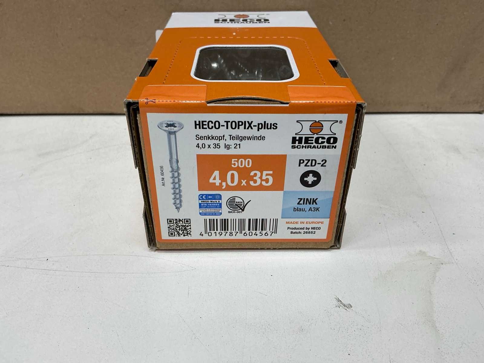 Verzonken kop, volledig schroefdraad, 4x35 mm 500 stuks per doos, 10 dozen Merk: Heco Type: Topix Plus Materiaal: Zink