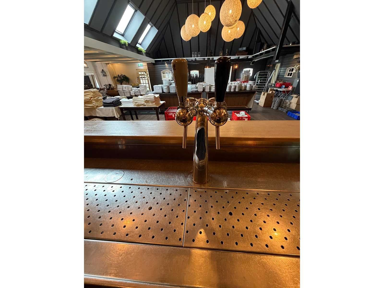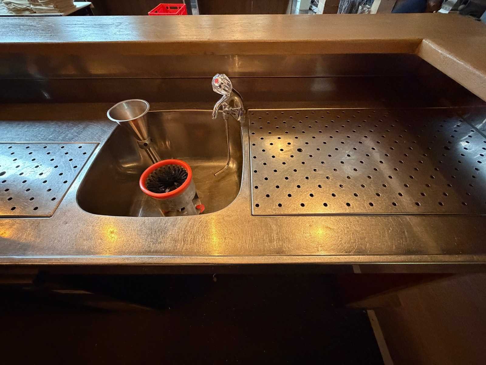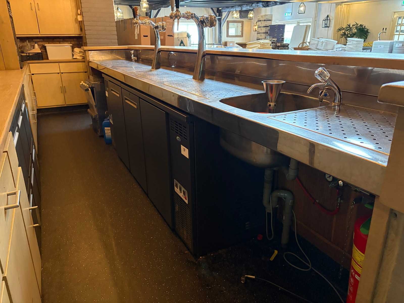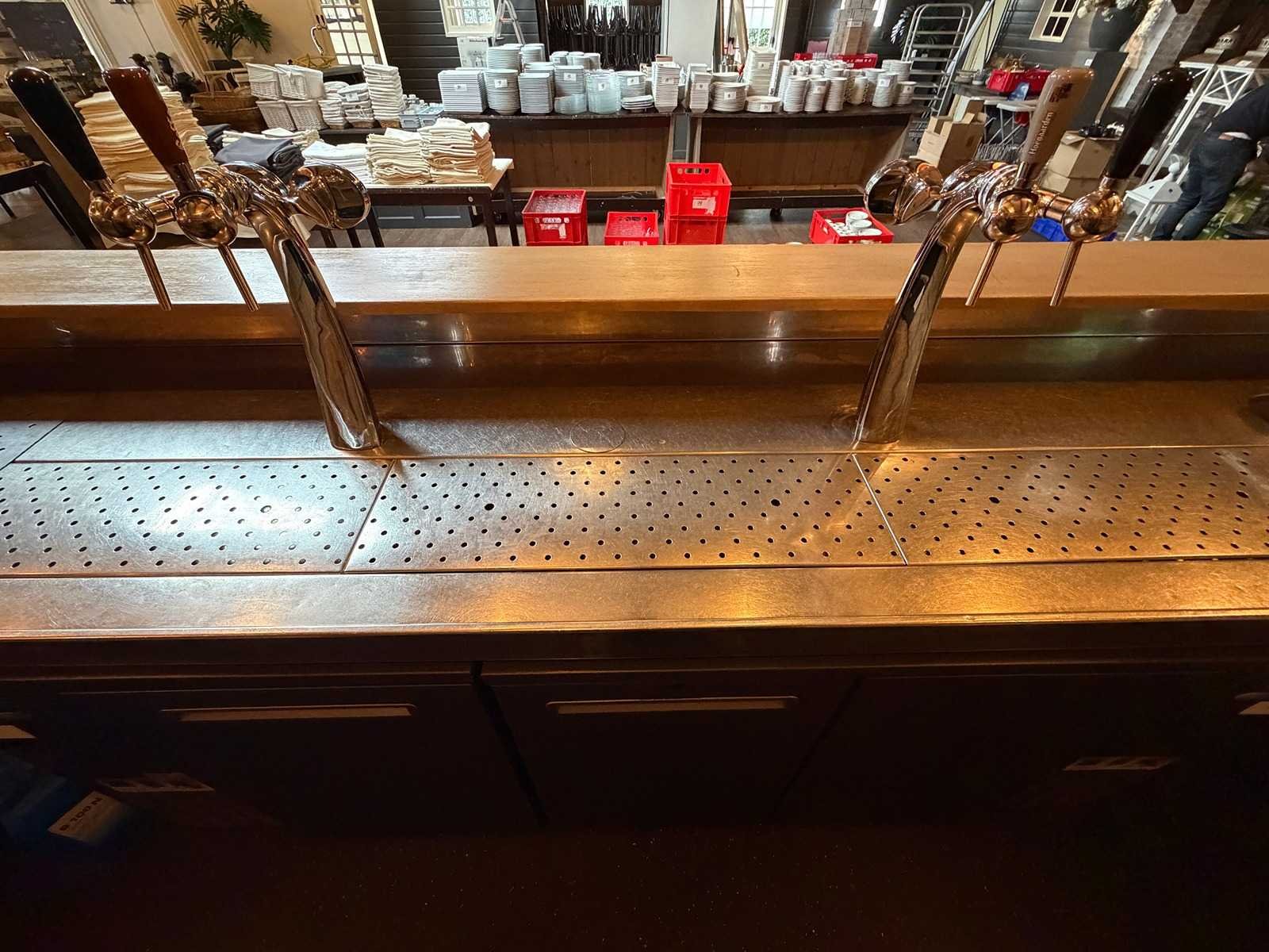 Compleet barmeubel met 2 dubbele tapkranen, achterwand, lekblad, spoelbak, etc.