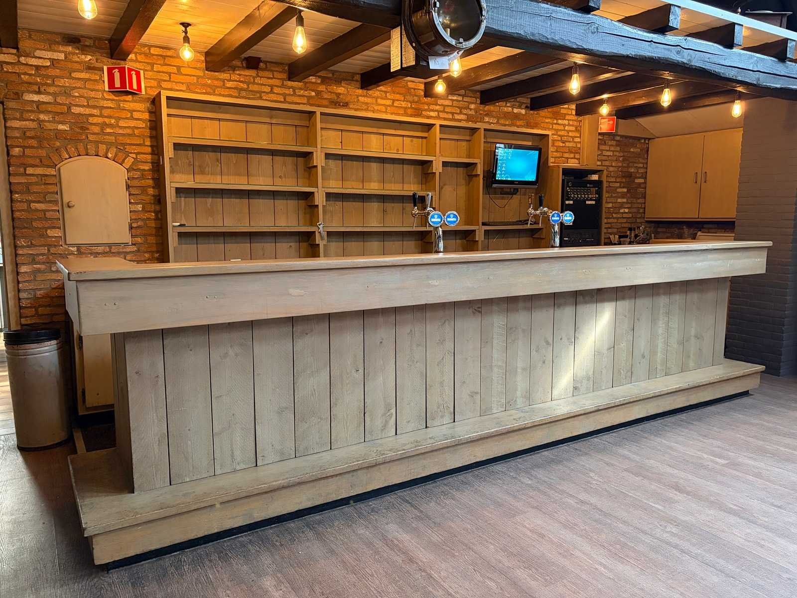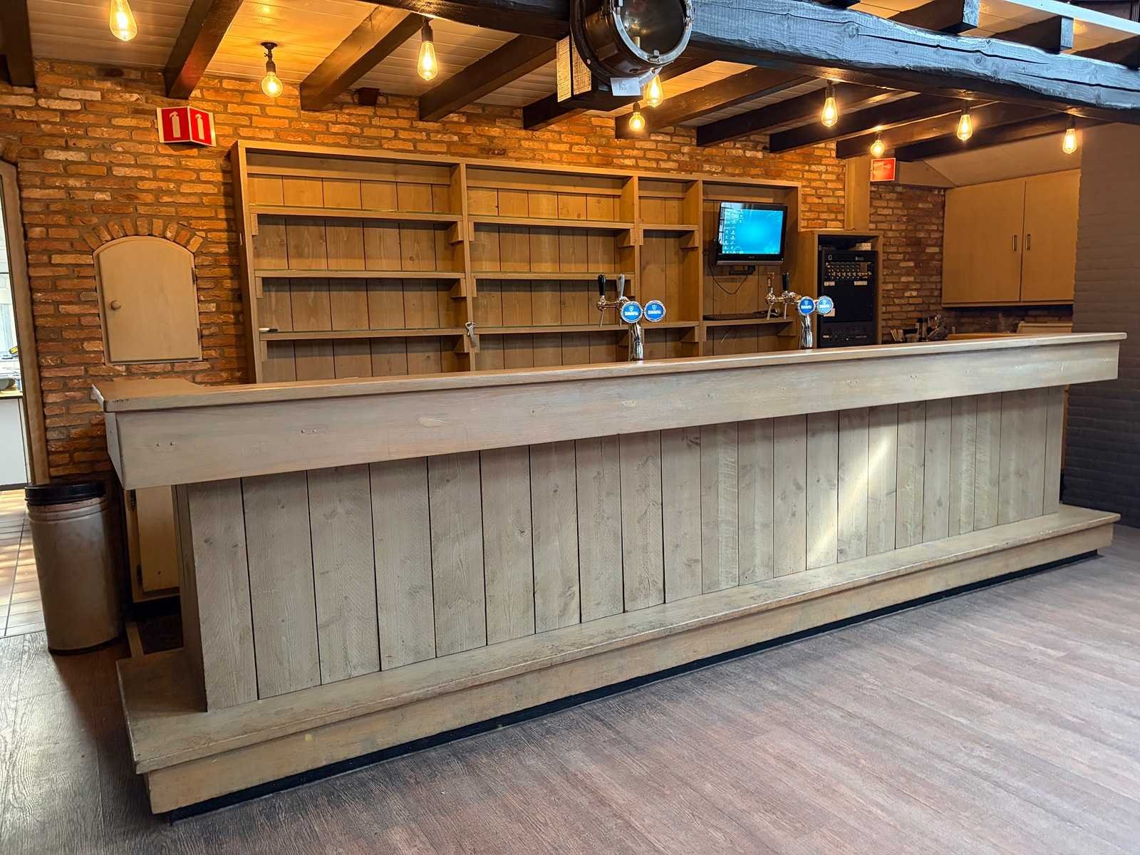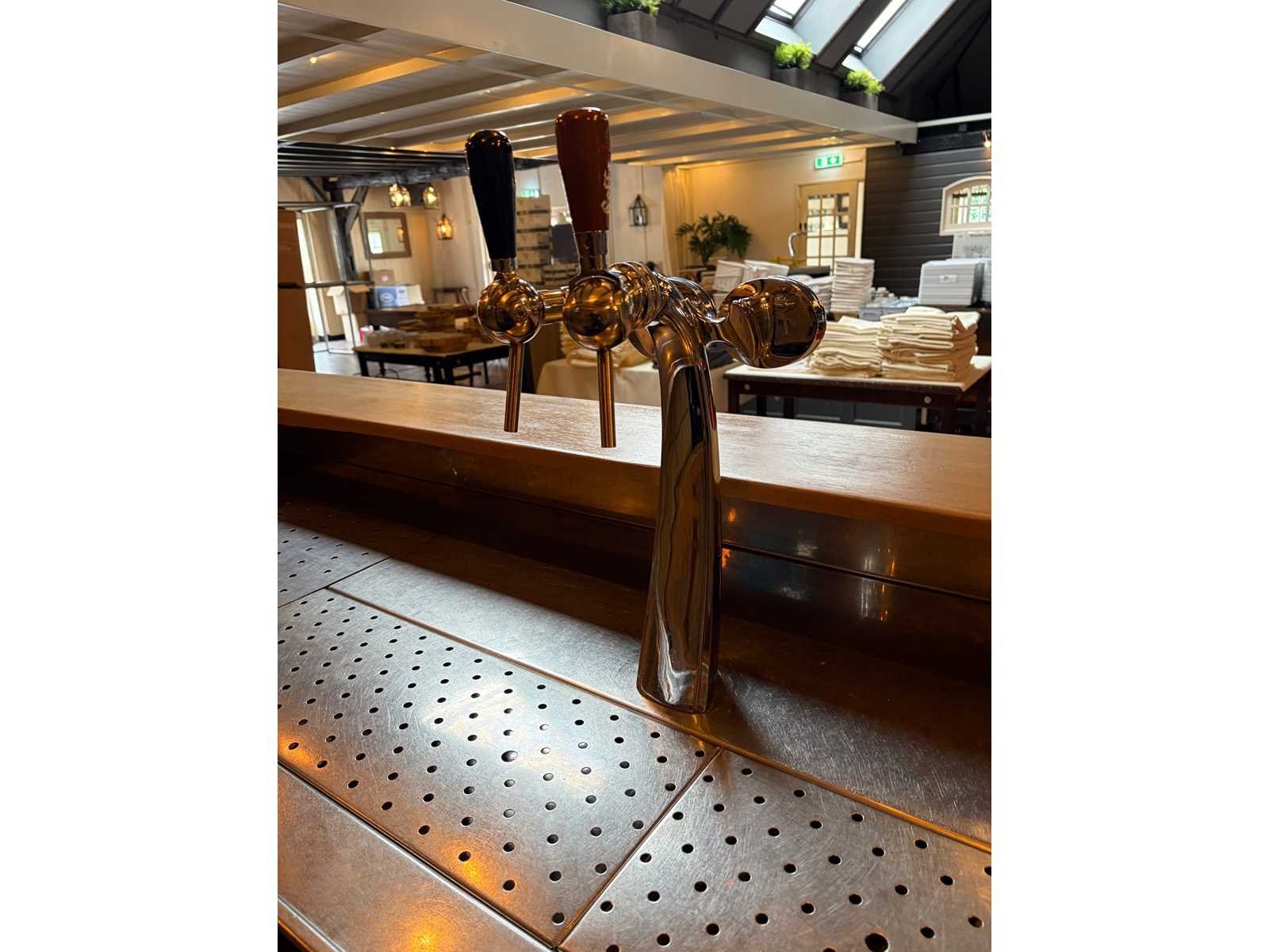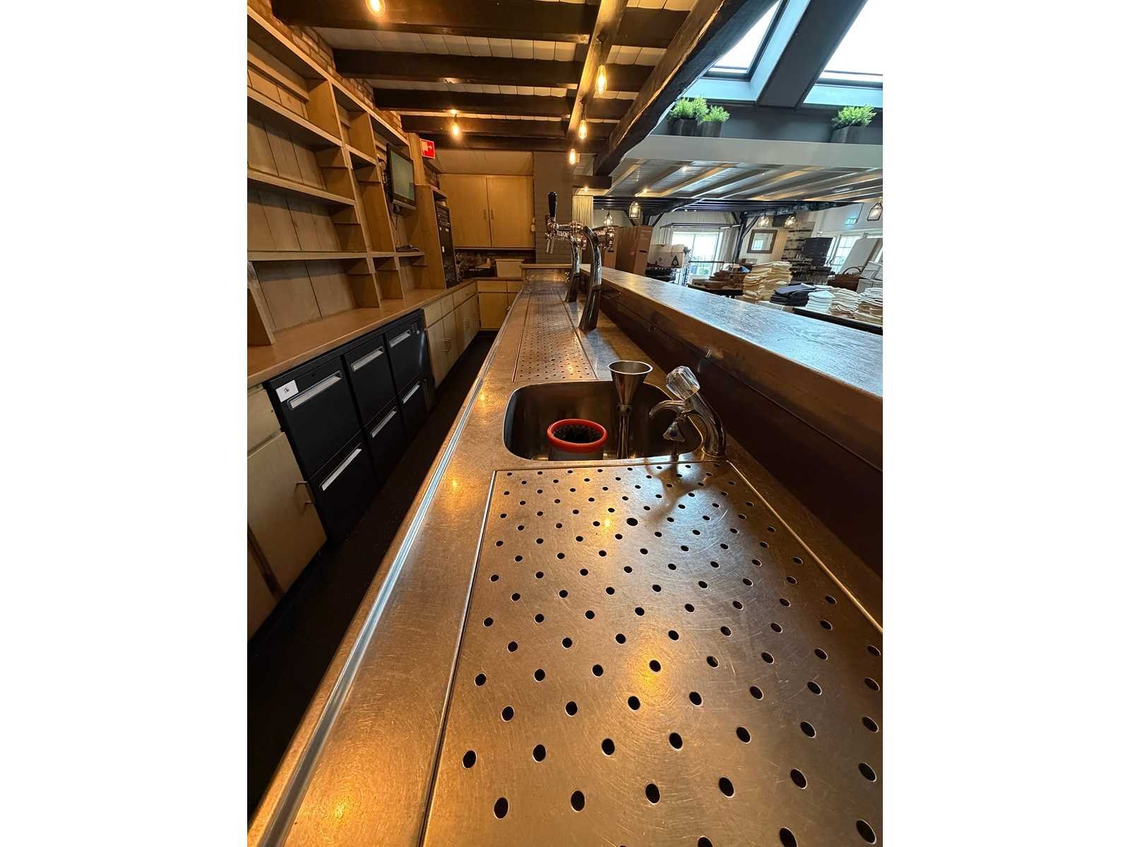 Compleet barmeubel met 2 dubbele tapkranen, achterwand, lekblad, spoelbak, etc.