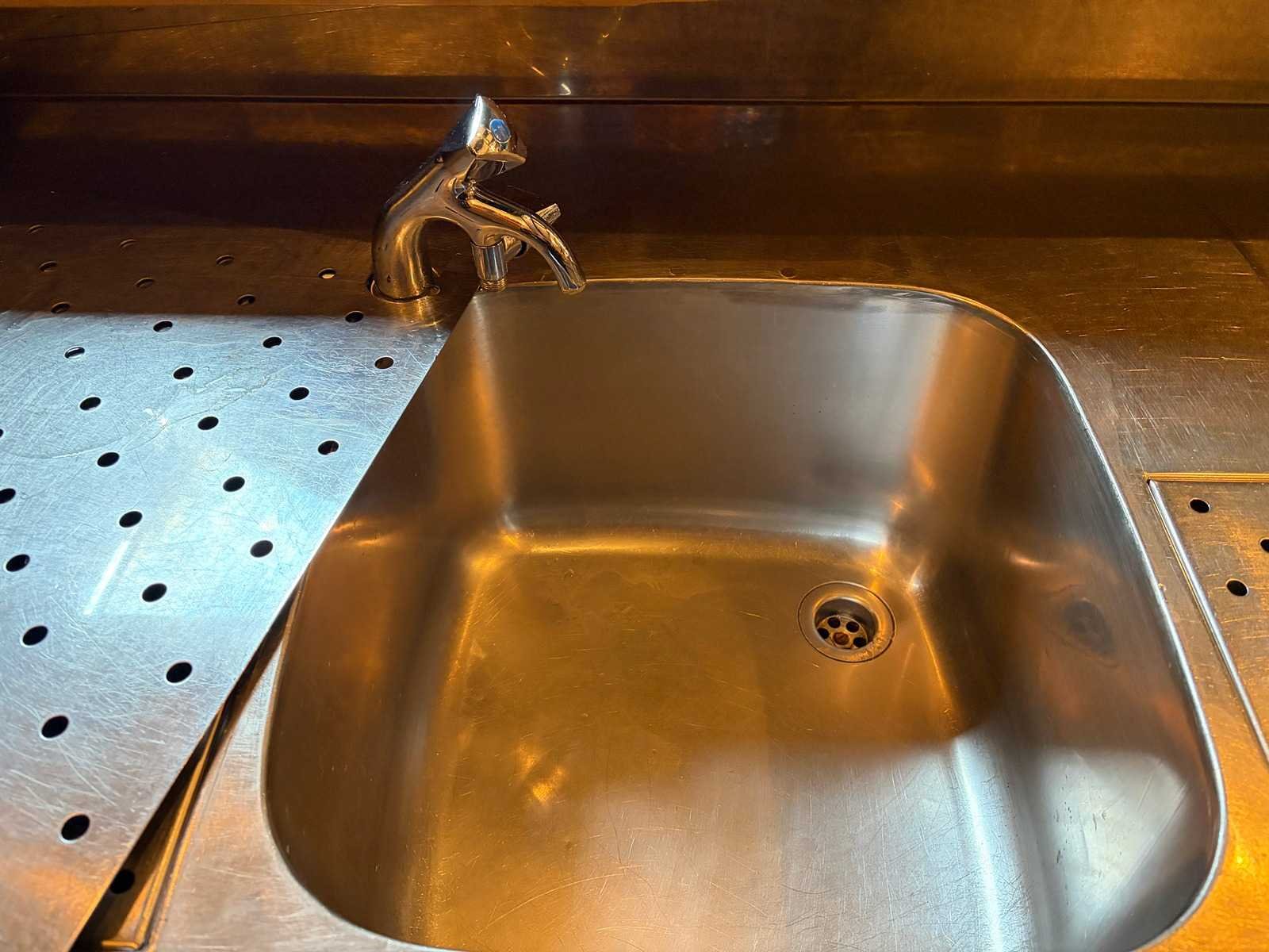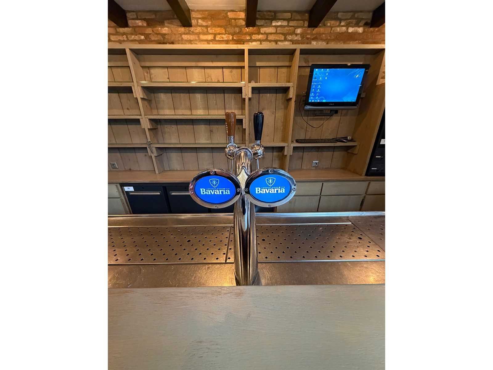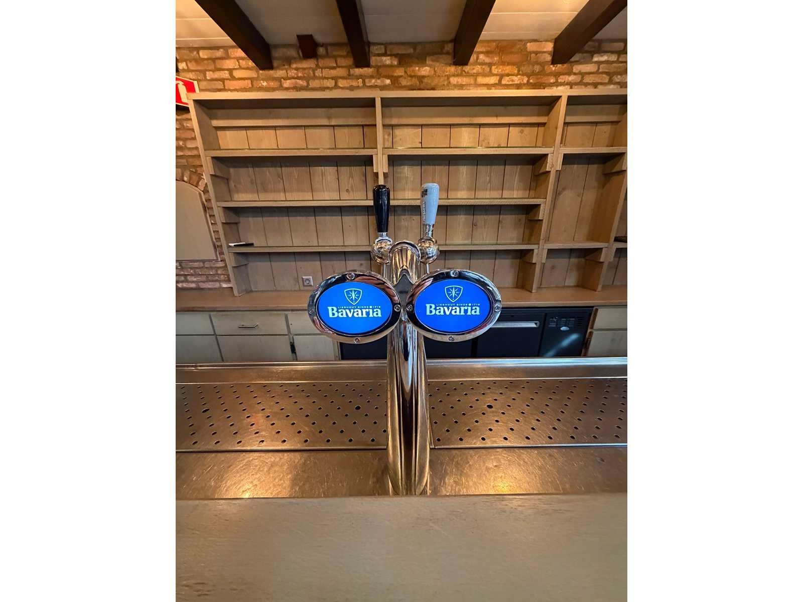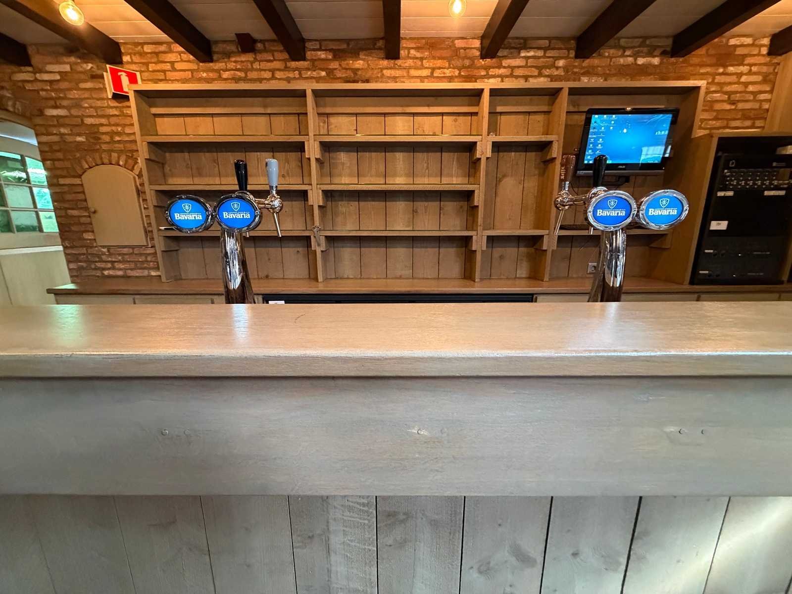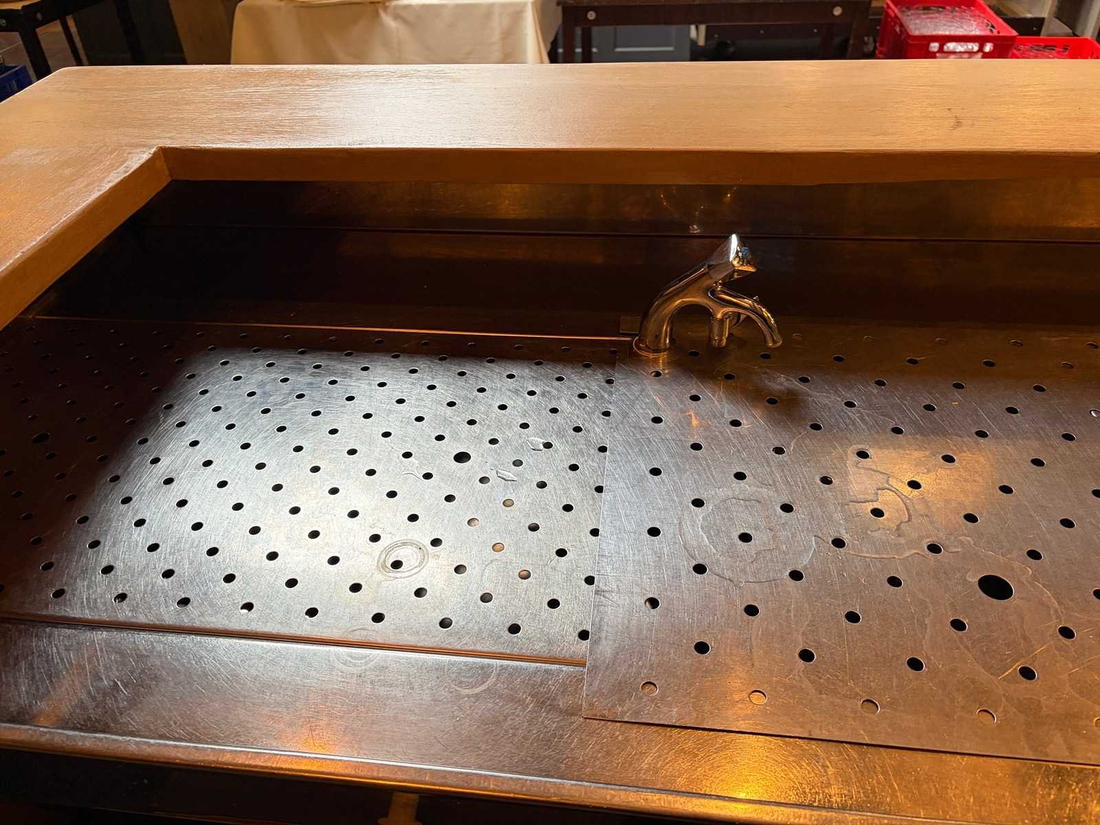 Compleet barmeubel met 2 dubbele tapkranen, achterwand, lekblad, spoelbak, etc.