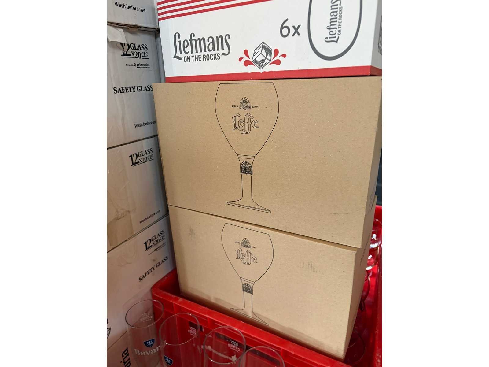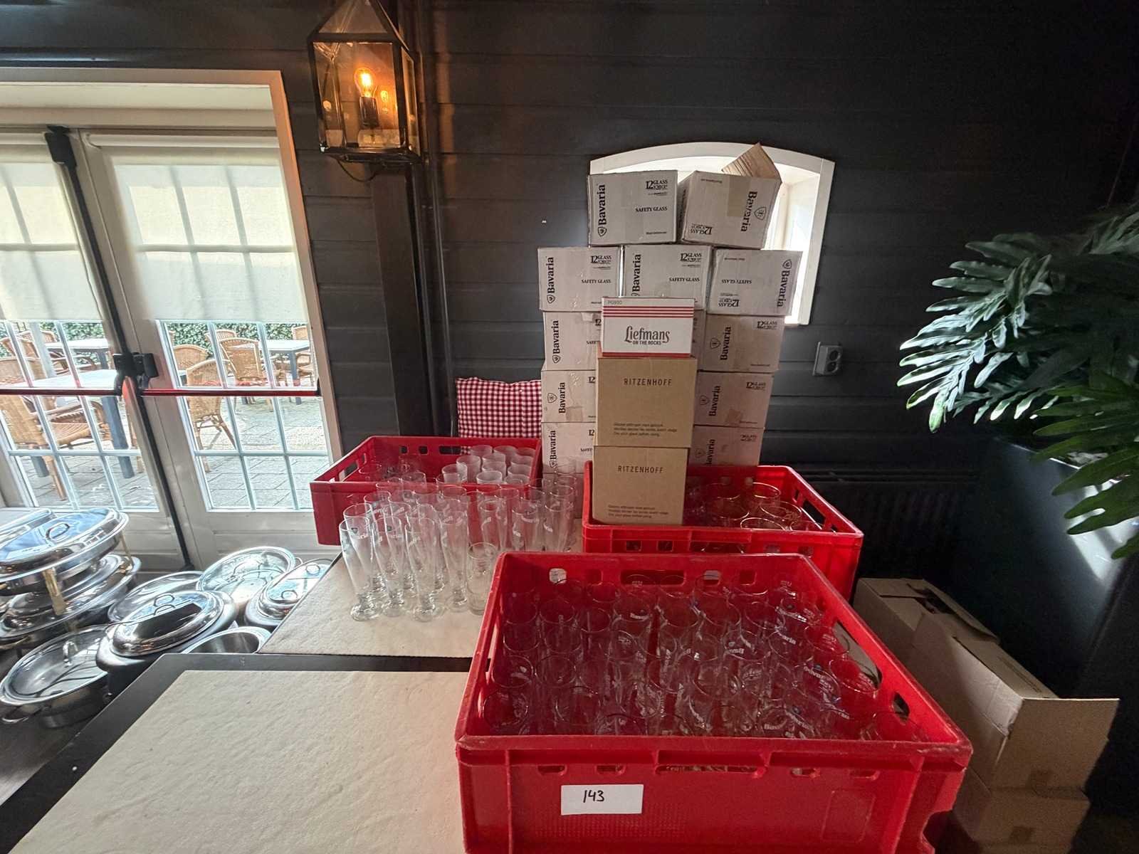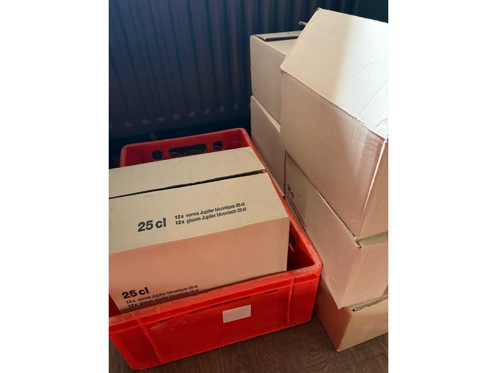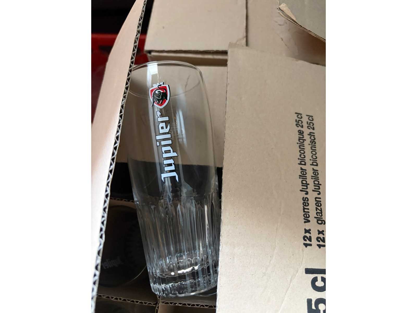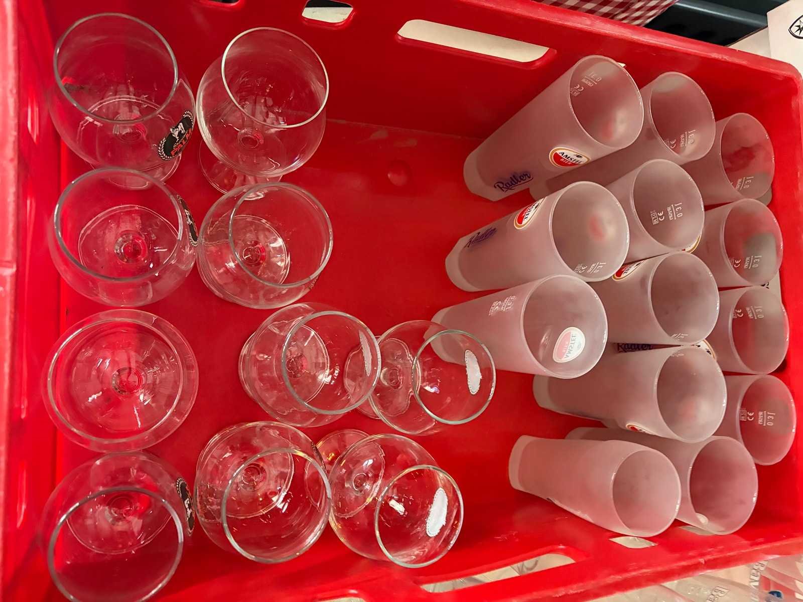 Total 9 kunststof kratten en 27 dozen met glaswerk. Onder andere Bavaria glazen, Hertog-Jan, Liefmans, Jupiler glazen en LaTrappe glazen.